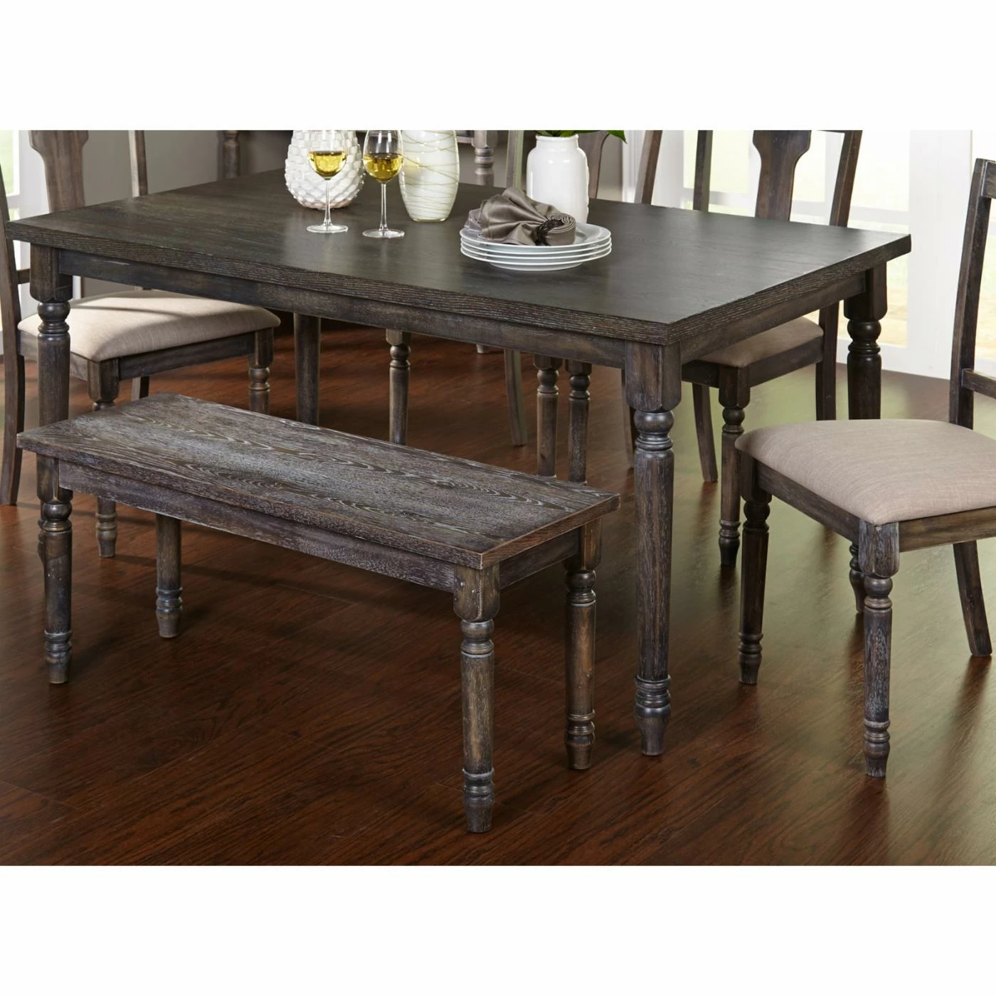 Try the Burntwood Bench for a slick new take on dinner seating! Rustic gray wash over cool engineered wood lends a light appearance to your dining room, as well as the matching Burntwood Dining Table. Details like the tulip turned legs and the natural wood grain make this piece right at home in your thoughtfully decorated abode. Seats two.