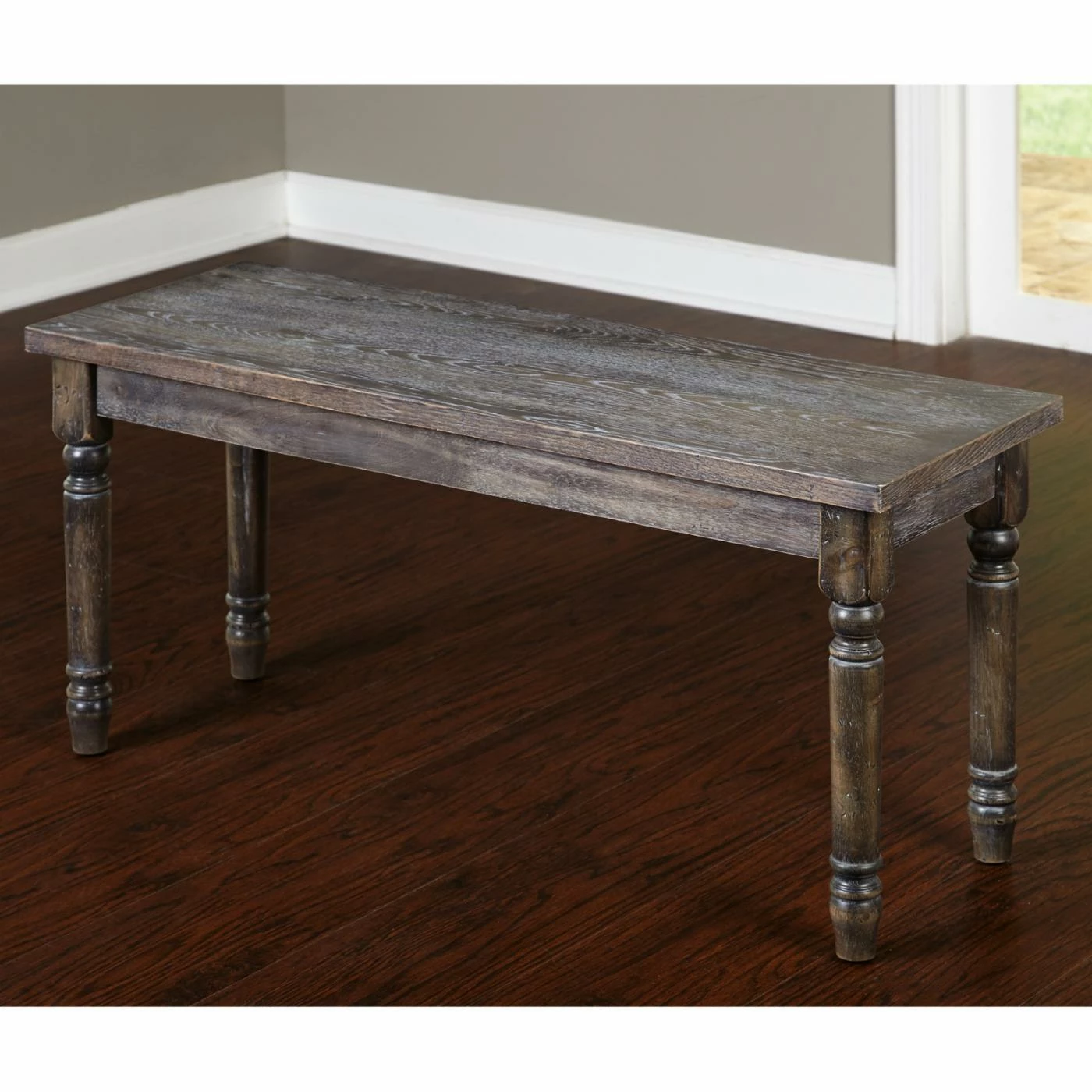 - Weathered gray wash over umber wood