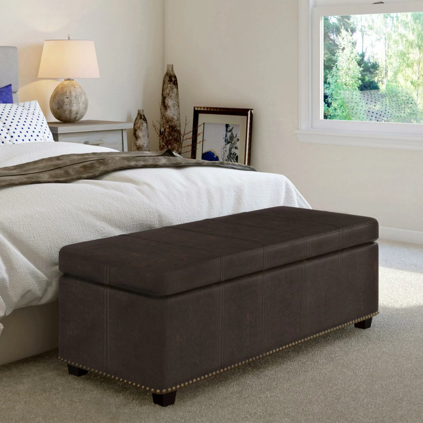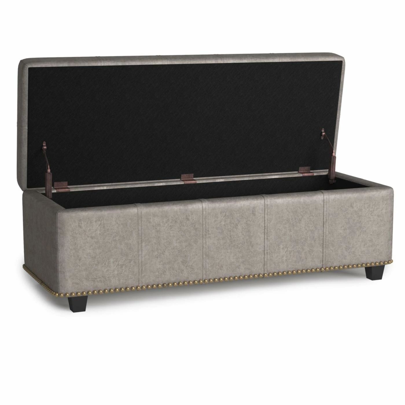 - Nail head trim on base of bench