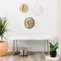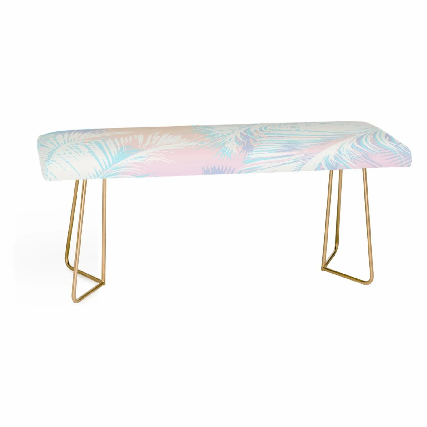 Overscaled palm leaves in a pastel palette give the Deny Designs Iveta Abolina California Dreams Bench its chic vibe. The original design from artist Iveta Abolina is printed onto the faux leather seat of this bench. Sleek metal legs in a gold tone lend a glam feel. Delight in the versatility of this bench that you can use in the entryway, foot of your bed, or at the dinner table. It’s custom-built in Colorado.