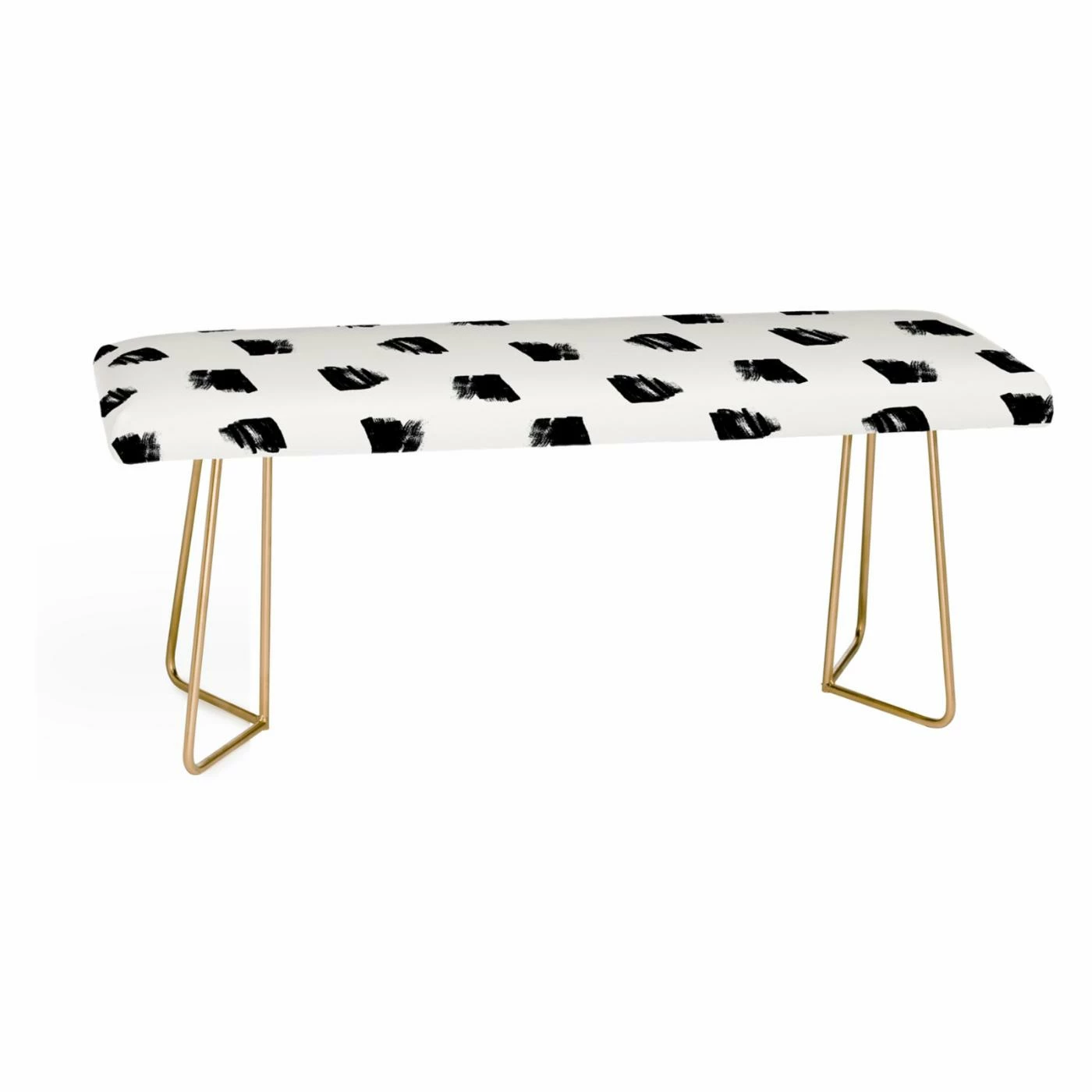 The faux leather seat on your Deny Designs Kelly Haines Messy Dots Bench is printed with bold black and white art by Kelly Haines. Gold toned metal legs are sleek and glamorous. Use this versatile bench around the dinner table, at the foot of your bed, or in the entryway. It’s custom-built in Colorado.