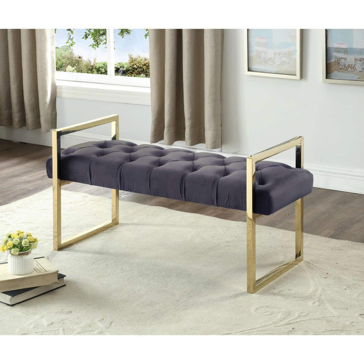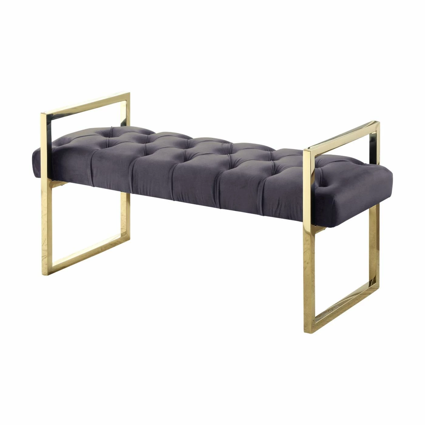 Whether you’re looking to accent your contemporary dΓ©cor with updated elegance or simply add some extra seating to your space, the Hi-Line Gift Ltd. Button-Tufted Velvet Upholstered Bench has got you covered. Luxuriously soft velvet material covers a cushiony, padded bench seat in a sophisticated, button-tufted design. Rectangular end pieces deliver a lustrous gold complement to this modern piece. With your choice of available color options, it’s easy to coordinate this seat with your current home aesthetic. A stainless steel construction ensures endlessly comfy sits for years to come.