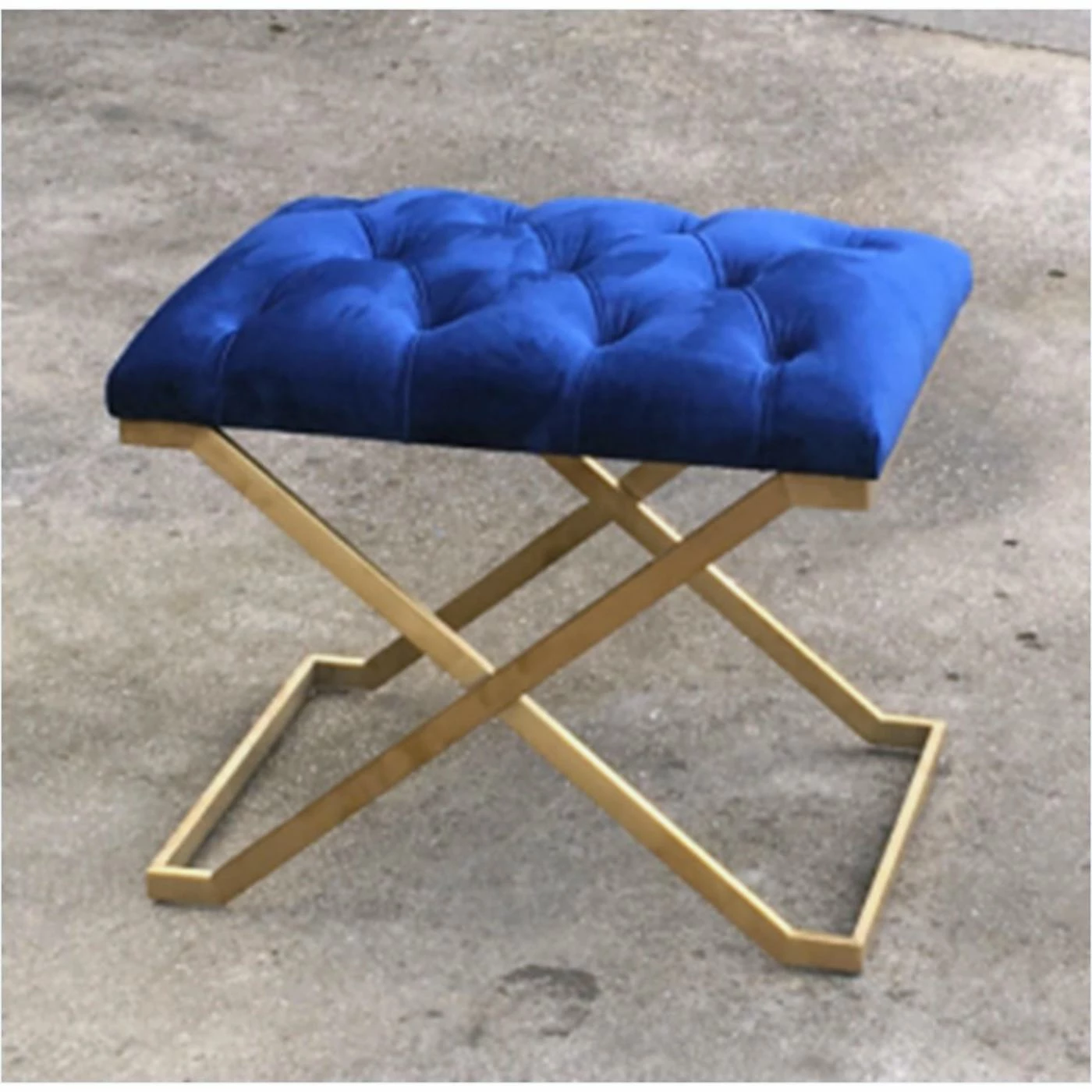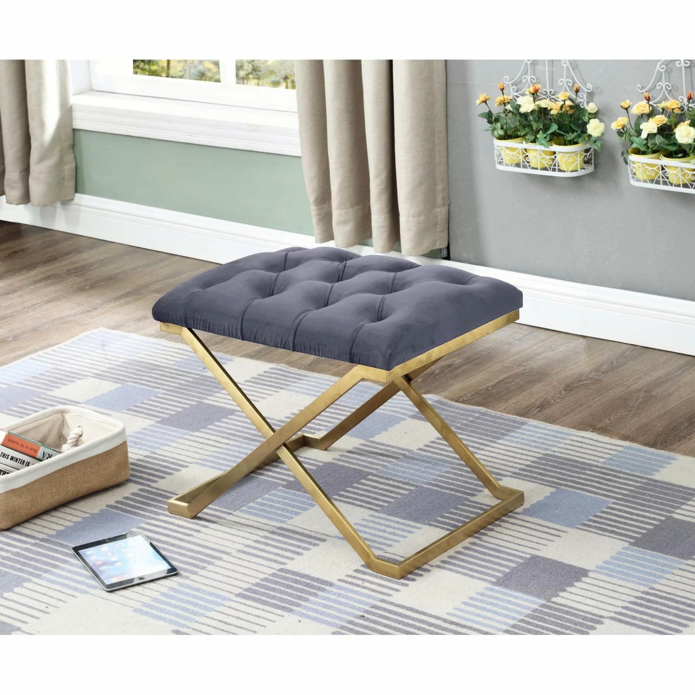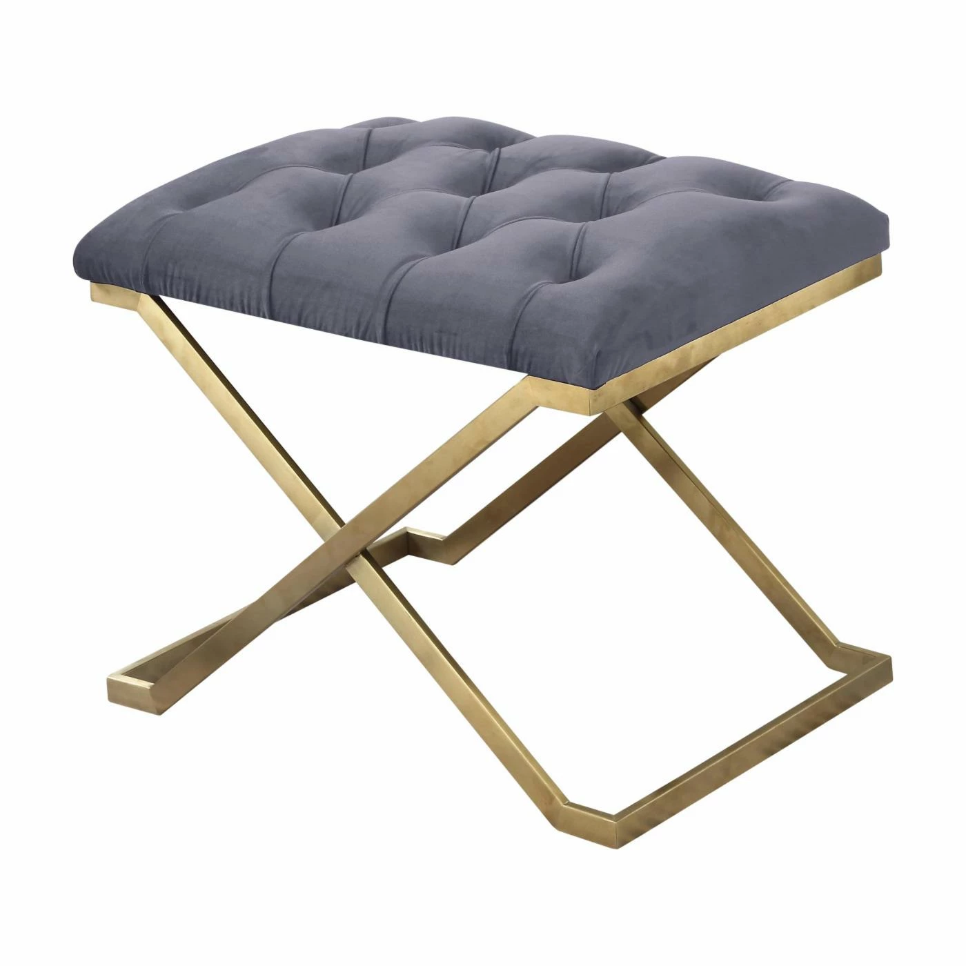 Add a touch of contemporary elegance to your living room or bedroom with the Hi-Line Gift Ltd. Button-Tufted X-Base Chair. This comfy seat packs an abundance of bold, contemporary flavor in one compact design. Whether you’re looking for a soft place to set your books or extra seating for your entertaining space, this ultra-soft velvet seat has got you covered. A stainless steel frame in a matte gold finish provides plenty of support in a modern, x-shaped construction. Button-tufted details deliver the finishing touch to this chair, which is offered in your choice of available hues.