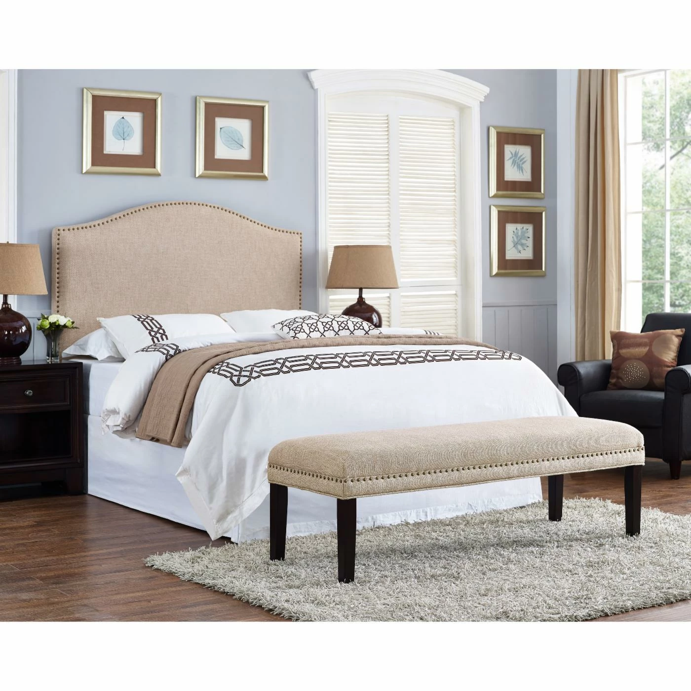 For a simple addition to transform your bedroom dΓ©cor, look no further than the Home Meridian Upholstered Bed Bench – Tan. This long, elegant bed bench features four long, tapered legs for support, each made from solid wood. The rest of the frame is made from lightweight, durable plywood panels. Thick foam padding provides cushioning to the seat, upholstered in 100% polyester fabric (a fine neutral tan color). Antique-brass finished nailheads accents the border of the seat.
