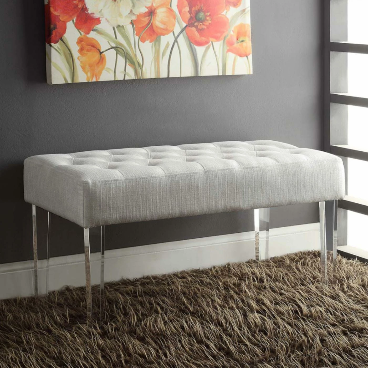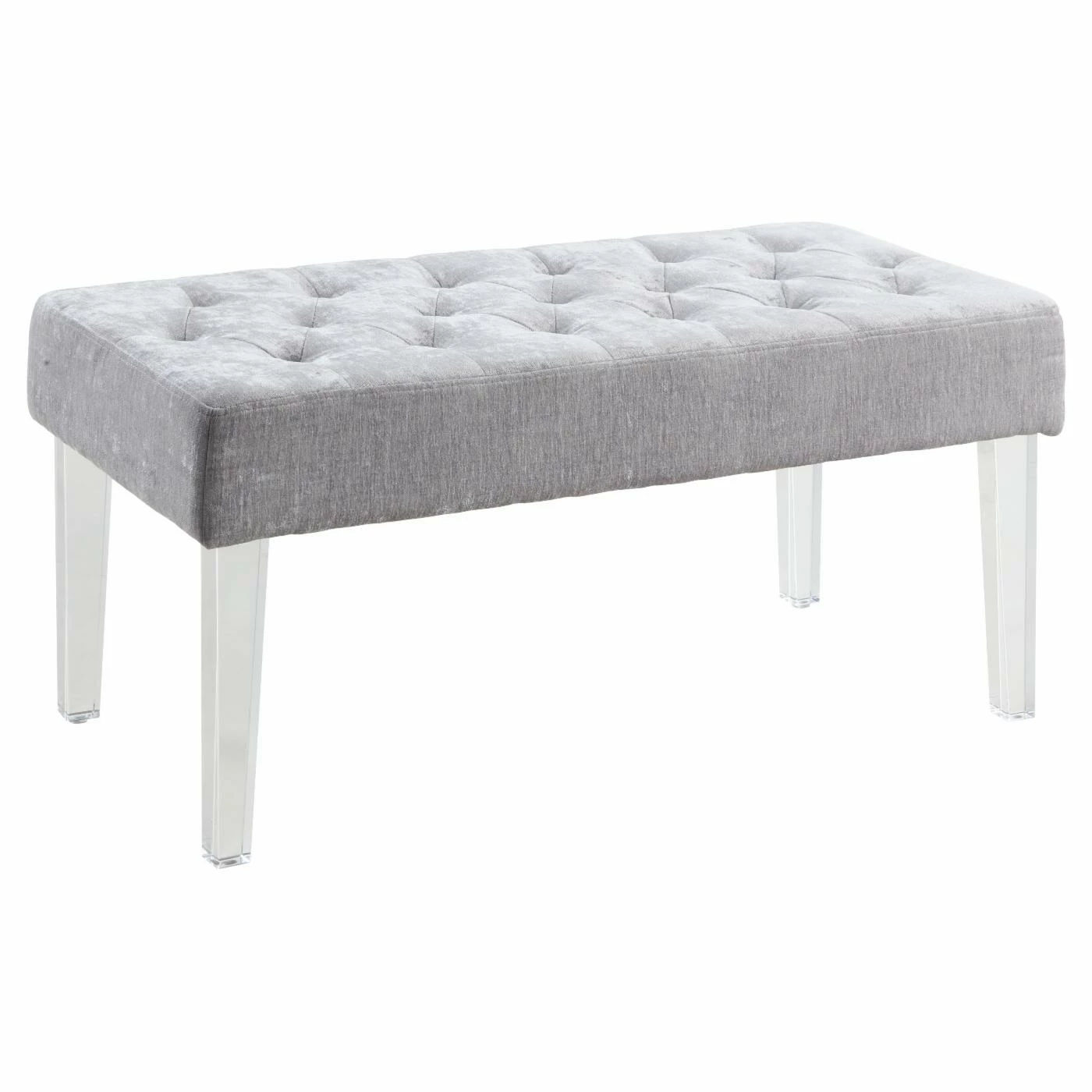 Clear acrylic furniture is a hallmark of modern design, which makes this Linon Ella Bench the perfect way to ease into that look. This bench blends classic textured fabric upholstery and smart button tufted details with tapered clear acrylic legs to make its statement. Not too modern, but definitely designed to impress.