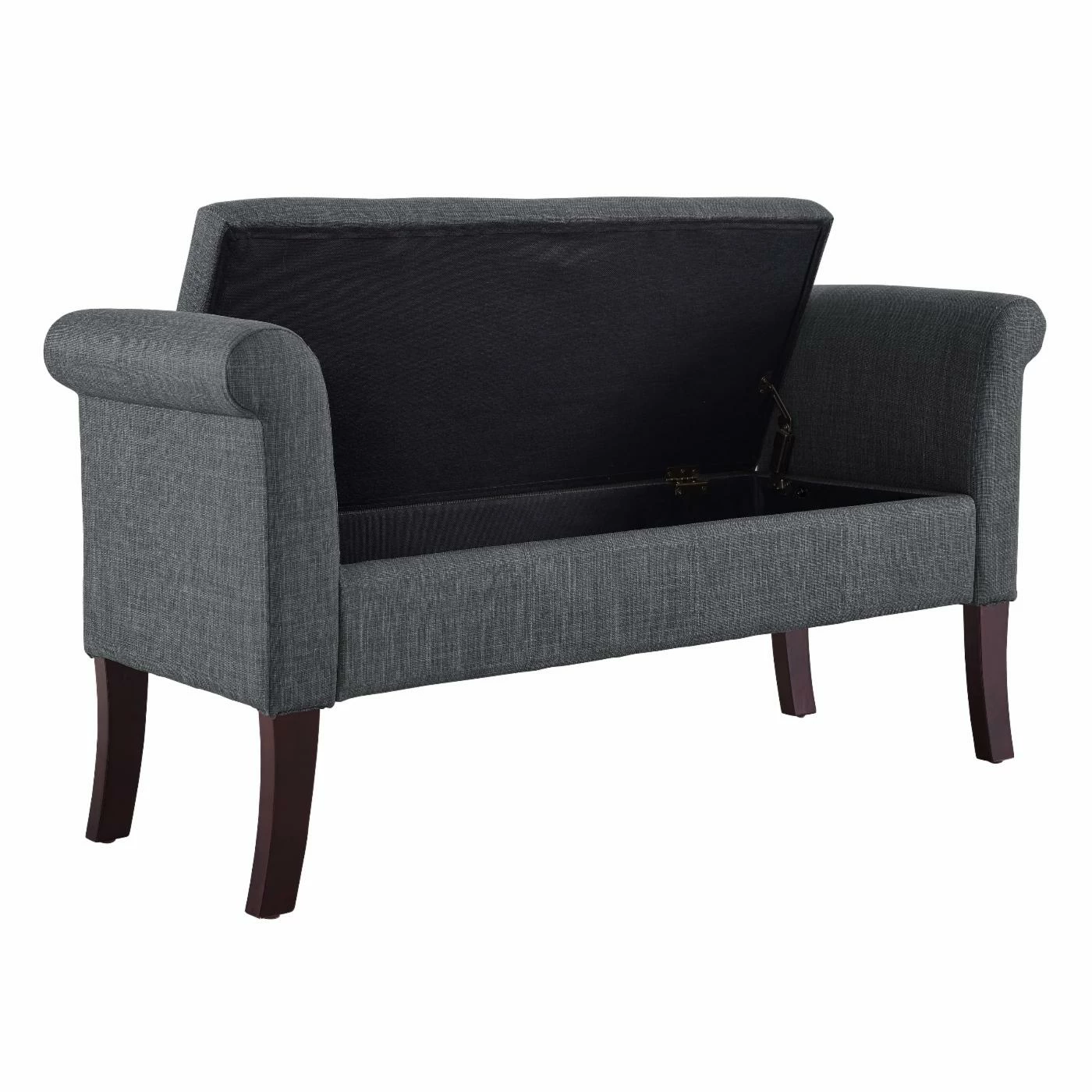 Add extra seating and storage space to your bedroom, entryway, or living room with the Linon Indie Indoor Storage Bench. Featuring a seat that opens to reveal a storage area, this bench is perfect for keeping magazines, small blankets, and even electronics out of sight. Its rolled arms and button tufting create a sophisticated, classic look that complements any decor. Made to last, its durable eucalyptus and rubber wood frame ensures youβll have this bench for years. Choose from available fabric colors/finishes to find the perfect look for your home.