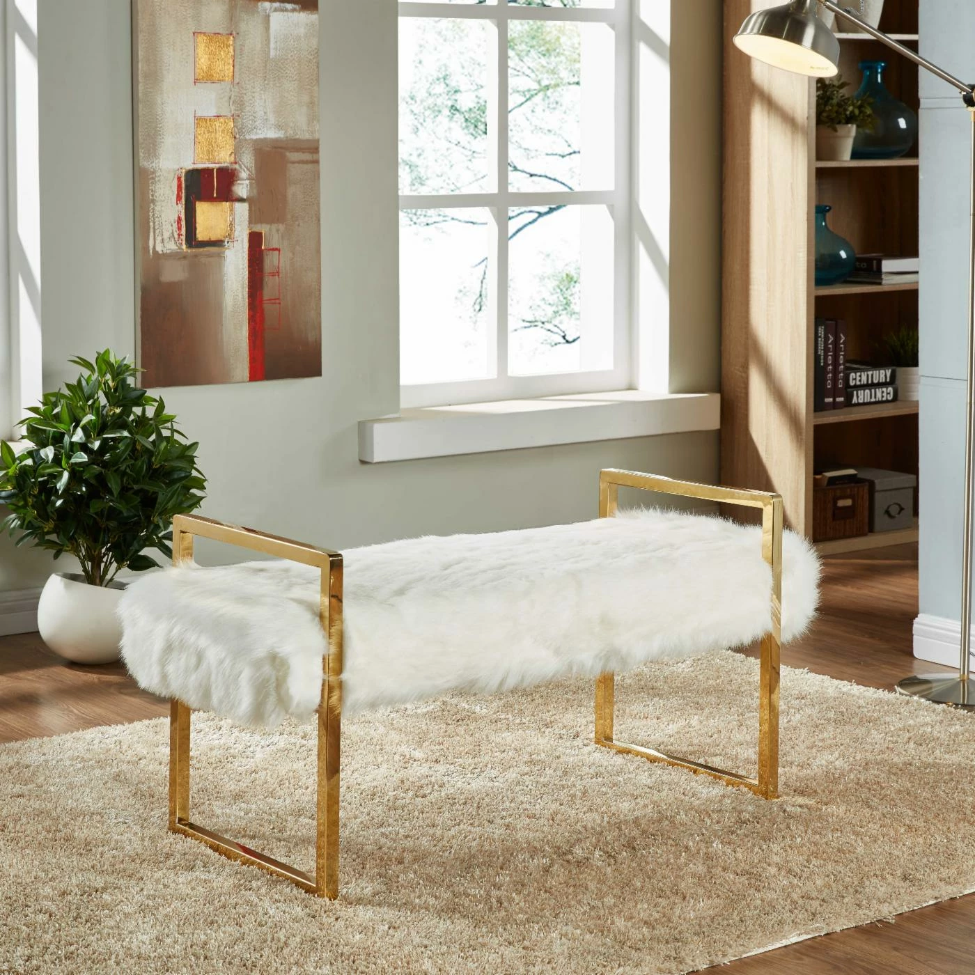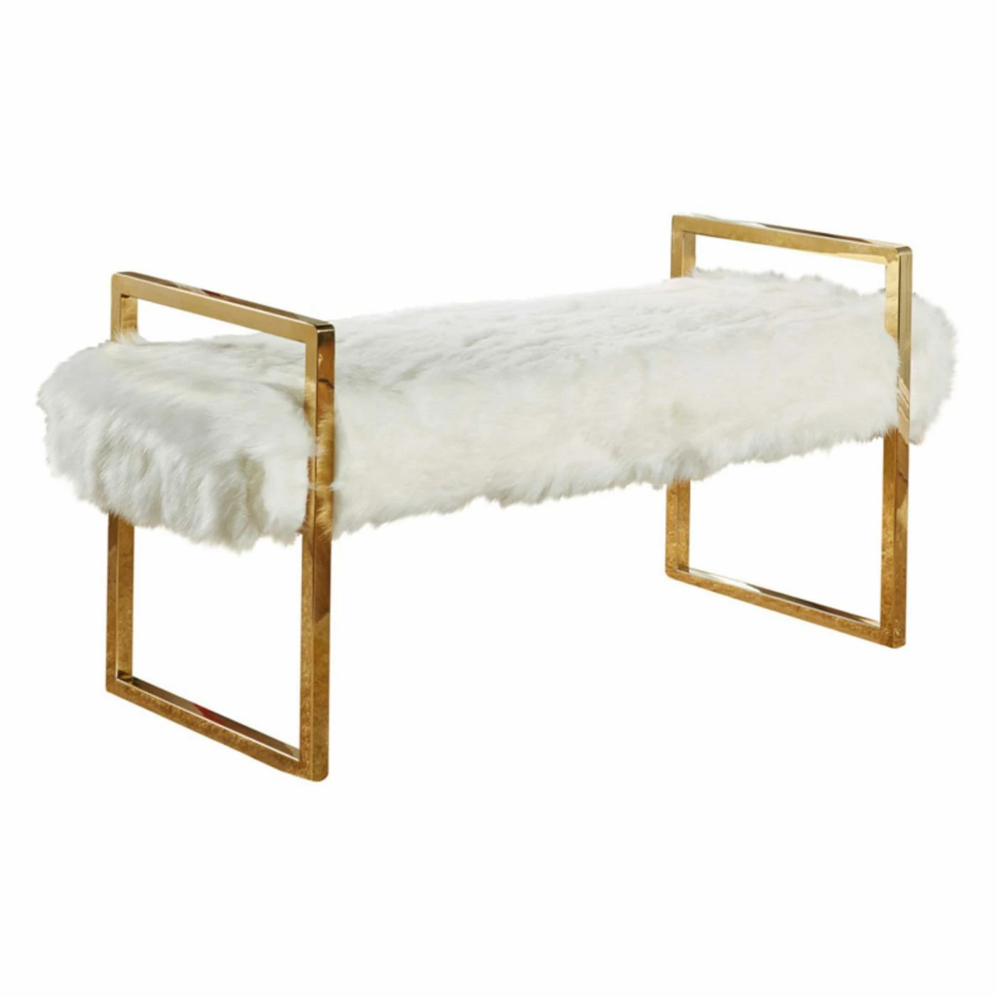 Make a glam statement by styling the Meridian Furniture Inc Chloe White Faux Fur Bench at the foot of your bed or in the entryway. Jewelry-inspired stainless steel rectangles are finished in gleaming gold and provide visual drama and support for this bench. Plush faux fur in bright white makes it ultra mod.
