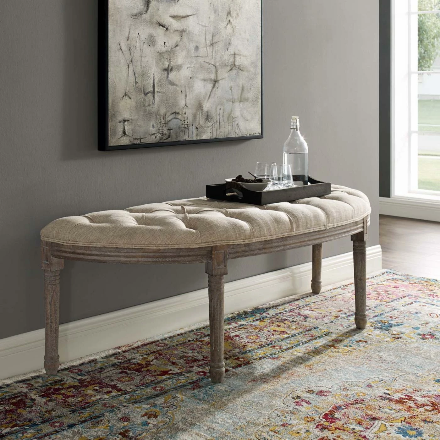 Button-tufting in the Modway Esteem Vintage French Upholstered Fabric Semi-Circle Bench‘s foam padded seat adds an elegant detail to the overall design. The demilune shape allows this bench to fit snuggly against a wall which would be perfect for your entryway or front room beneath a mirror or shelf. This bench is constructed from rubberwood in a weathered gray finish. The seat is upholstered with polyester fabric in your choice of available color.