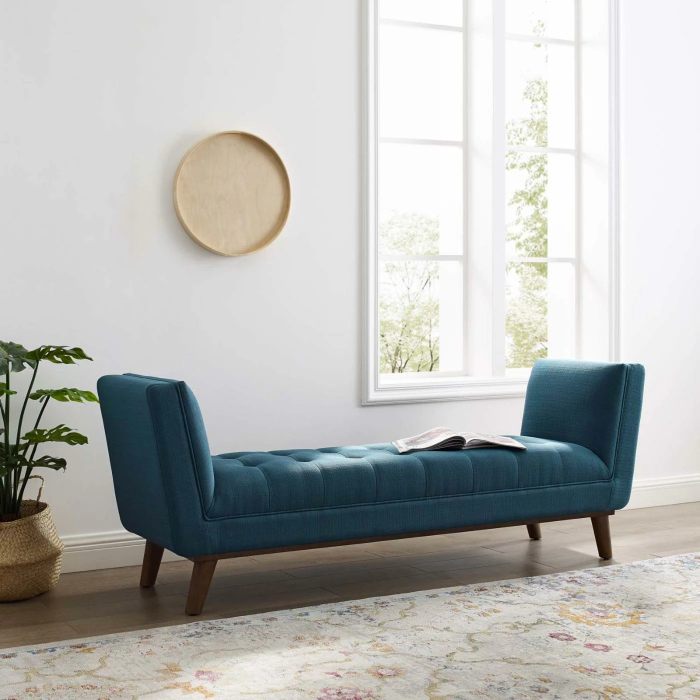 Mid-century modern style meets the contemporary present with the Modway Haven Tufted Button Upholstered Fabric Accent Bench. The splayed legs are finished in a weathered gray. You’ll choose from the available upholstery colors to find the best option for your home. This accent bench is constructed with a rubberwood and plywood frame with stain-resistant polyester fabric upholstery. The tall arms on either side provide a spot for you to lean against and put your feet up.