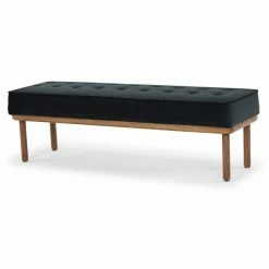 Use the versatile Nuevo Arlo Indoor Occasional Bench at your dining room table, the end of your bed, or in the living room. Its updated design includes a thick foam cushioned seat that offers room for two or more people. Designer details include welted trim and button tufting. This bench sits on a wood base with post legs in walnut. Customize by choosing from available upholstery colors.