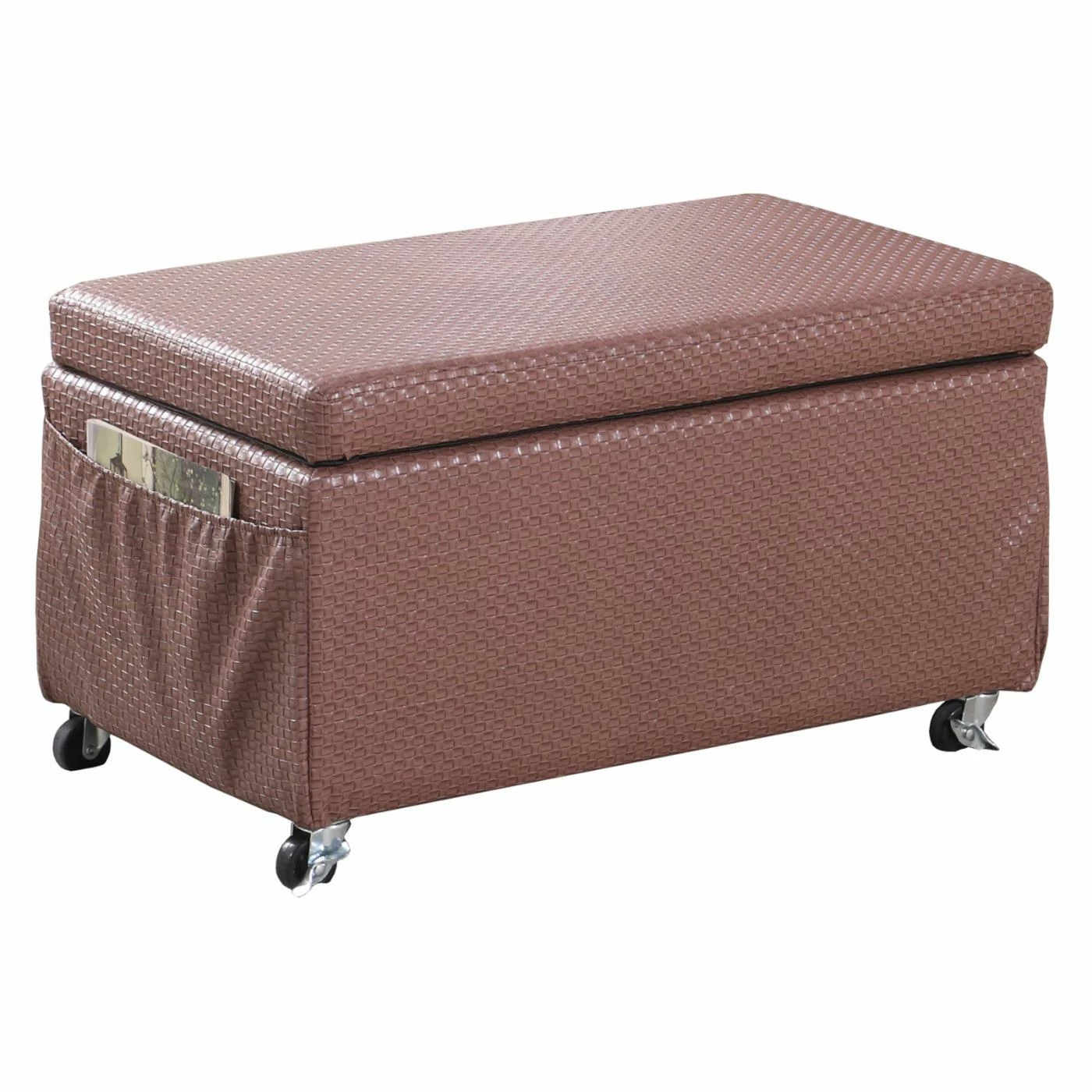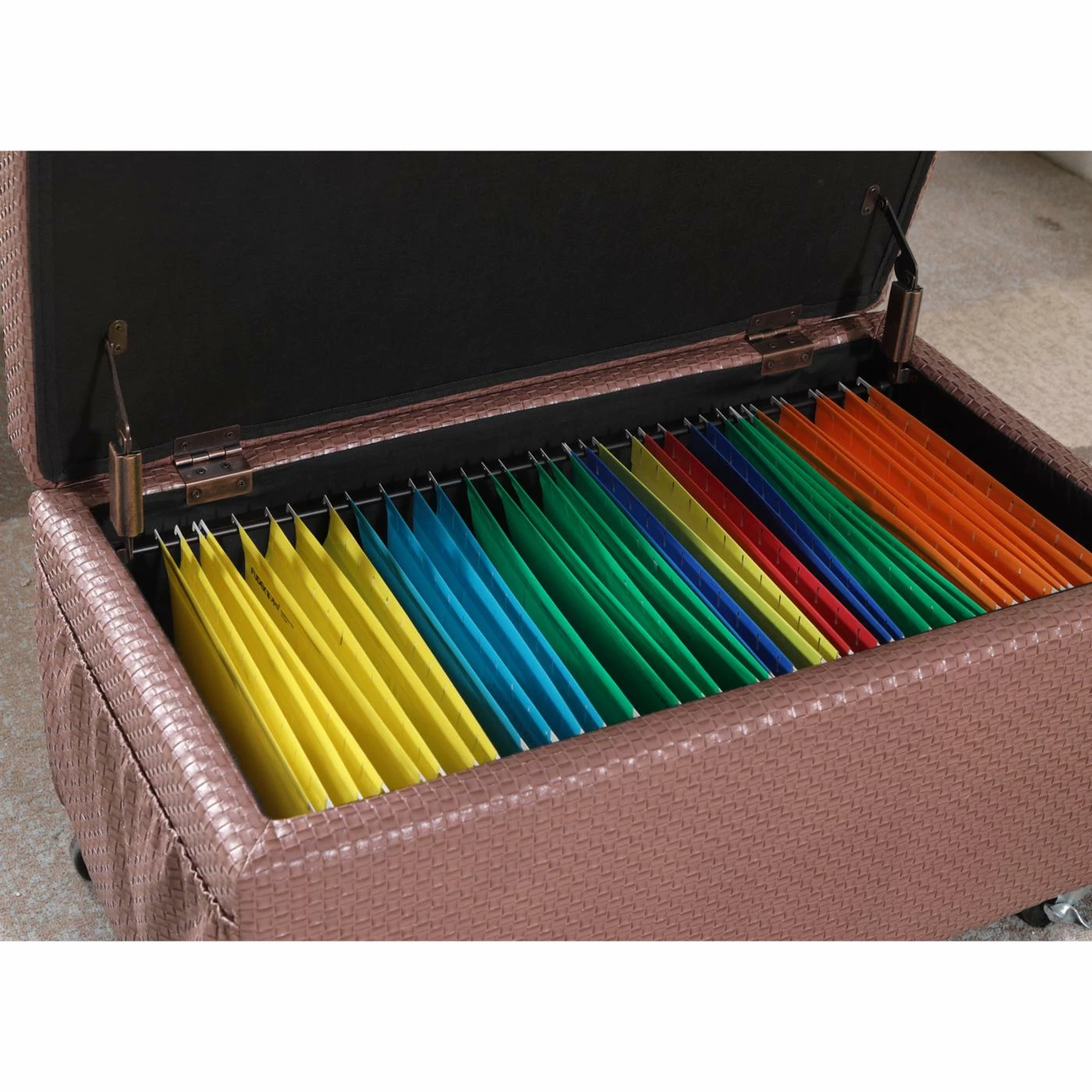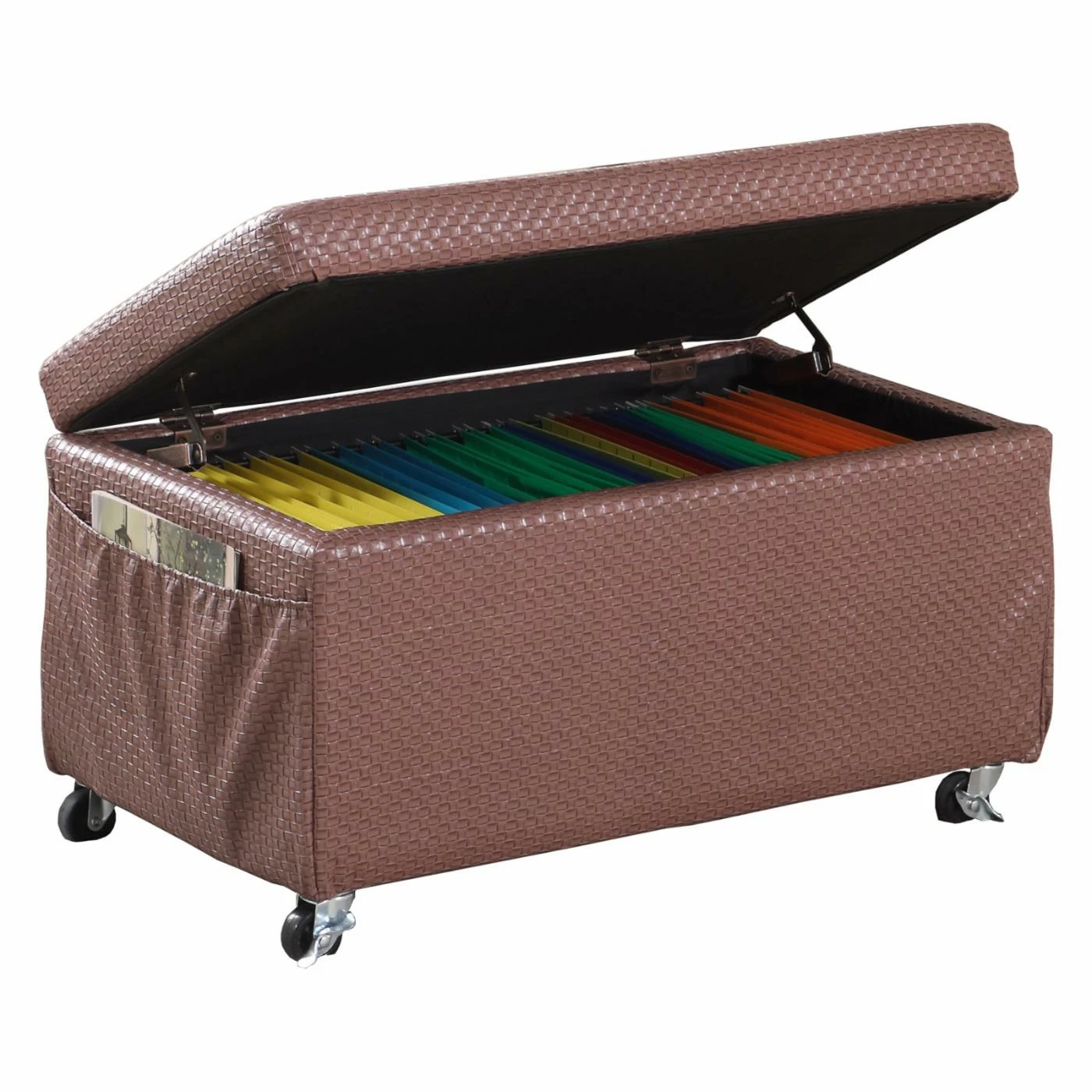 Store your files in luxurious style with the Ore International Auburn Brown Basketweave Leatherette Storage Bench. Upholstered in leatherette with an auburn brown basketweave pattern, this ottoman is a stunning addition to your home office or living room. The top opens to reveal two file bars to hold your letter-sized files, or you can use the space to hold blankets and pillows. Two side pockets give you the perfect spot for remotes and devices so they’ll never get lost. Caster wheels make it easy to maneuver the bench around any room.