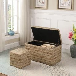Keep your living room stylish and organized with the Ore International Beige Leatherette Wood Pattern Storage Bench. Perfect for anyone who loves to entertain, this bench opens to reveal a hidden compartment with a tray for serving drinks and appetizers, as well as a small stool for extra seating. Beige, multi-colored leatherette upholstery over a durable wood frame gives this bench a sophisticated air that elevates the style of any room.