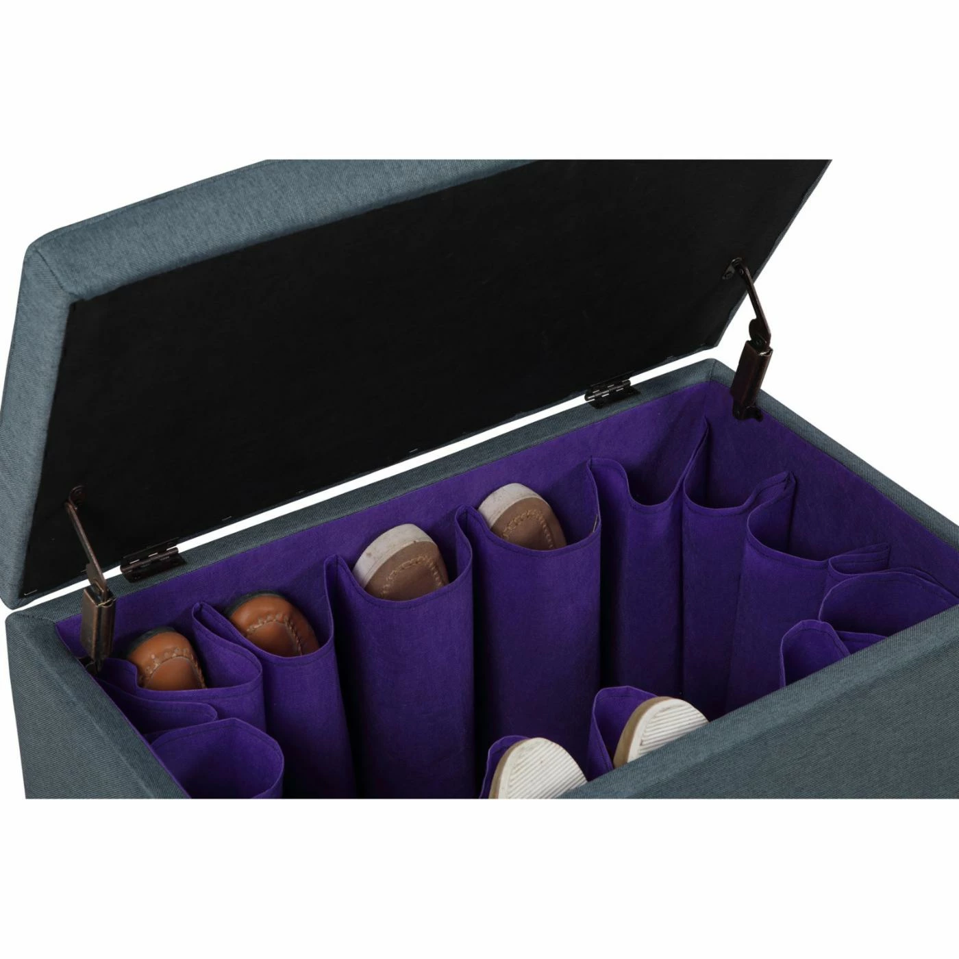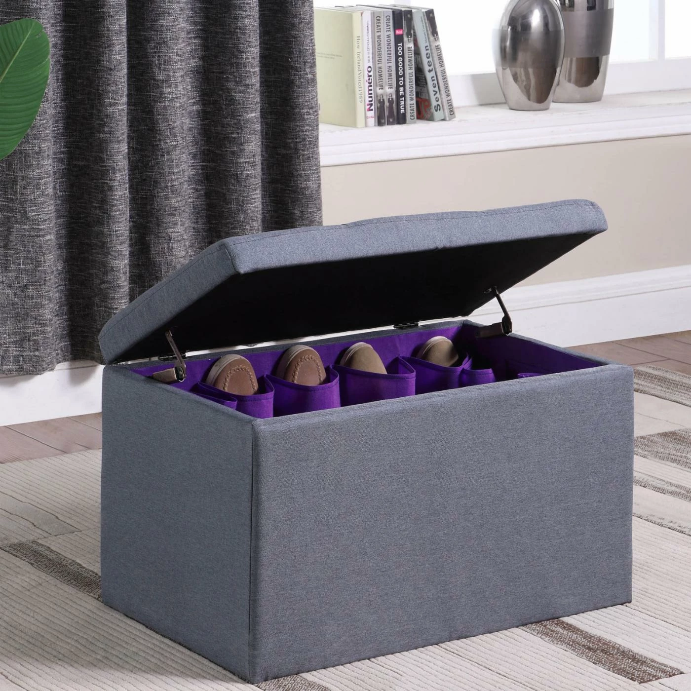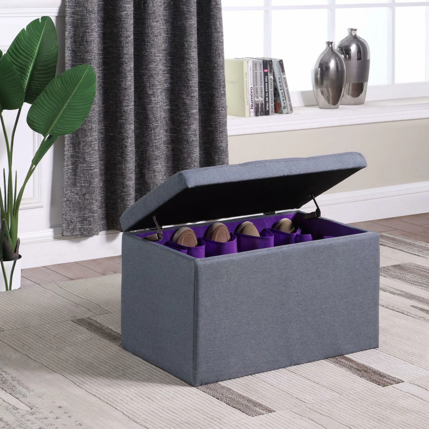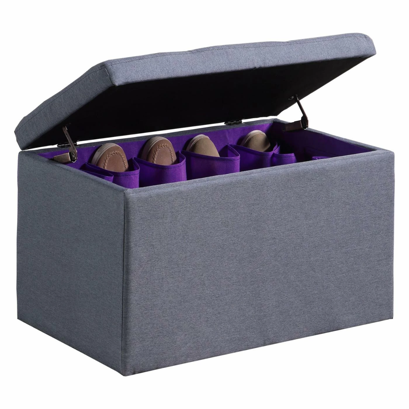 Organize your shoes and accessories while adding comfortable seating to your bedroom with the Ore International Dove Gray Shoe Storage Bench. Great for resting your feet or sitting on while getting ready in the morning, this storage bench is the perfect combination of transitional style and functionality. Inside youโll find 16 individual slots to hold up to eight pairs of shoes, as well as additional space for your purses, belts, and other accessories. Designed to complement any home, the dove gray, linen blend upholstery blends seamlessly with your current color scheme.