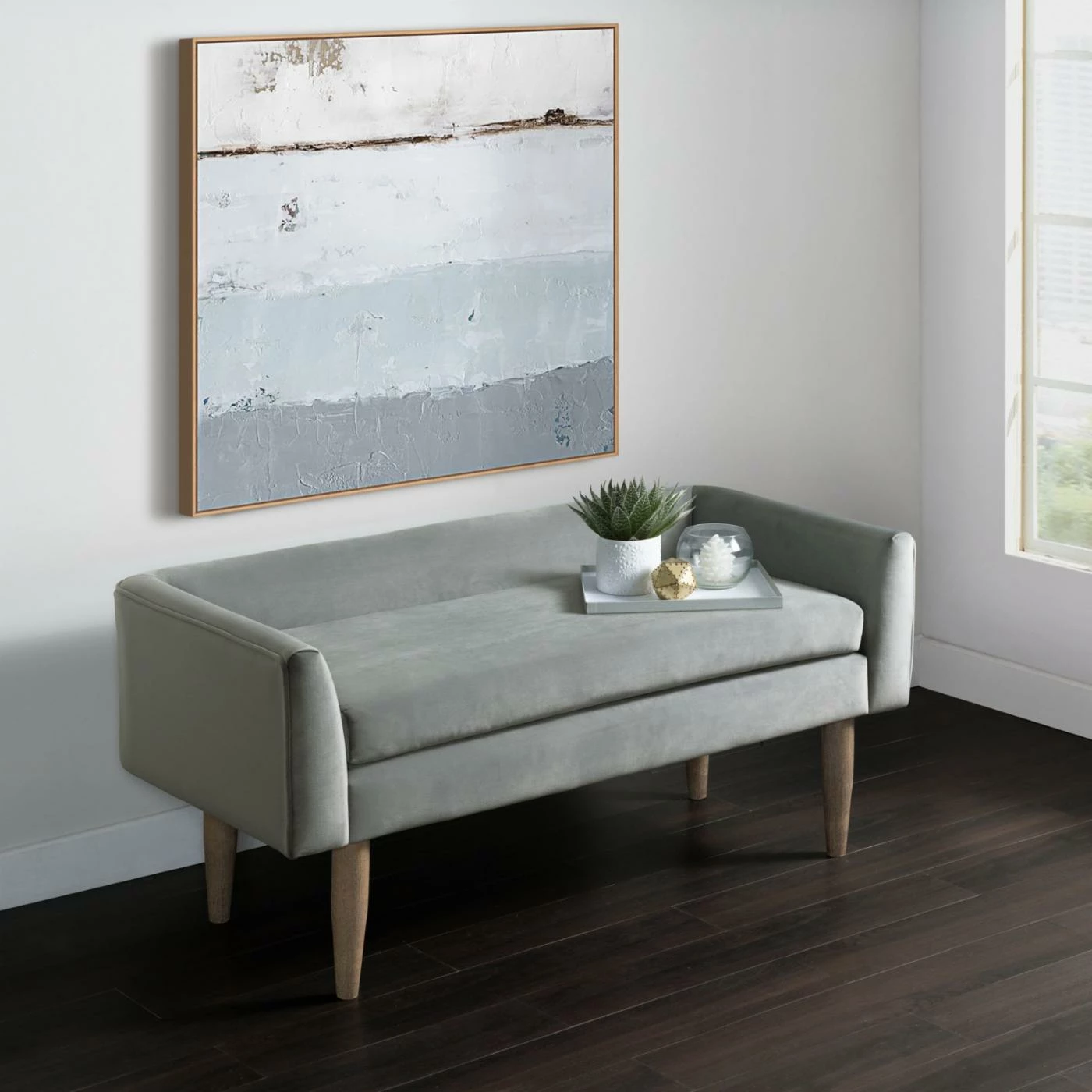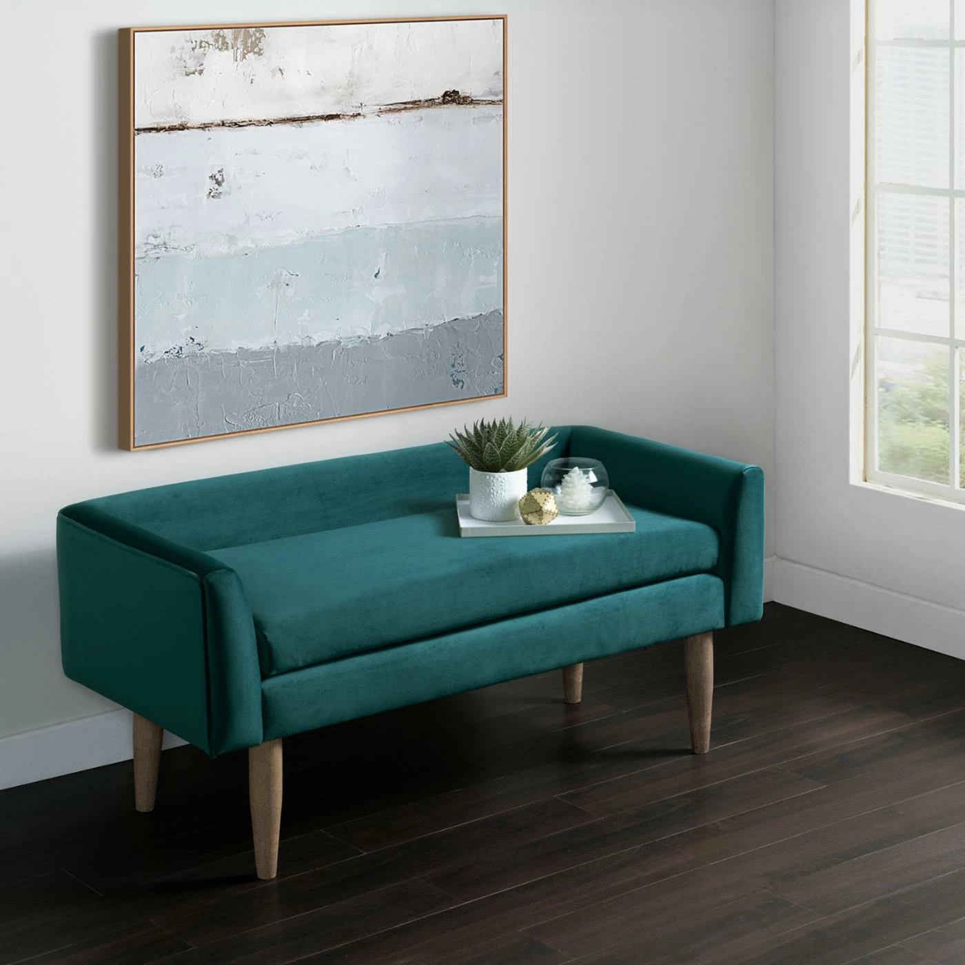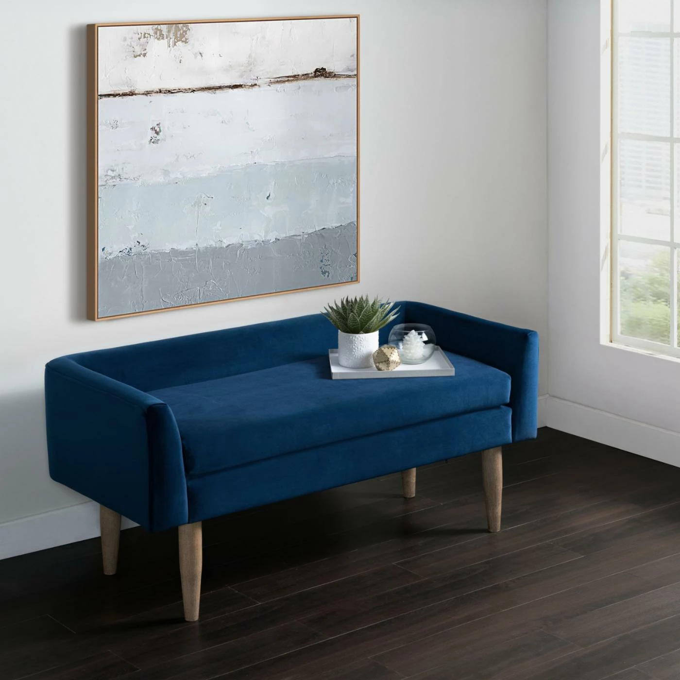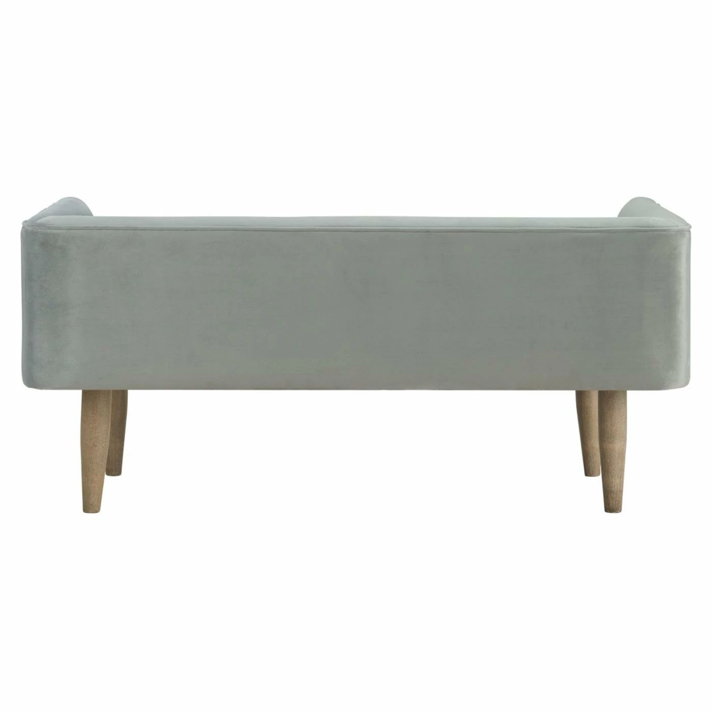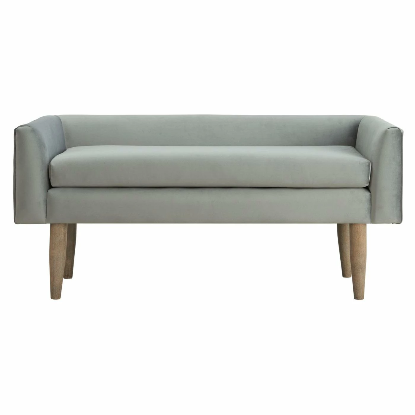Mid-century modern style arrives to one of your favorite rooms with the Picket House Furnishings Bella Velvet Bedroom Bench. Take a seat on the foam padded seat and lean back against the small back and arms before you get ready for bed. This bedroom bench has an engineered wood and steel frame with a polyester upholstery in your choice of available color. The round and tapered legs have a whitewash finish that completes the design.
