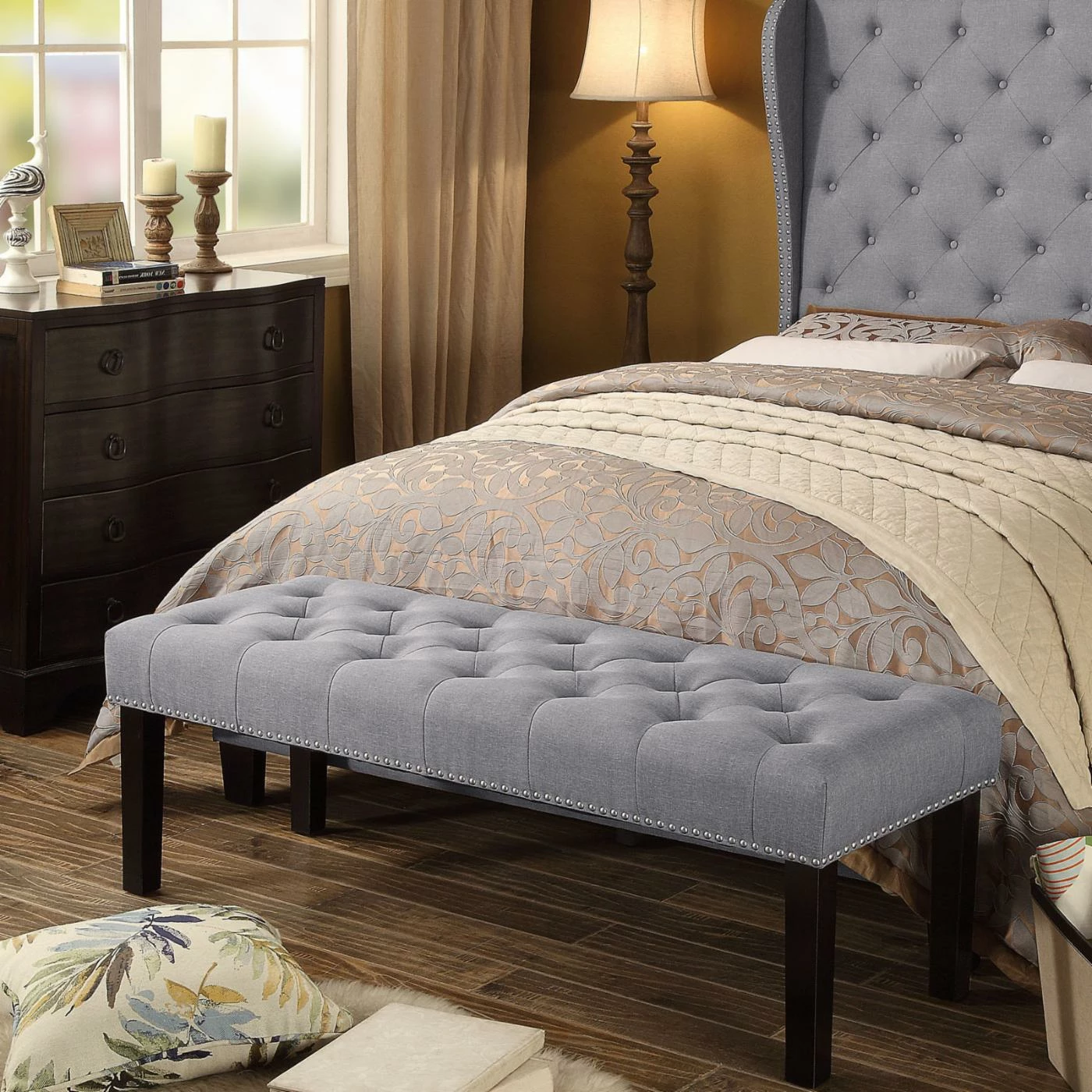 The Rosevera Ercole Upholstered Tufted Bench is an elegant, transitional addition to your space. Add this bench to the end of your bed as functional piece in lieu of a footboard, or slide against a wall in your entryway for an inviting place to sit and remove shoes. Details like nailhead trim and button tufting on the seat add a subtly traditional feel while solid rubberwood legs in dark espresso keep the look contemporary. The linen upholstery comes in your choice of available color. Foam padding, web suspension, and S springs provide support and comfort. Choose from available sizes.