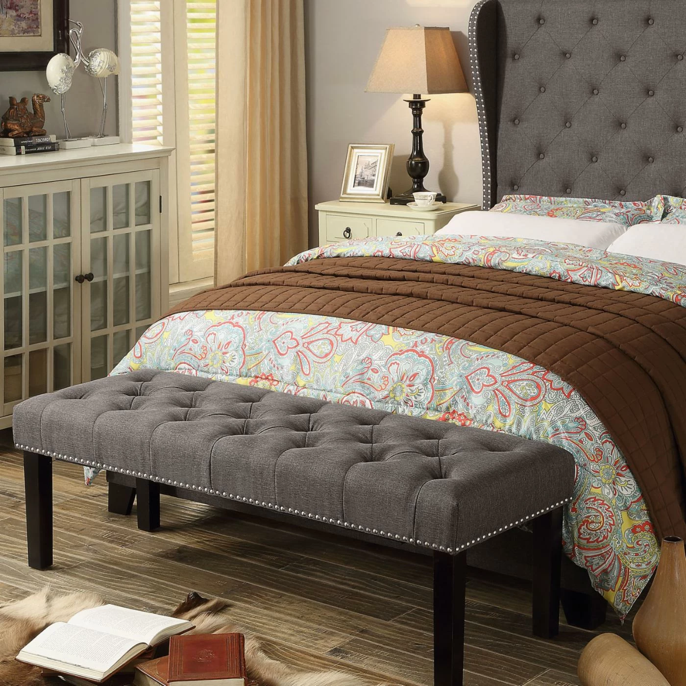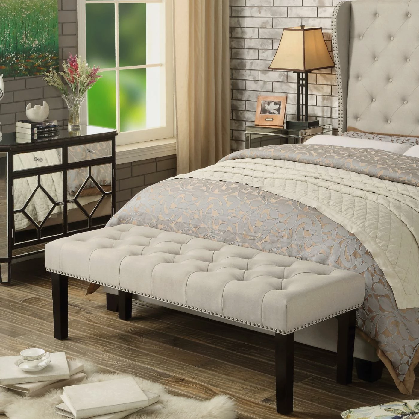 - Nailhead trim around bottom edge