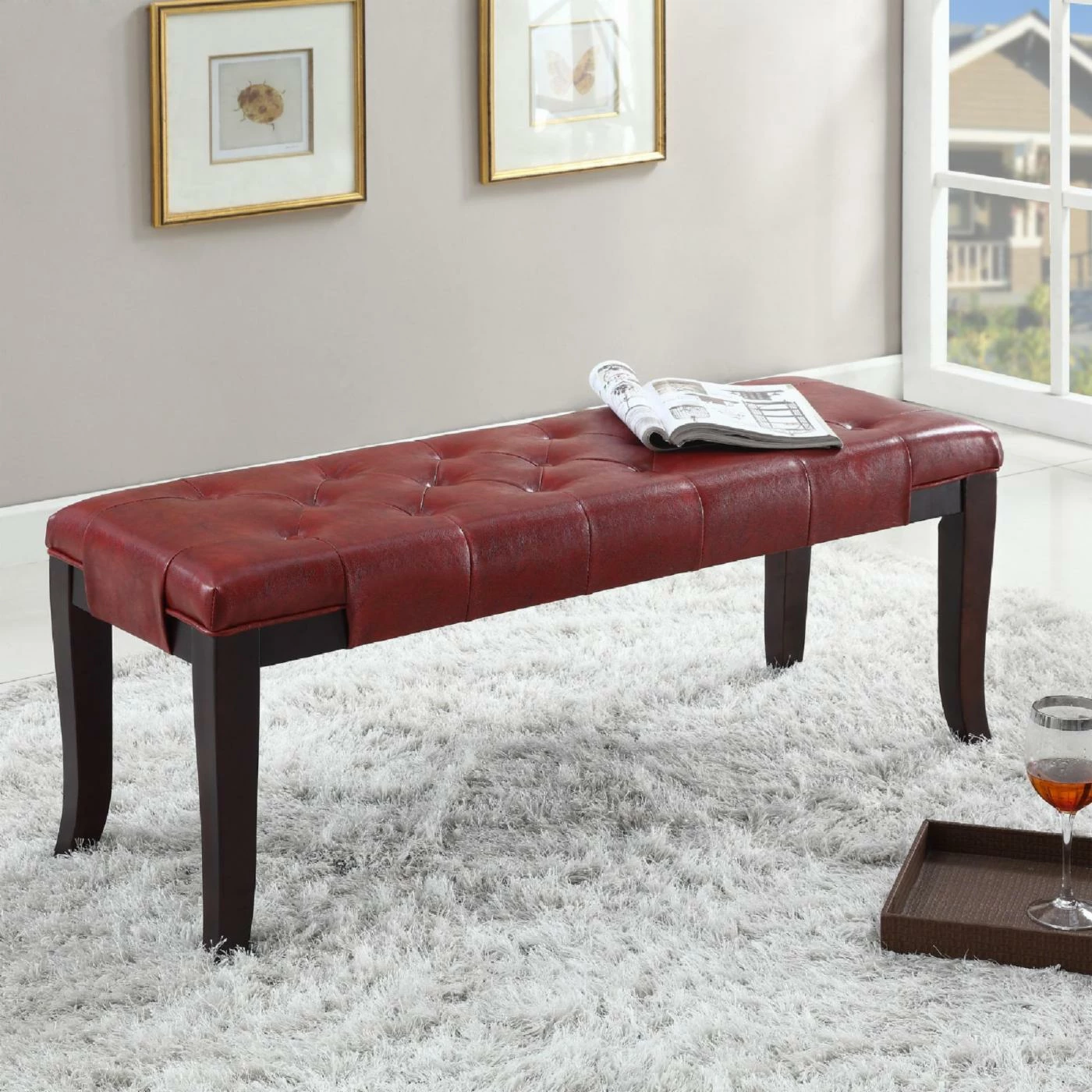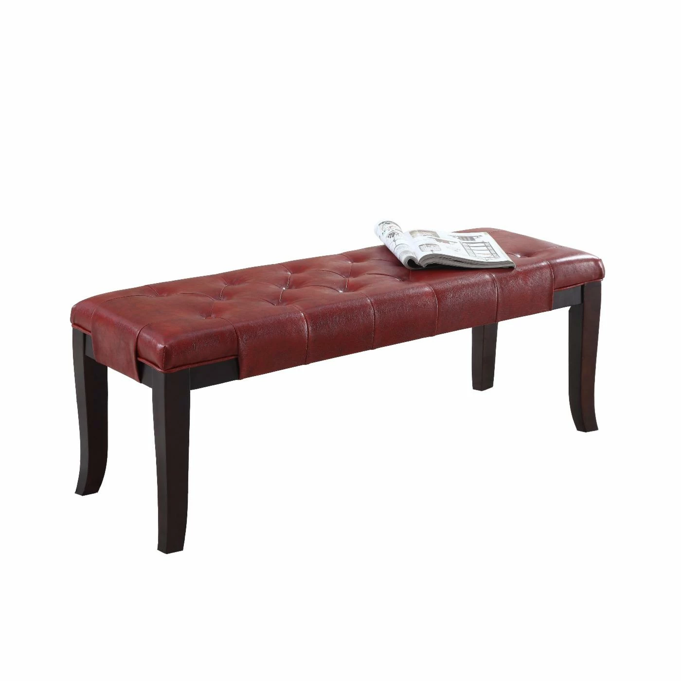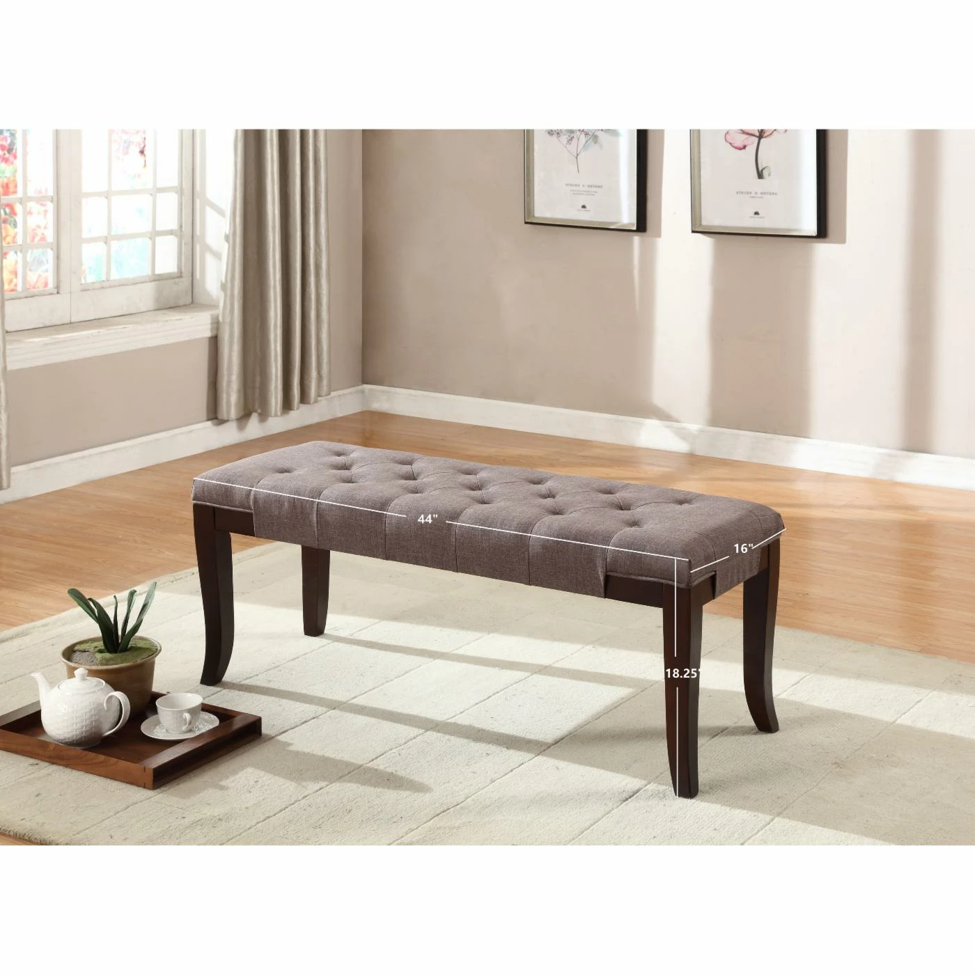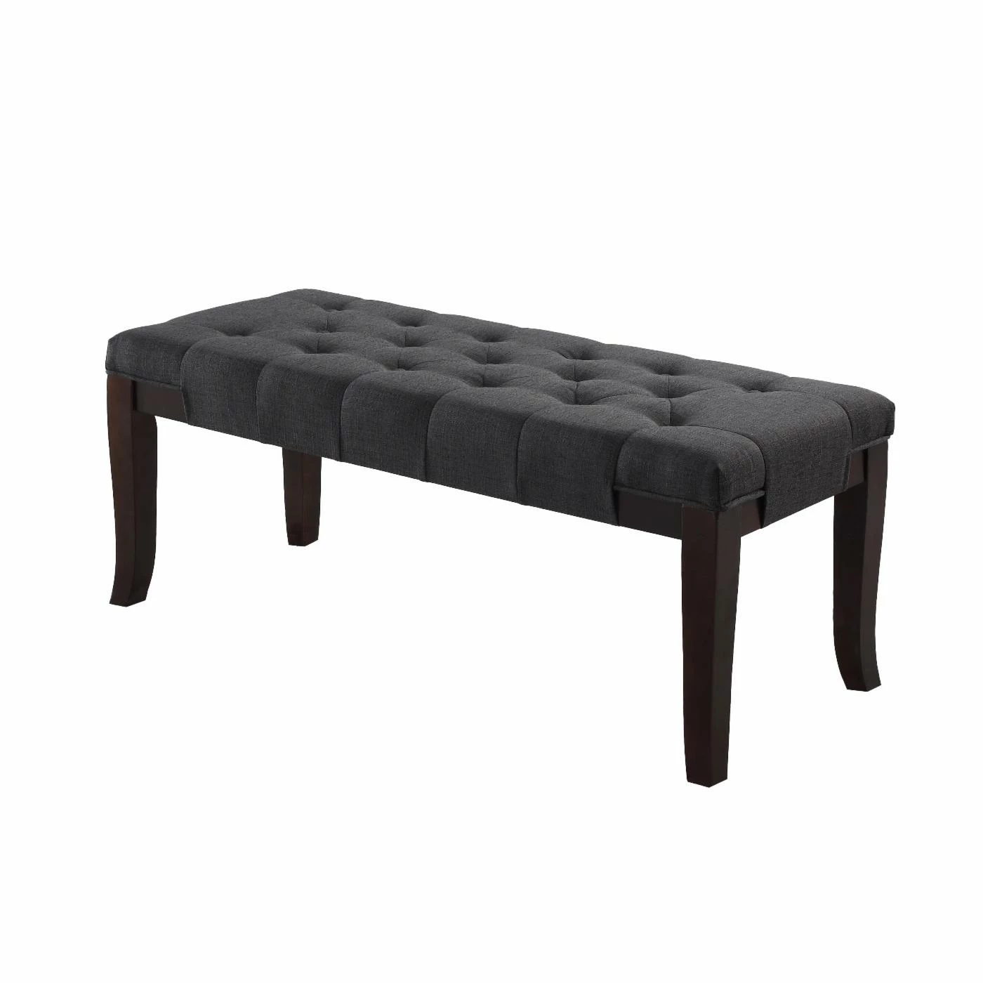 The Roundhill Furniture Linon Cotton Tufted Ottoman Bench is the perfect addition to any room in your home. This button-tufted bench is ideal in an entryway, as an ottoman, or for additional seating when entertaining. Durable solid hardwood frame features flared legs in a rich espresso finish. Durable easy-care upholstery offered in your choice of available coordinating colorways.