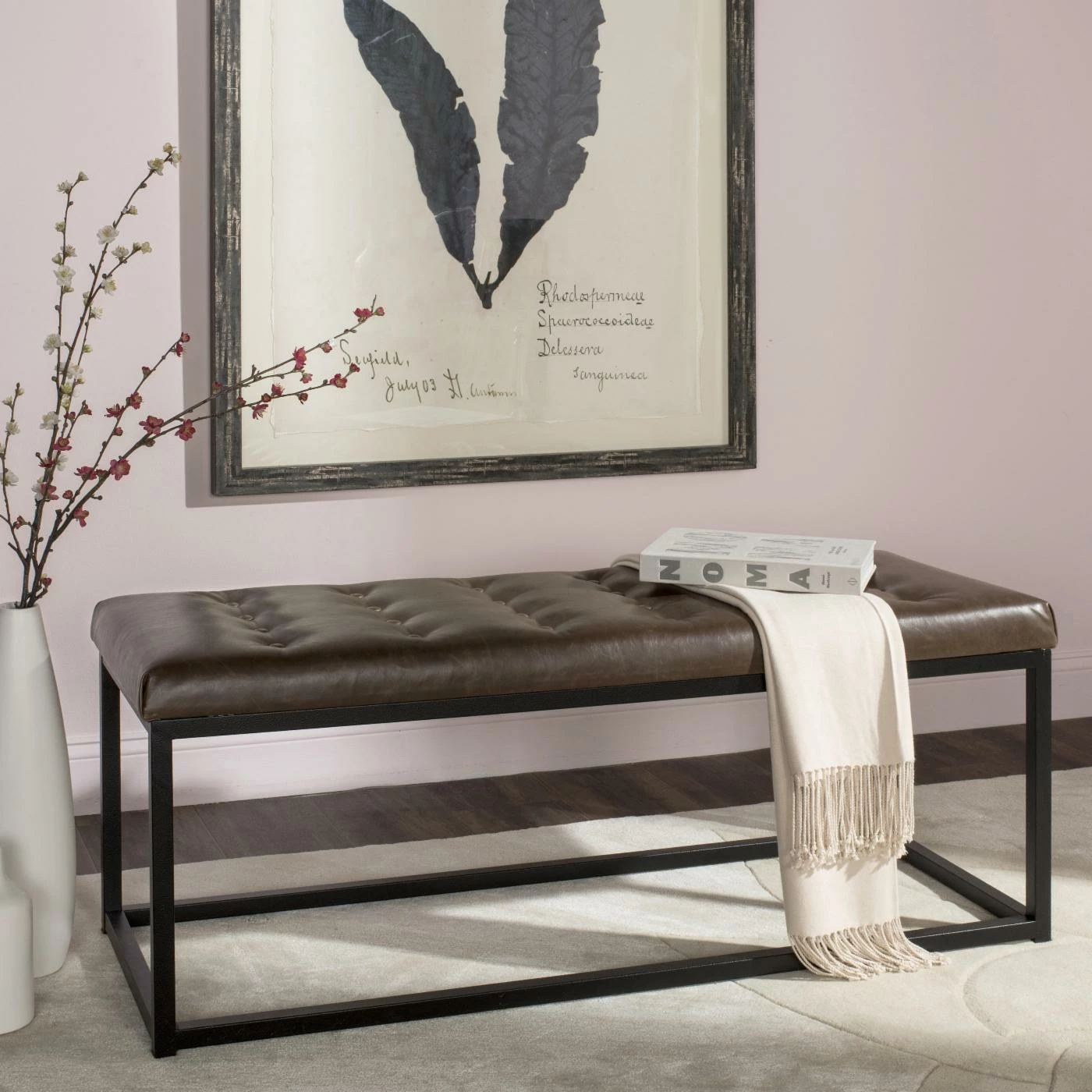 Sleek faux leather upholstery gives the Safavieh Reynolds Faux Leather Bench a refined energy. The tufted cushion is thick for comfortable sitting. The edgy wood frame features geometric design for a modern effect.