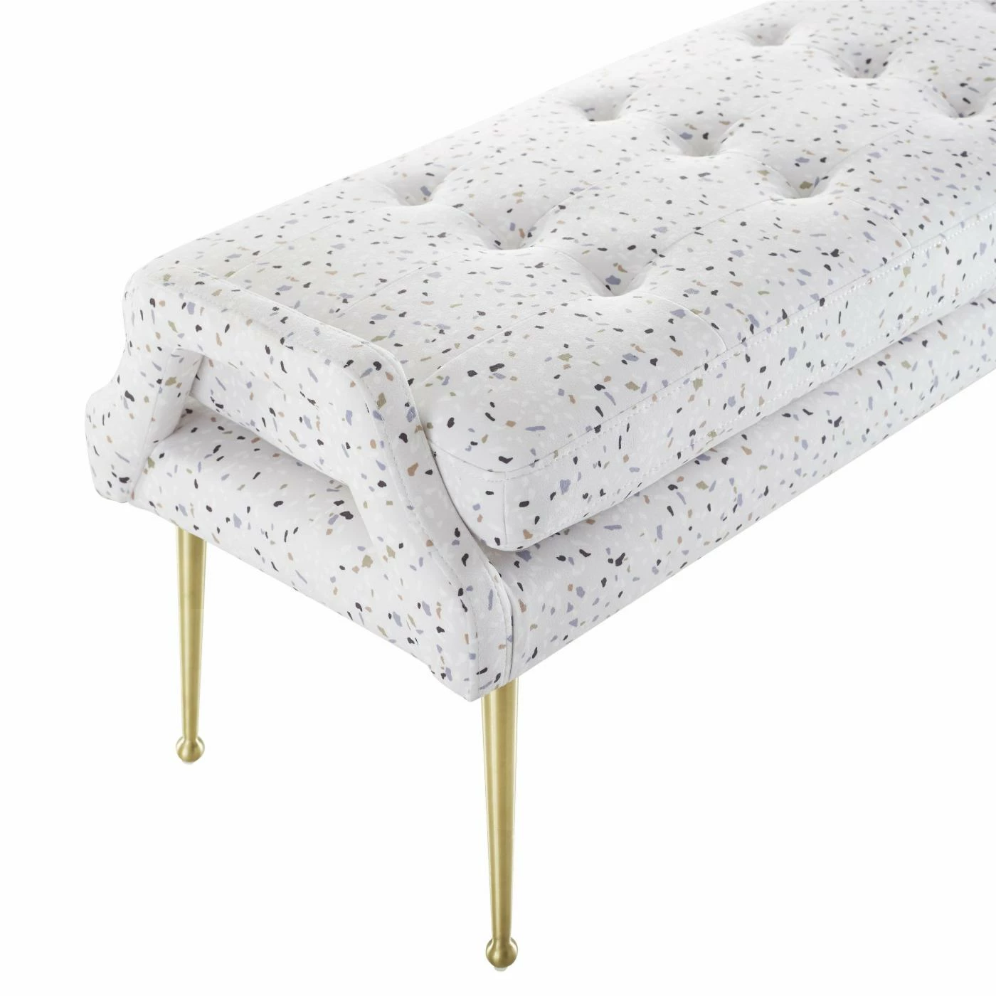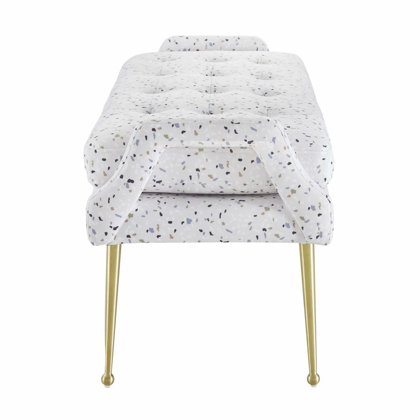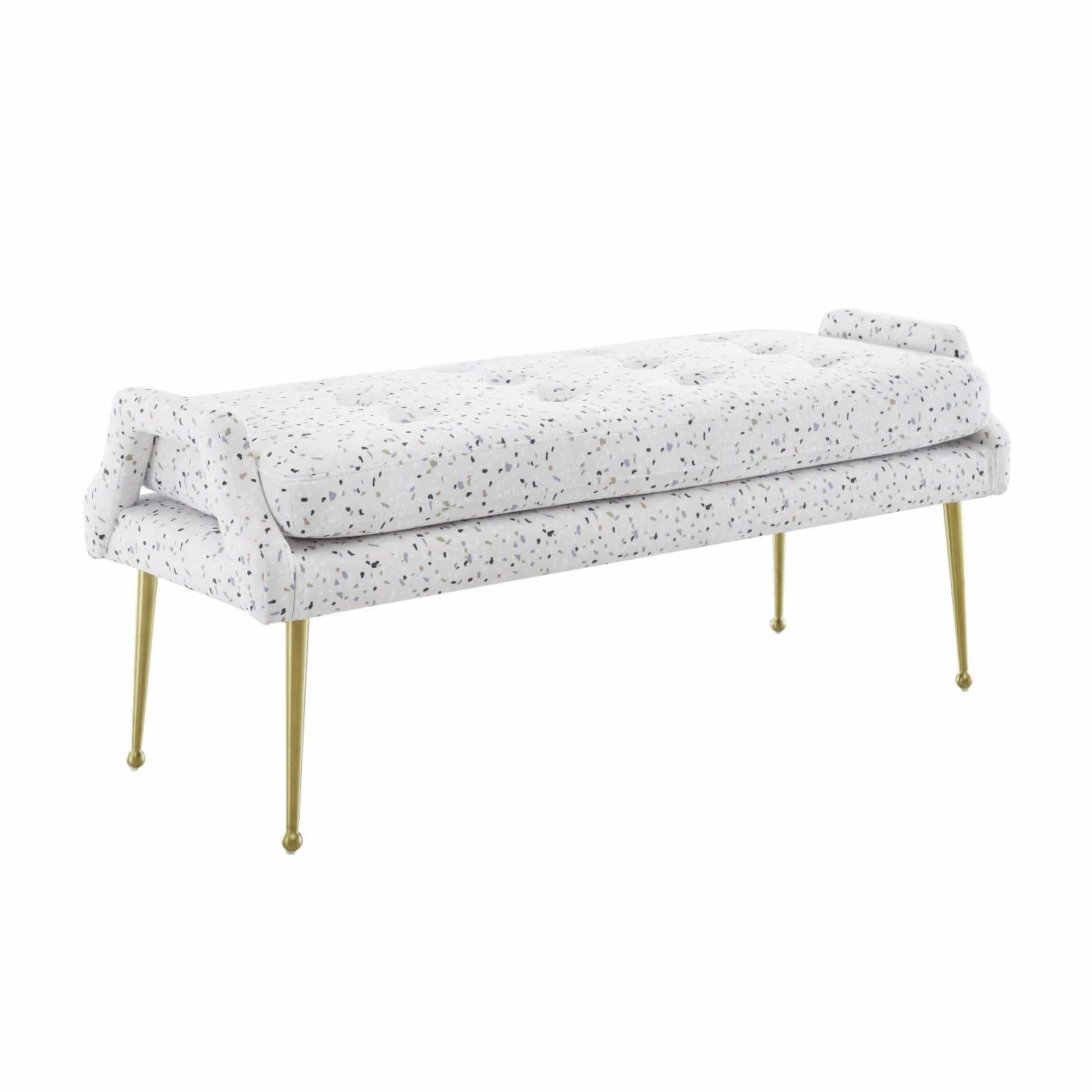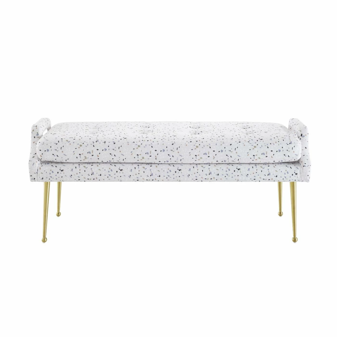 Whimsical style from the TOV Furniture Eileen Terrazzo Tufted Bedroom Bench will provide your bedroom or entryway with the perfect spot to put on your shoes. A long seat cushion sits inside the two keyhole cutout arched arms. The kiln dried wood frame is upholstered with fabric that features a white and gray background and speckled pattern. The stainless steel gold legs are tapered and have small round feet.