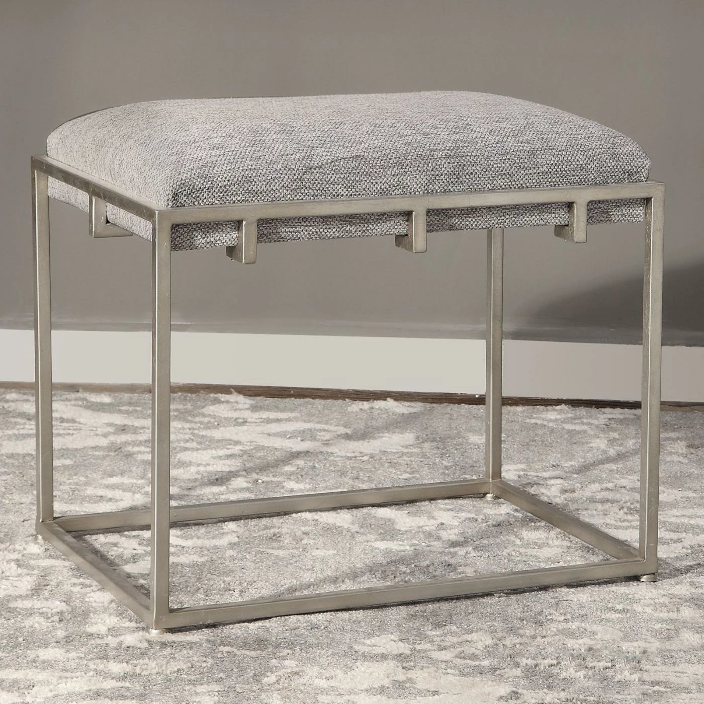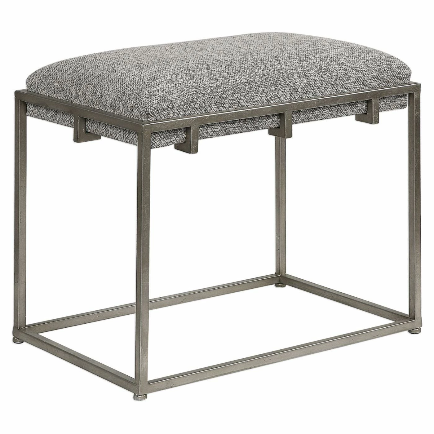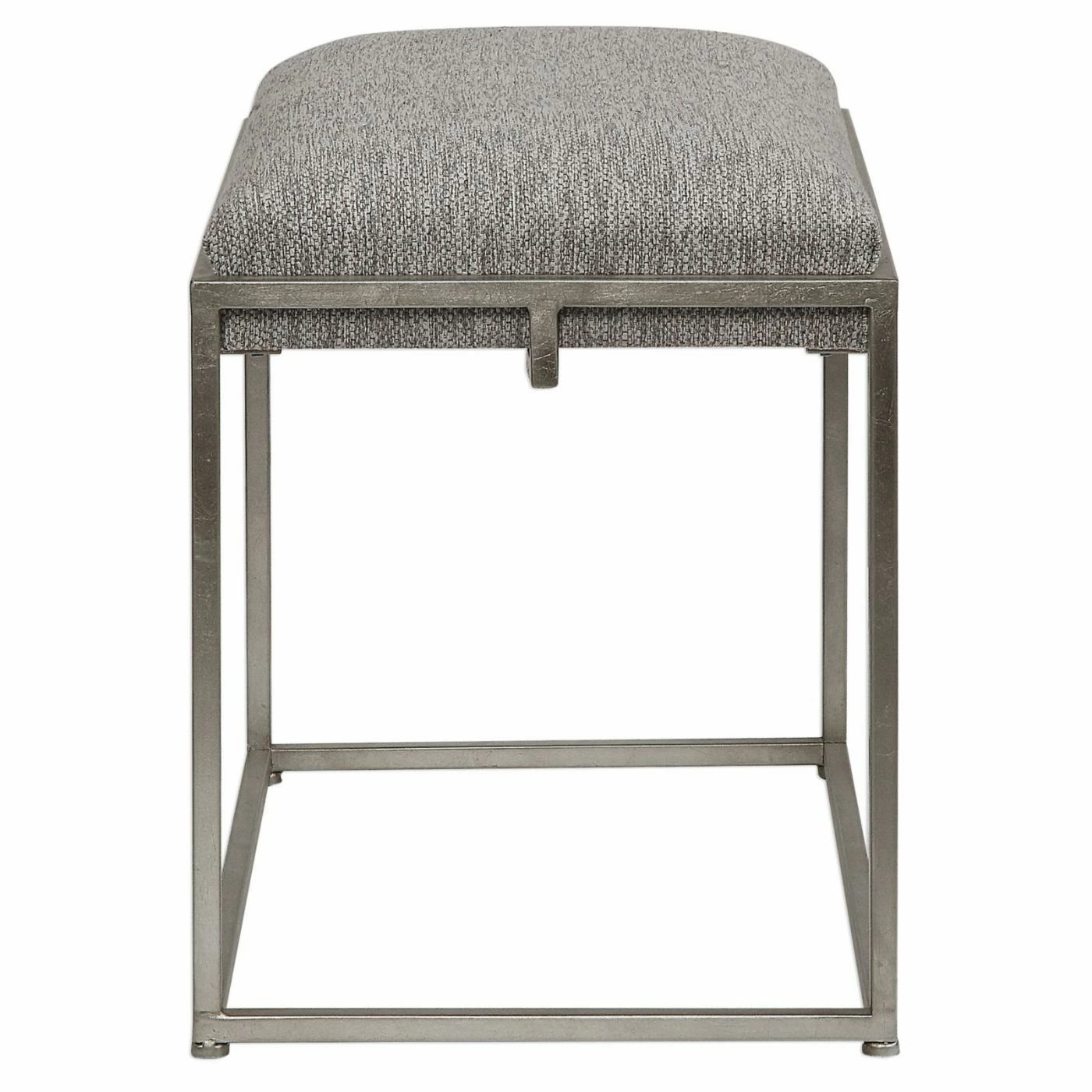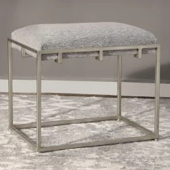 An iron frame provides durable structure for the Uttermost Edie Silver Small Bench. The seat is thickly cushioned in foam and supported by a compressed wood base. The gray linen upholstery of this backless bench is elegantly matched by the silver-toned frame.