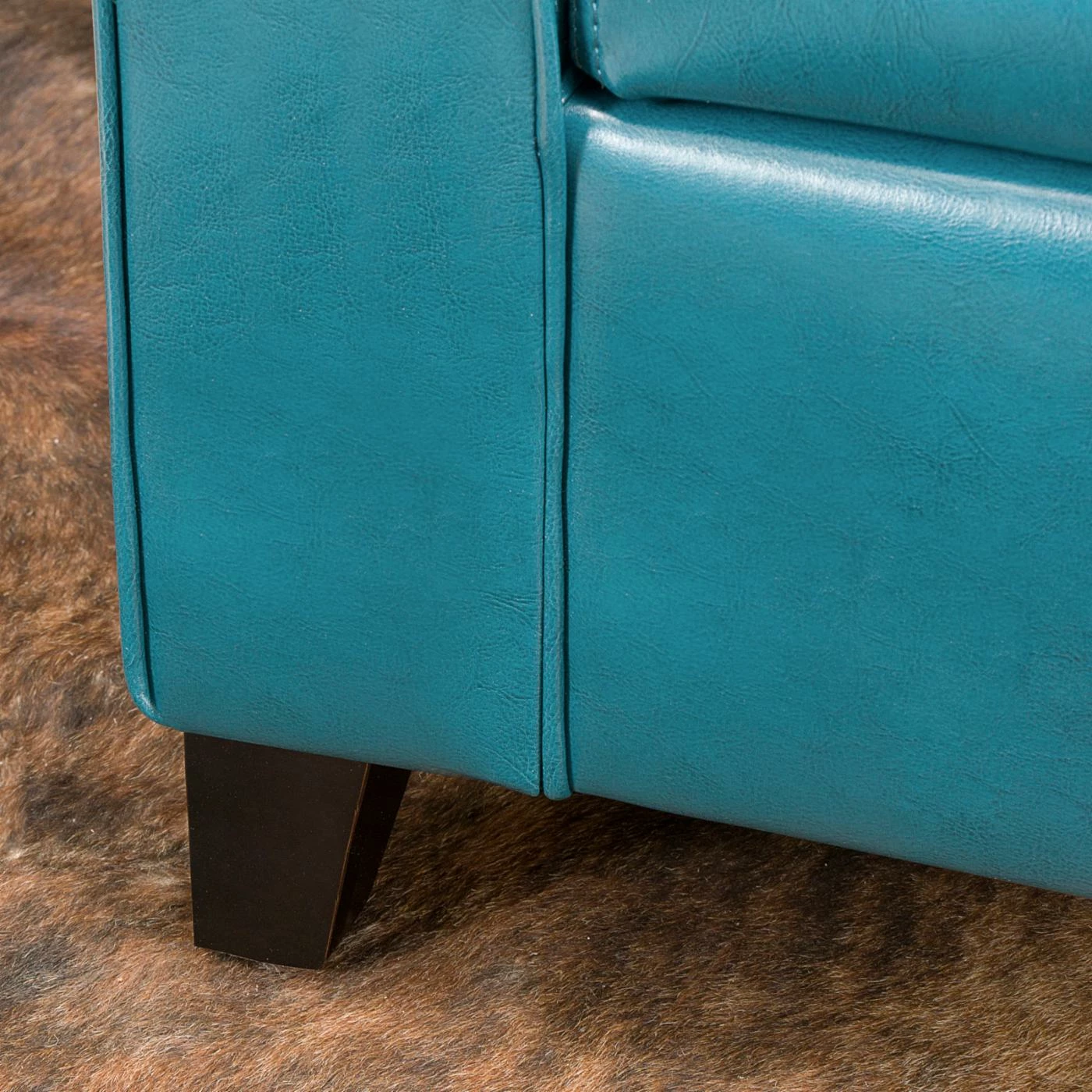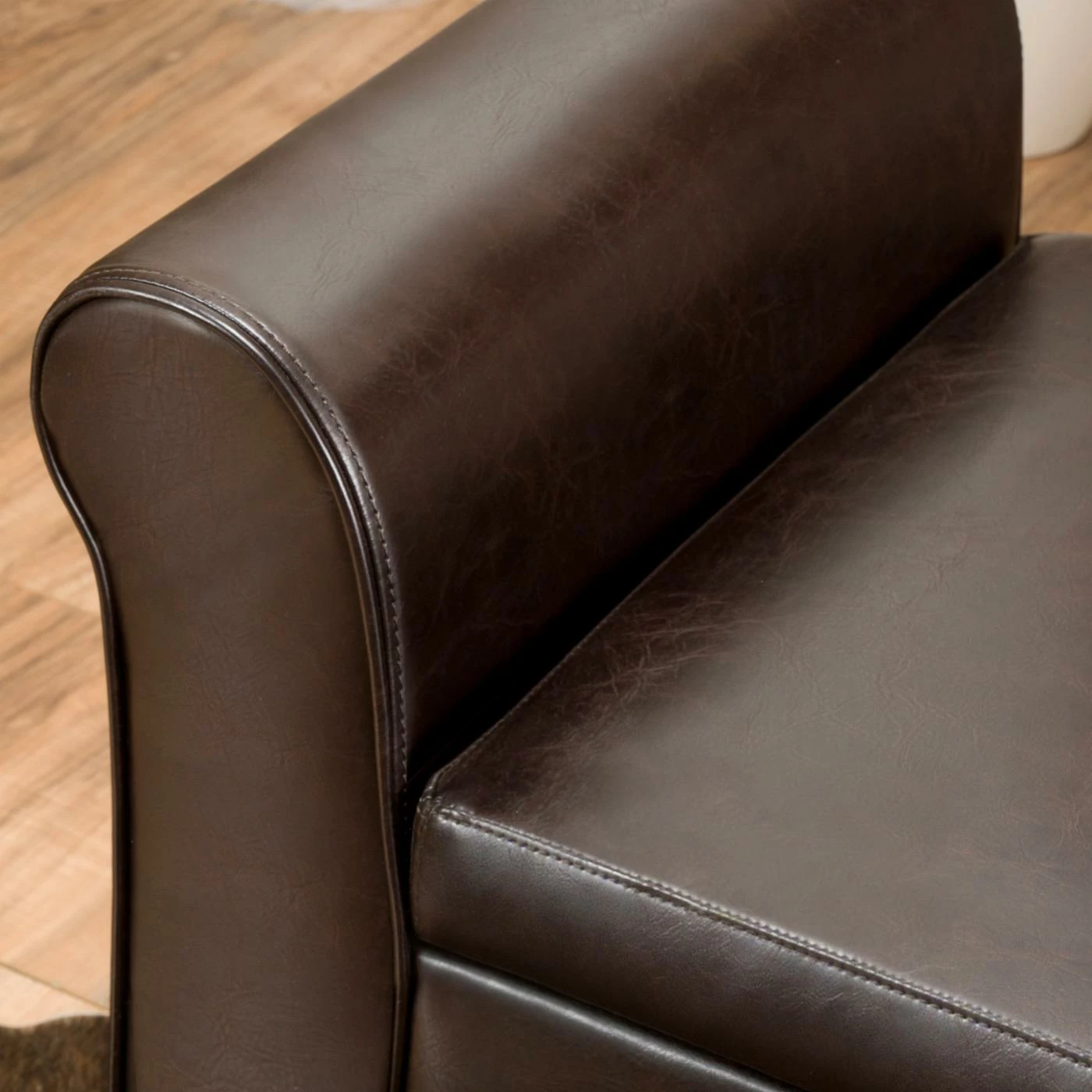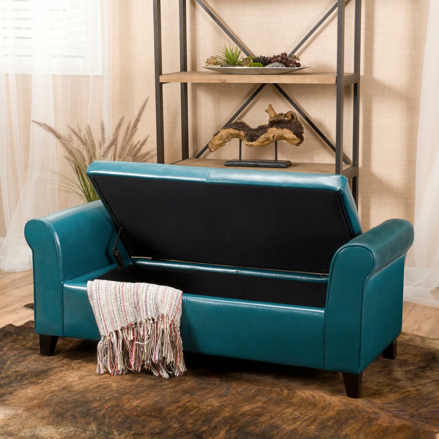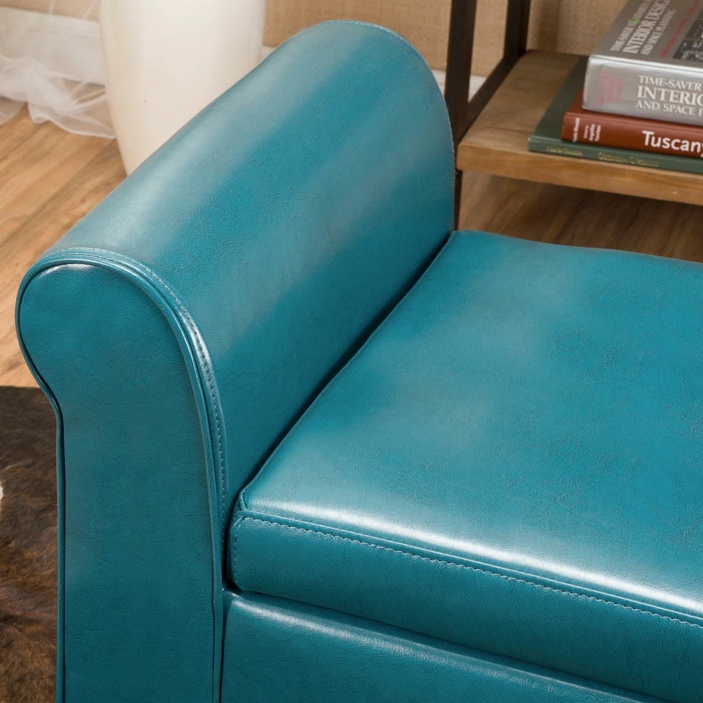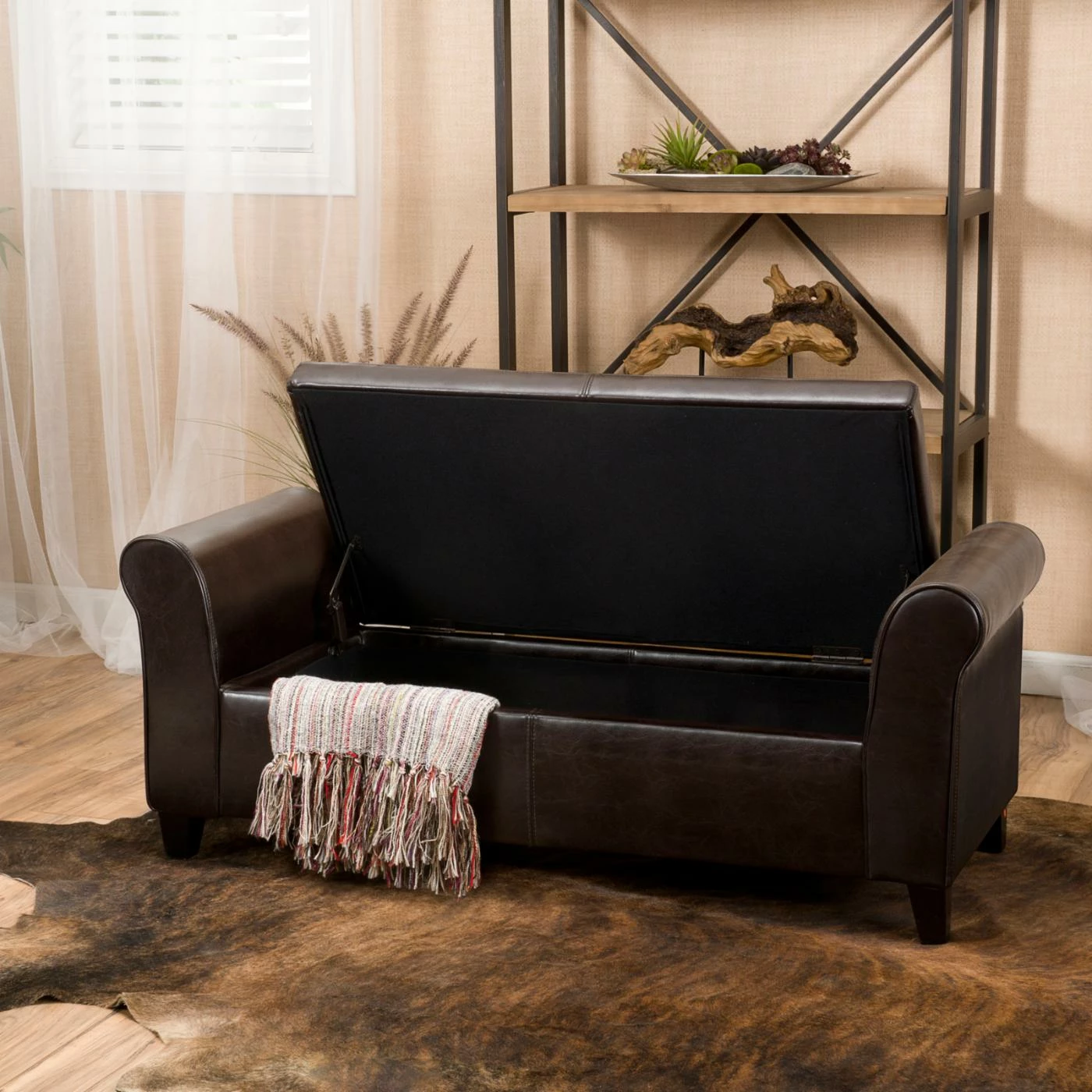 The Martin Faux Leather Bedroom Bench with Storage features gracefully curved arms that add beauty to its modern silhouette. This comfortable bench features faux leather upholstery in your choice of color to lend it a luxurious touch. Included storage gives you ample space to stow away items you’d rather leave out of sight.