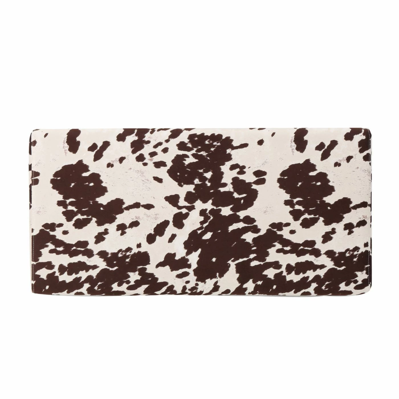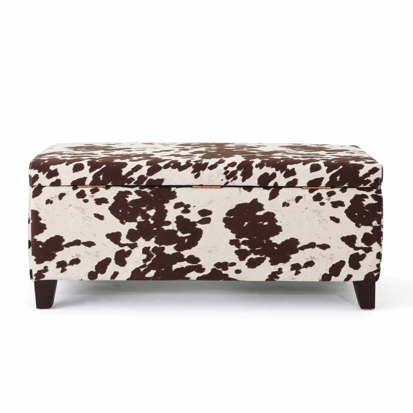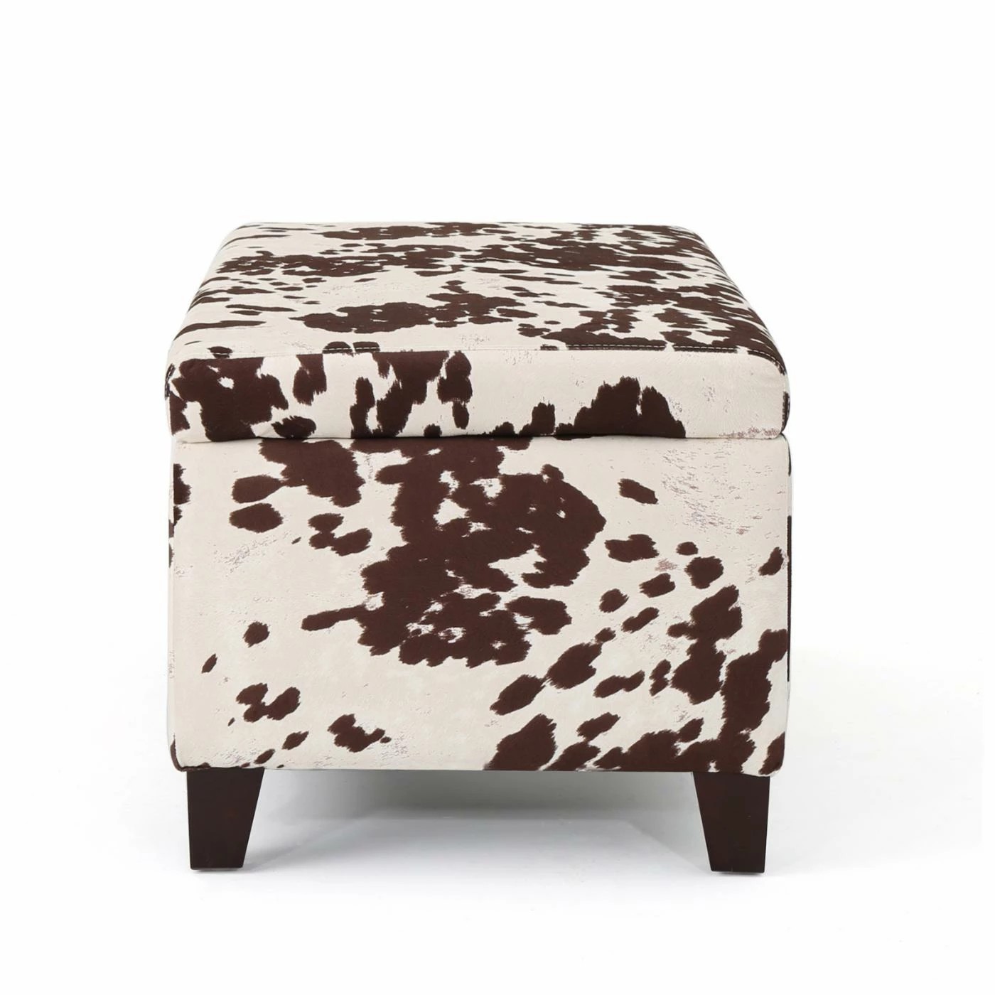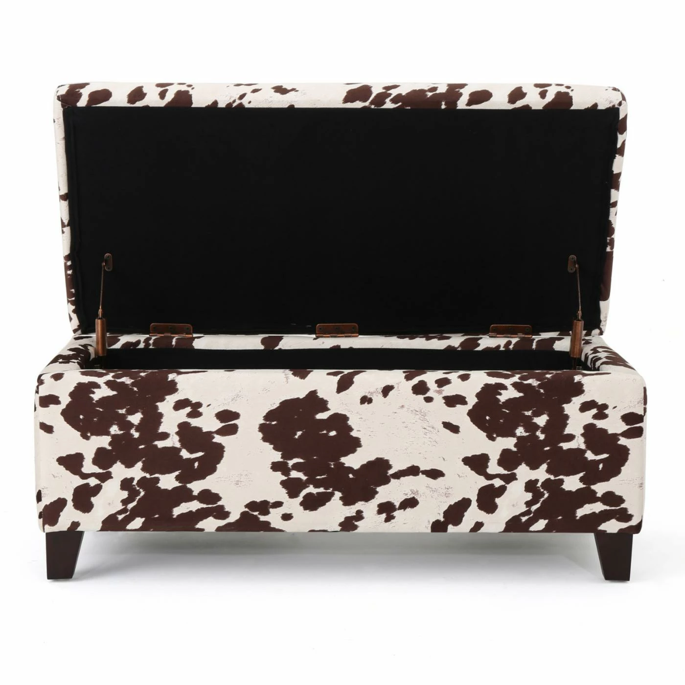 Bring a touch of ranch life to your living area with the Brahma Velvet Cow Print Storage Ottoman Bench. This charming ottoman features a soft velvet upholstery in a whimsical cow print pattern. In addition to serving as a luxurious footrest, this ottoman is perfect for providing extra seating for guests. It also has a hinged lid that reveals a hollow interior, allowing you to store any number of items conveniently and out of sight. This multifunctional piece is ideal for the living room, den, or bedroom, and is as stylish as it is functional.