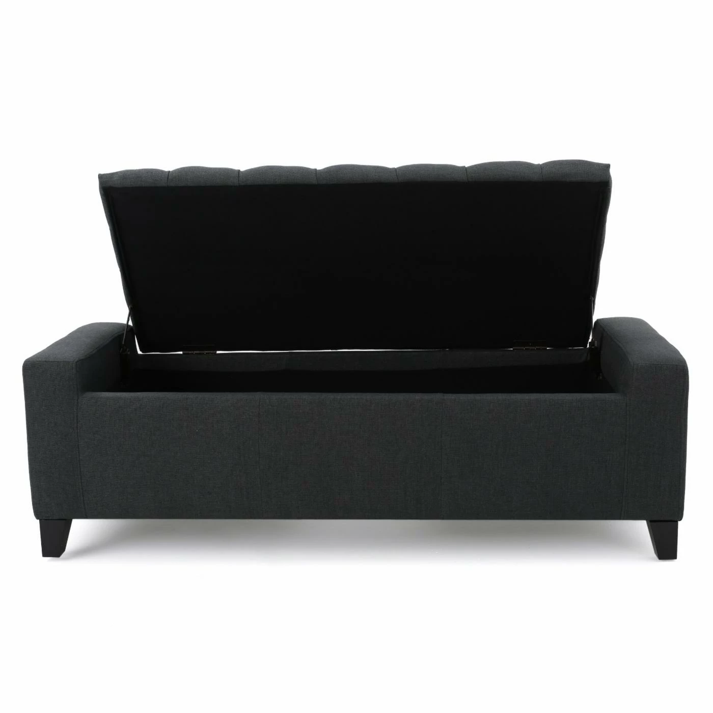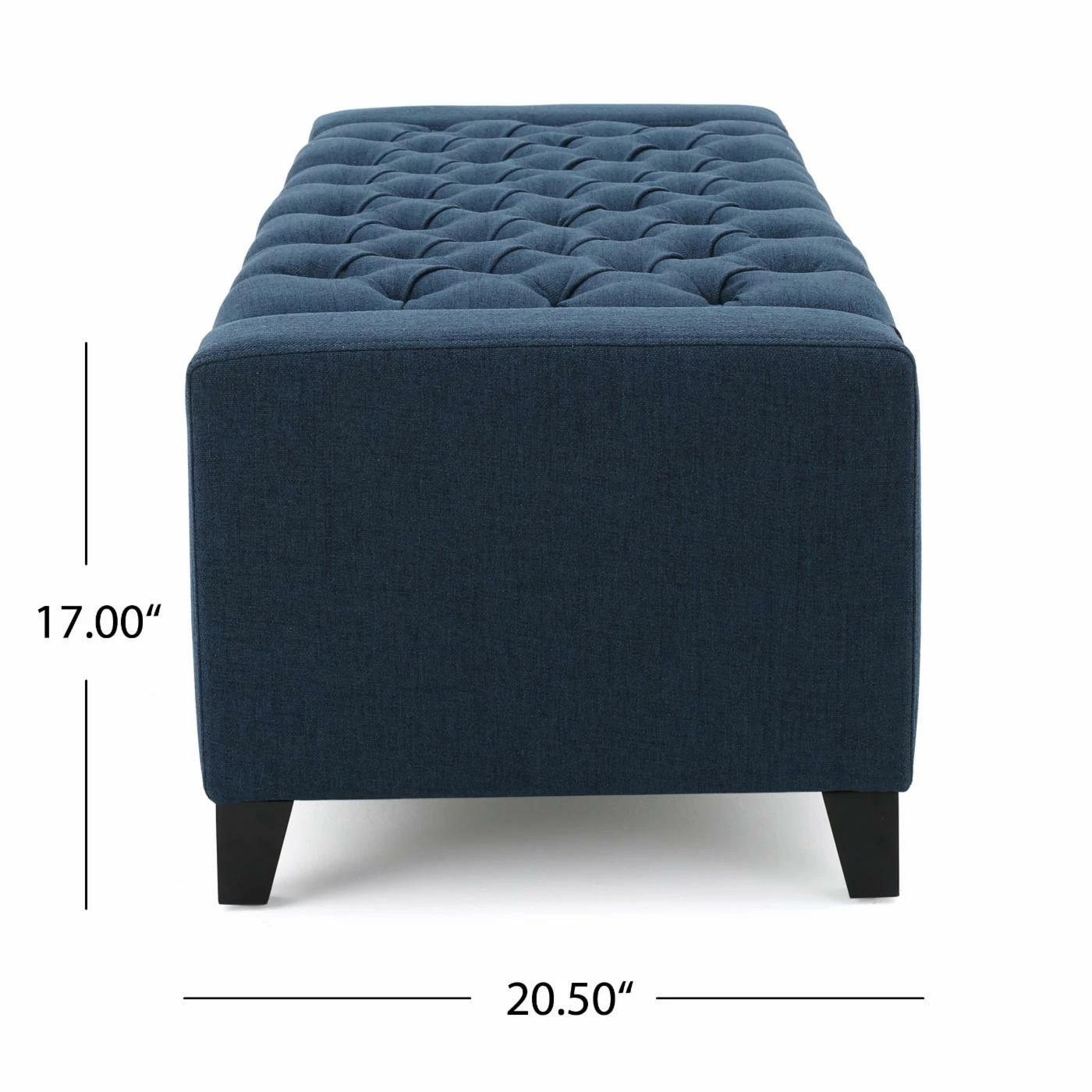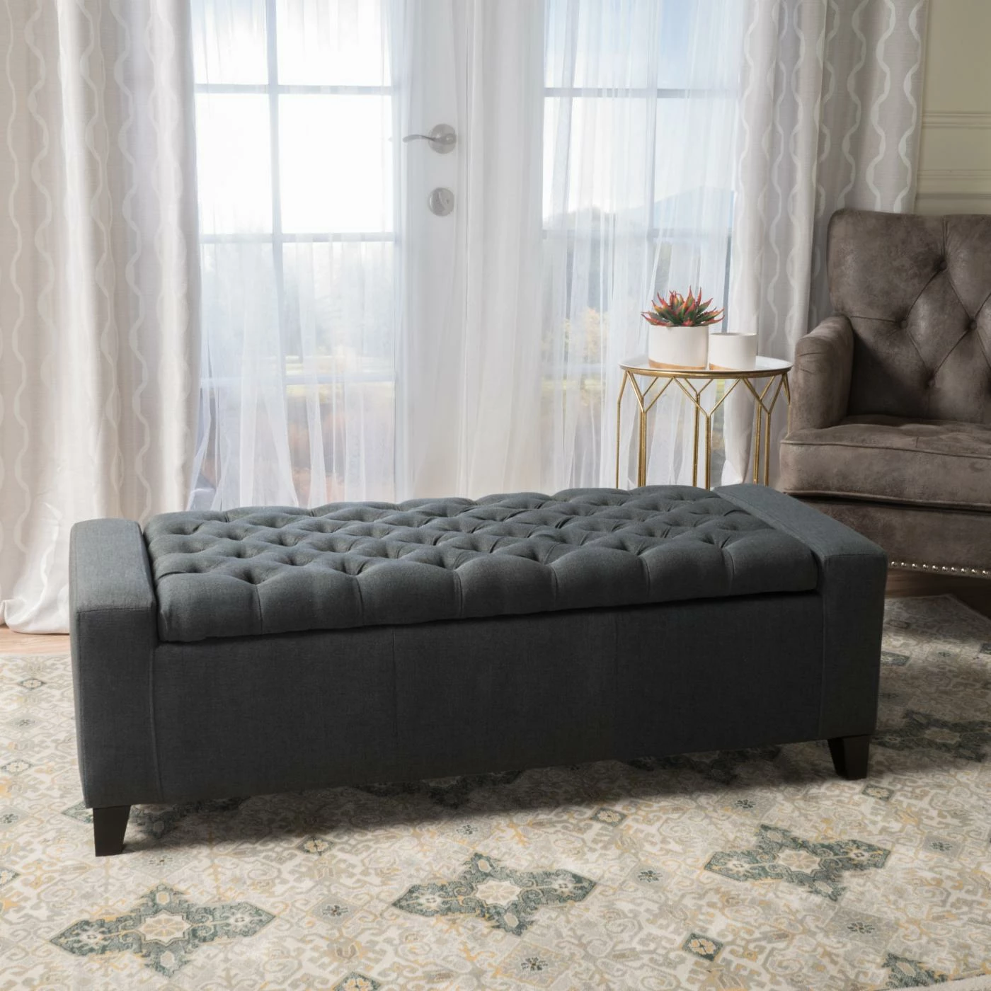 Stylishly designed and brimming with versatility, the Clarke Fabric Storage Indoor BenchΒ works just as beautifully in your bedroom as it does in your living room. This fabric storage bench is solidly built with a birch wood frame and features an easy-lift, hinged lid and plenty of interior storage for holding remotes, games, blankets and more close at hand and reducing clutter in your room. Button-tufted up top for extra comfort, this fabric upholstered furniture comes in your choice of available color option to best match your dΓ©cor. Protective casters on the bottom of the birch wood feet protect floors from scratching.