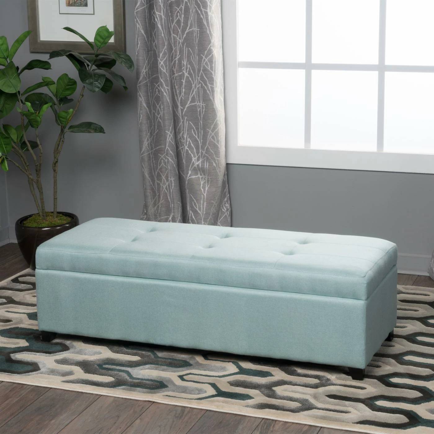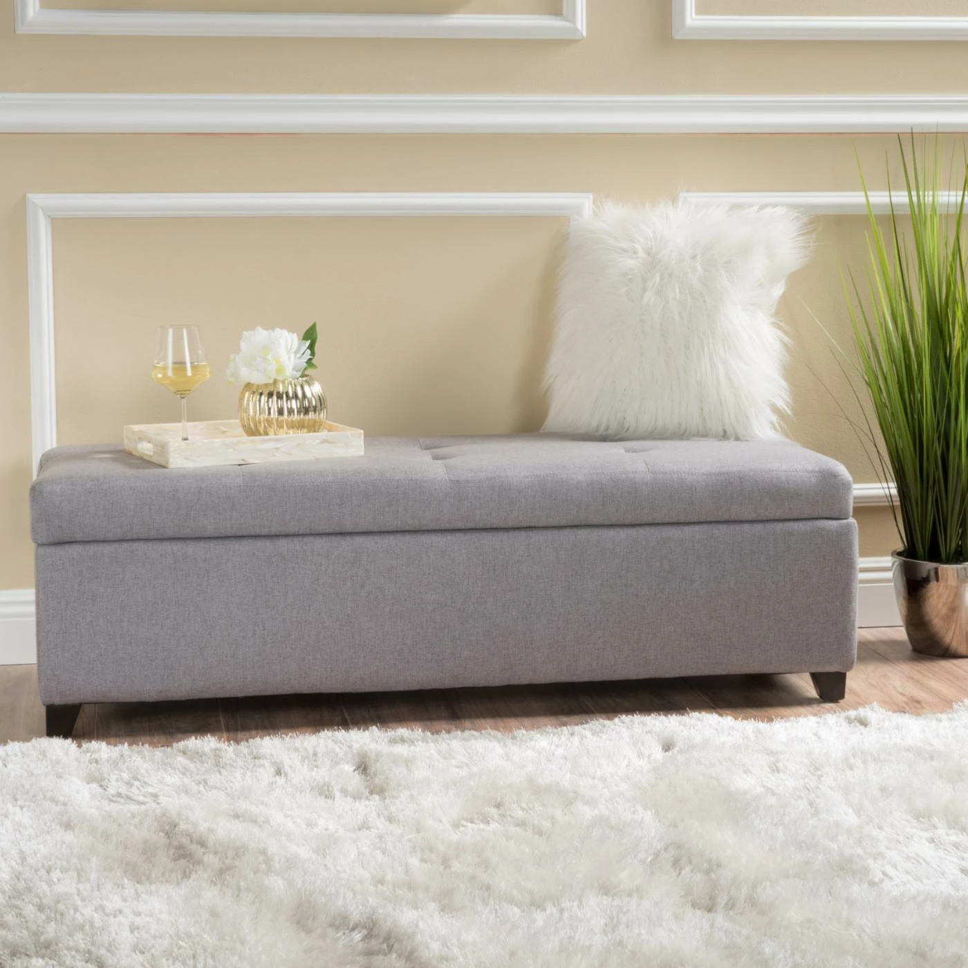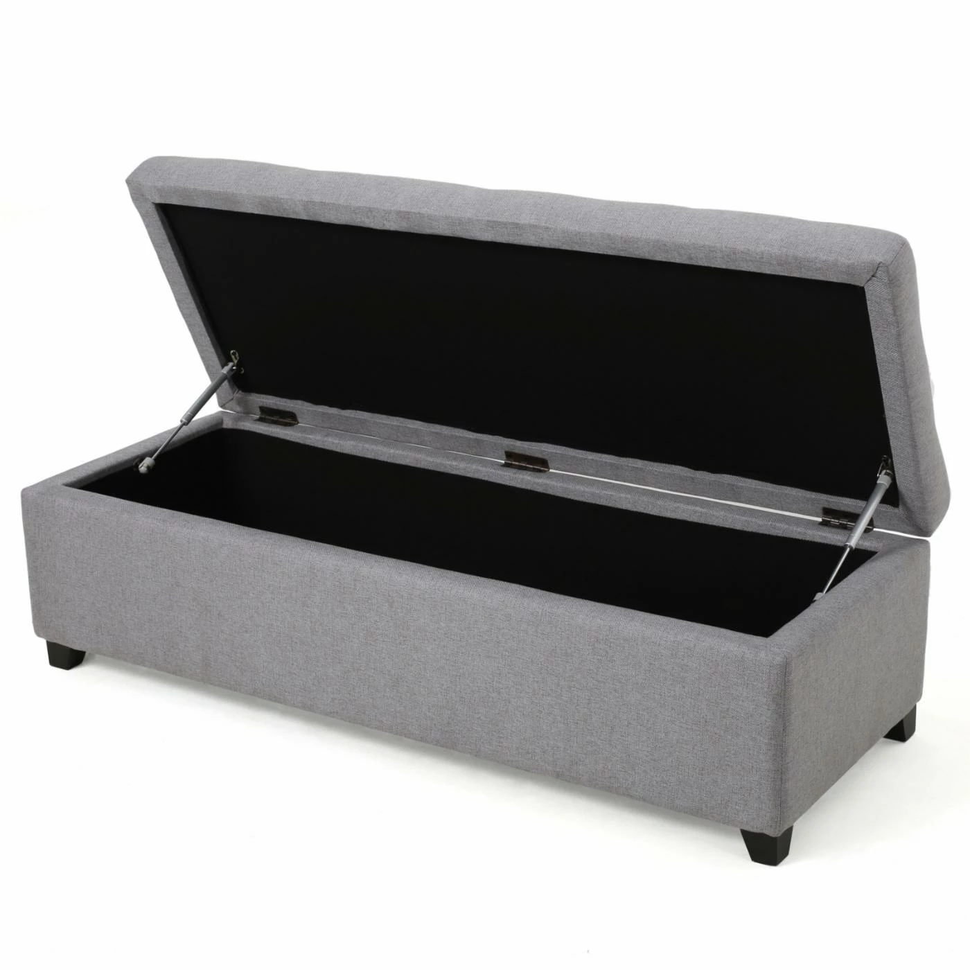 Simple sophistication, the Joel Fabric Storage Ottoman lends a timeless and versatile look to any room. This rectangular storage ottoman features a button-tufted, cushioned top that stays open as you tuck away blankets, pillows, books, games, remotes, and more within the lined interior. It is solidly constructed with a birch wood frame and legs for a silhouette that’s strong, sturdy, and perfect for additional seating when needed or a soft spot to rest your feet.