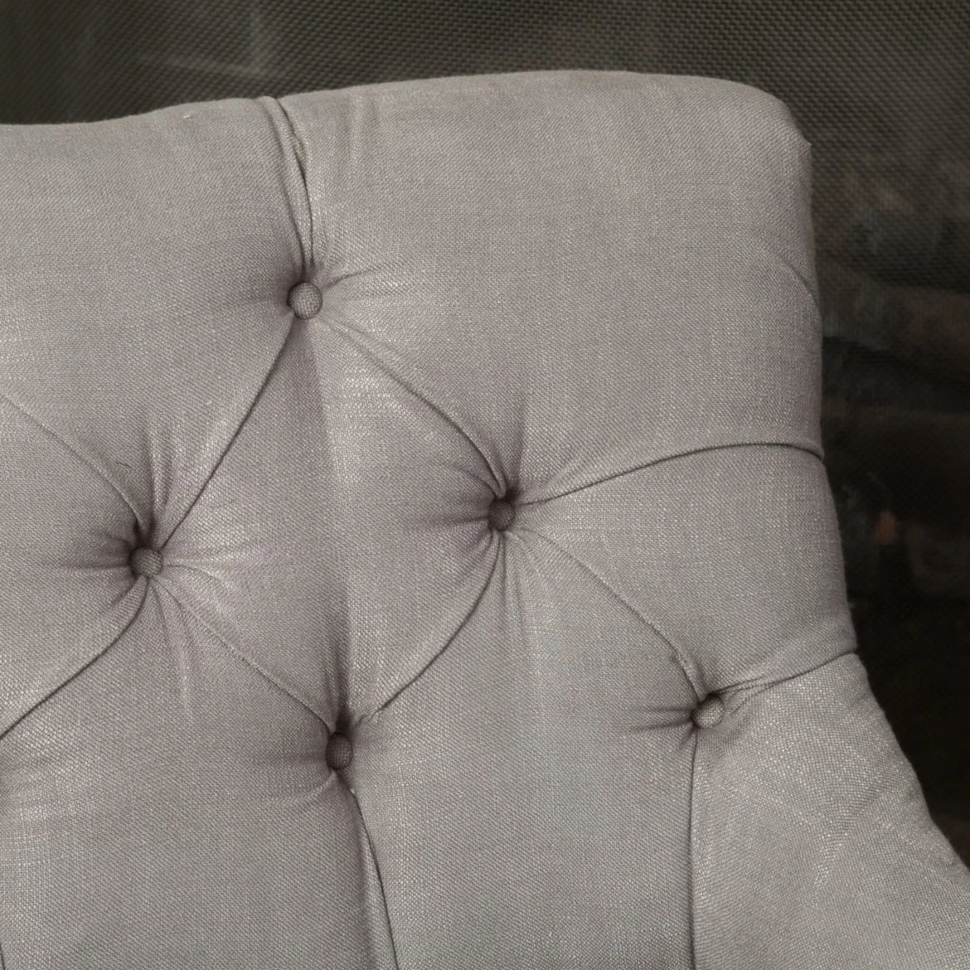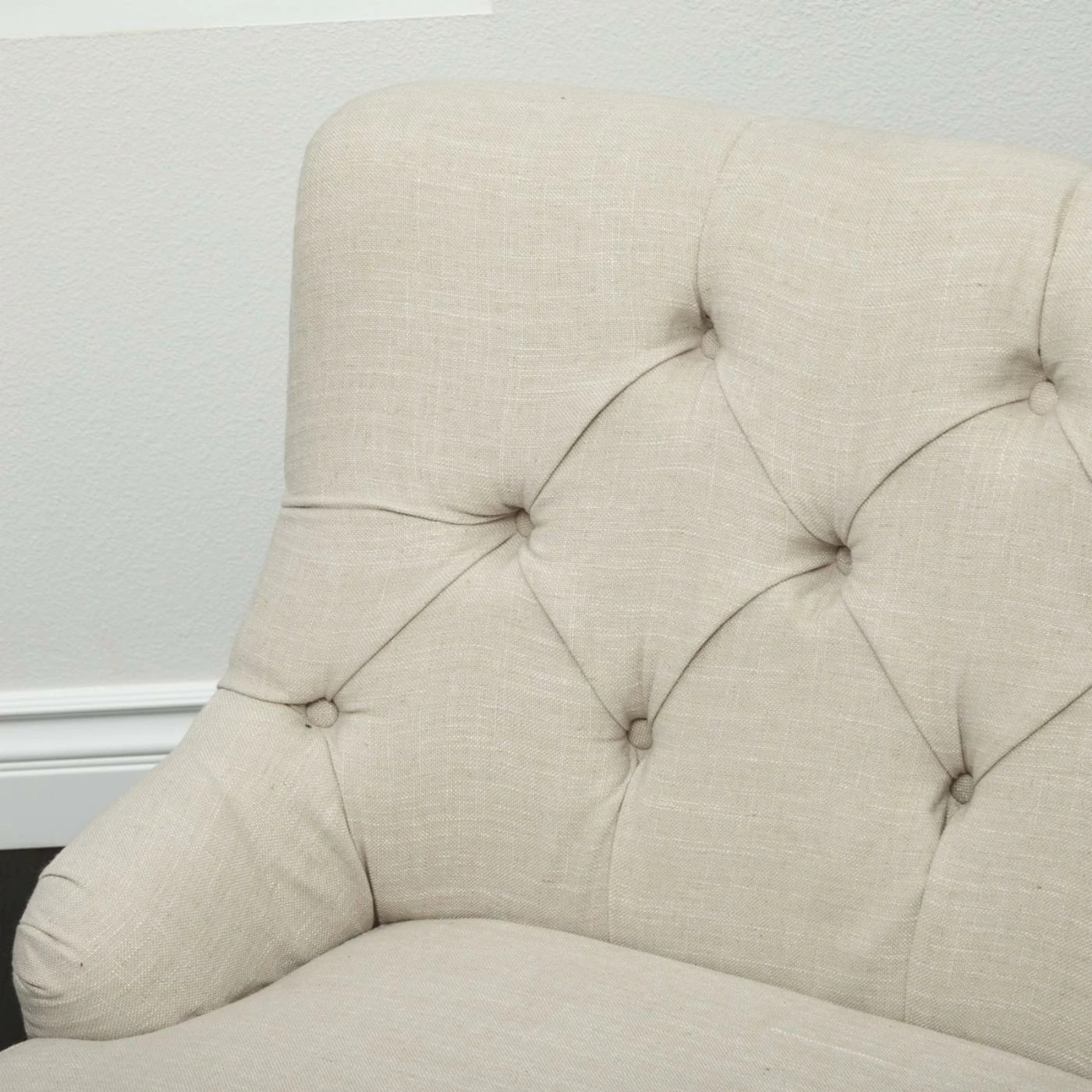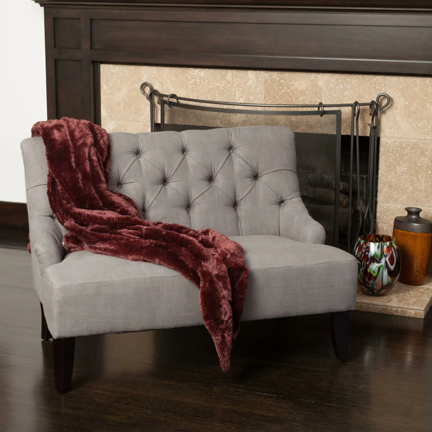 The Lynnhaven Settee brings sleek design to your favorite room with its tall back section covered in button tufting. This chic settee is enhanced with your choice of colored upholstery, and dark wooden legs add support as well as dramatic contrast. Slight bump-outs on each side add a little depth and give you a place to rest your arms.