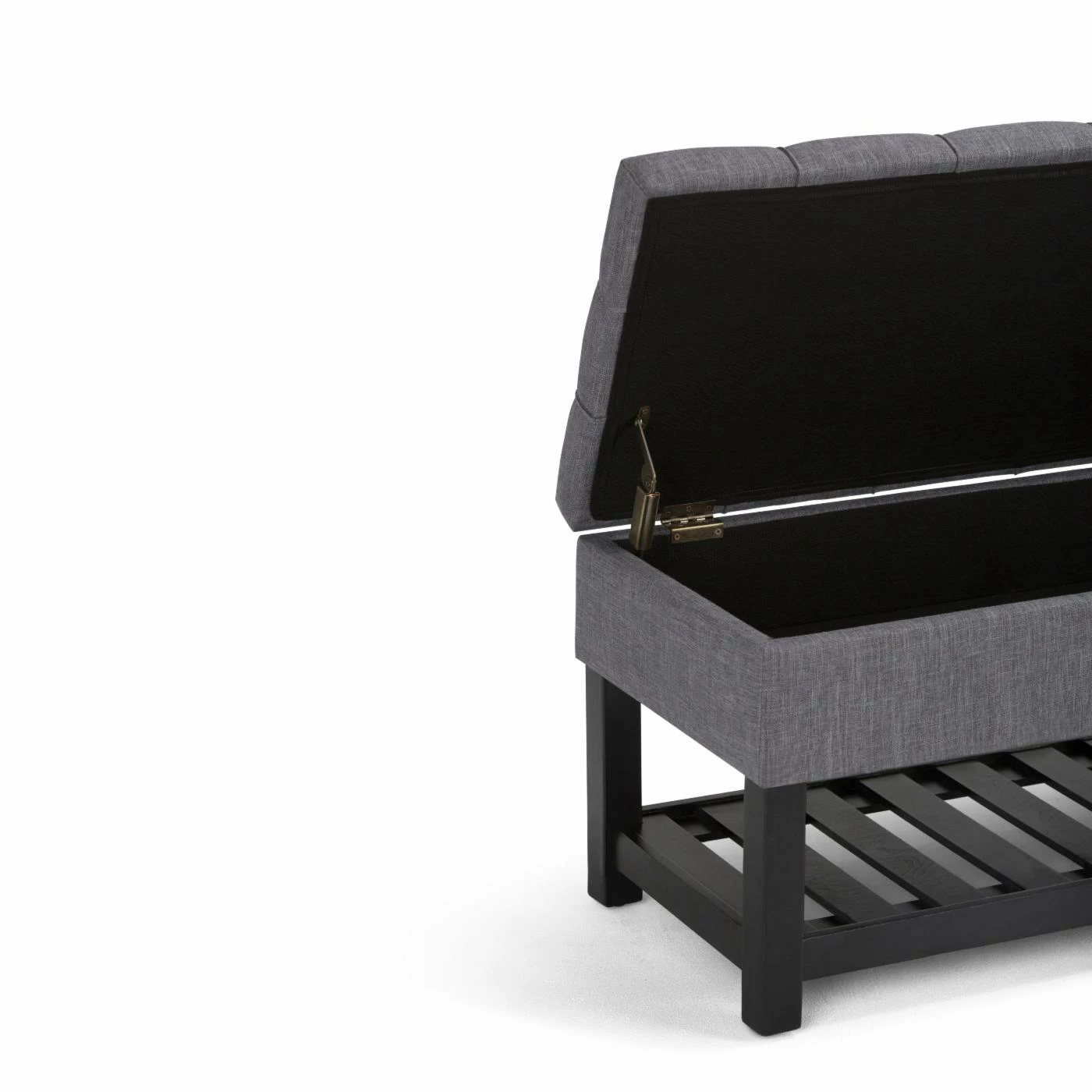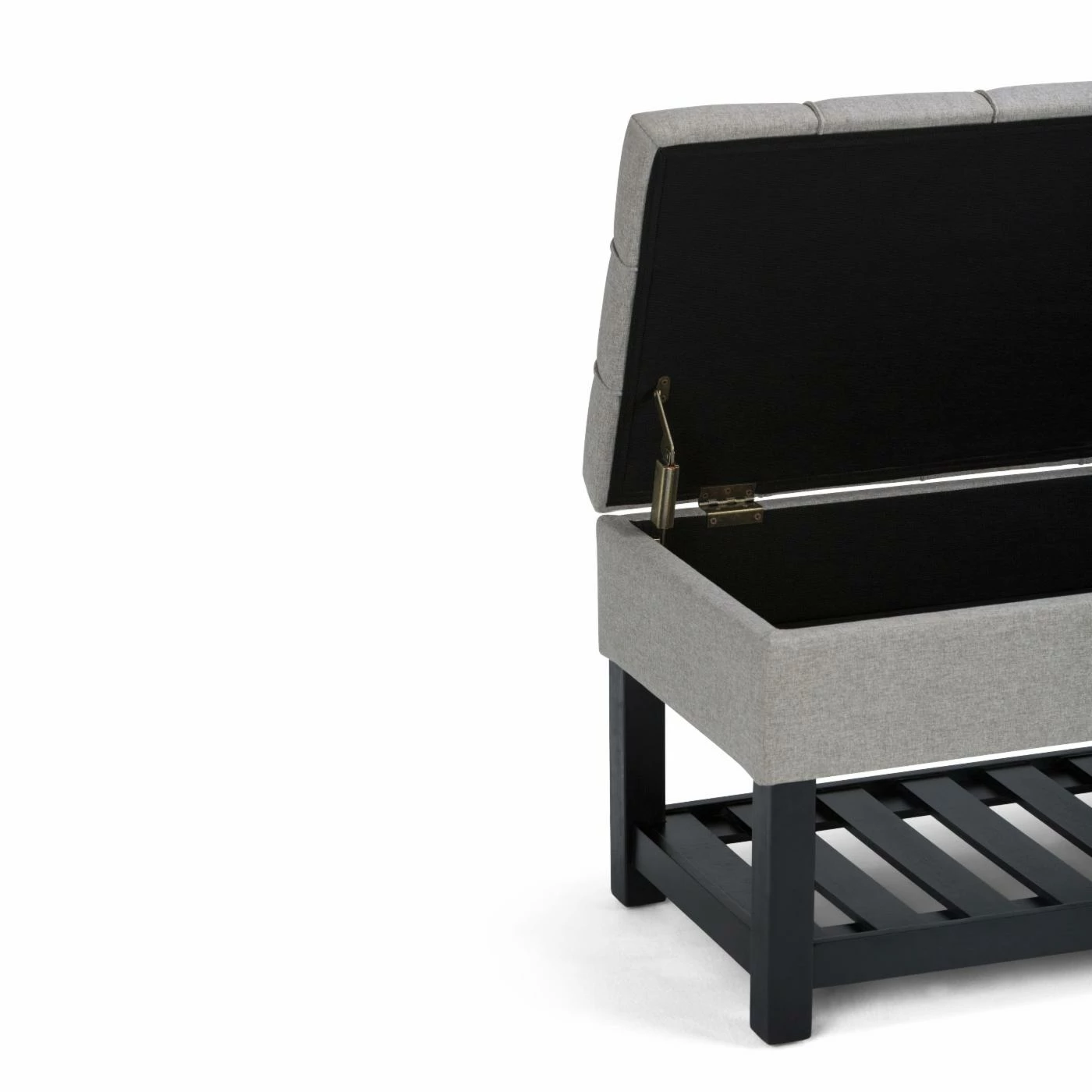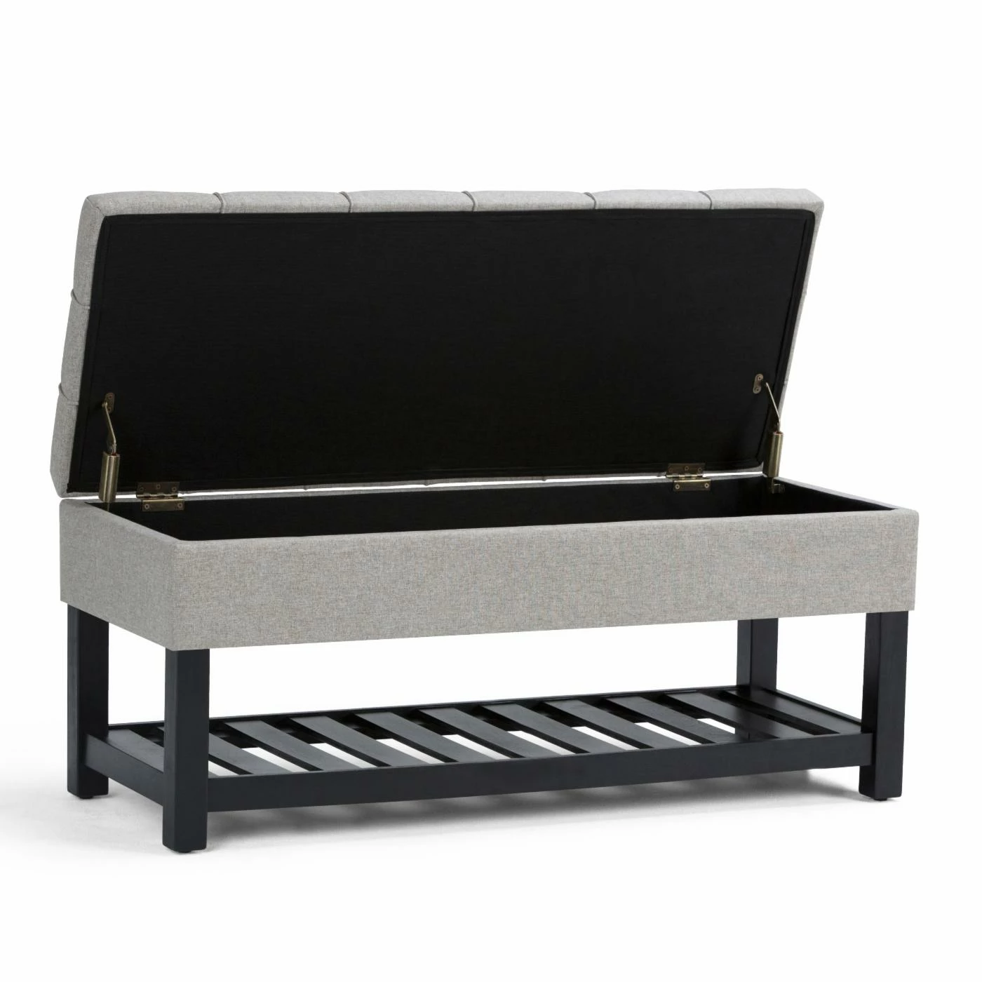 Add plenty of storage space to your home with the Brooklyn + Max Hayden Storage Ottoman Bench. This bench is perfect for small spaces or apartments that need just a little more storage. With a unique tufted top and a slated lower shelf, this bench has all you need in a new piece of furniture.