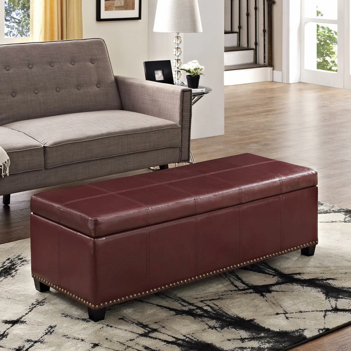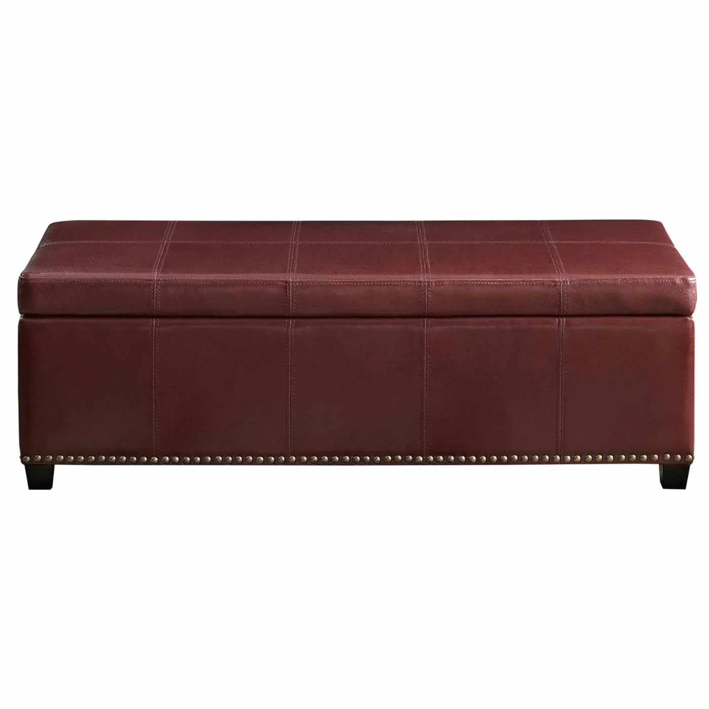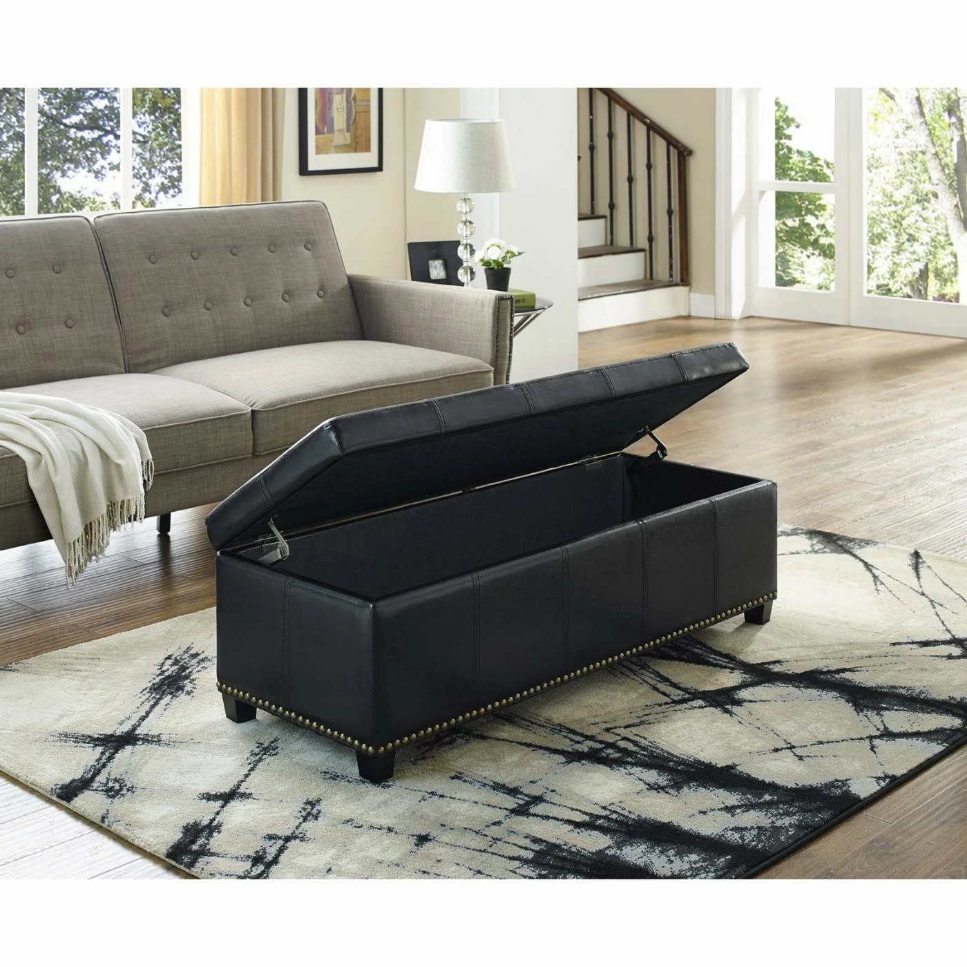 Decorative top stitching, nail head trim, and premium PU faux leather color options make the Brooklyn + Max Huntsville Leather Storage Ottoman Bench perfect for your home. This handy ottoman bench features a comfortably padded and hinged top that conceals open storage space within.