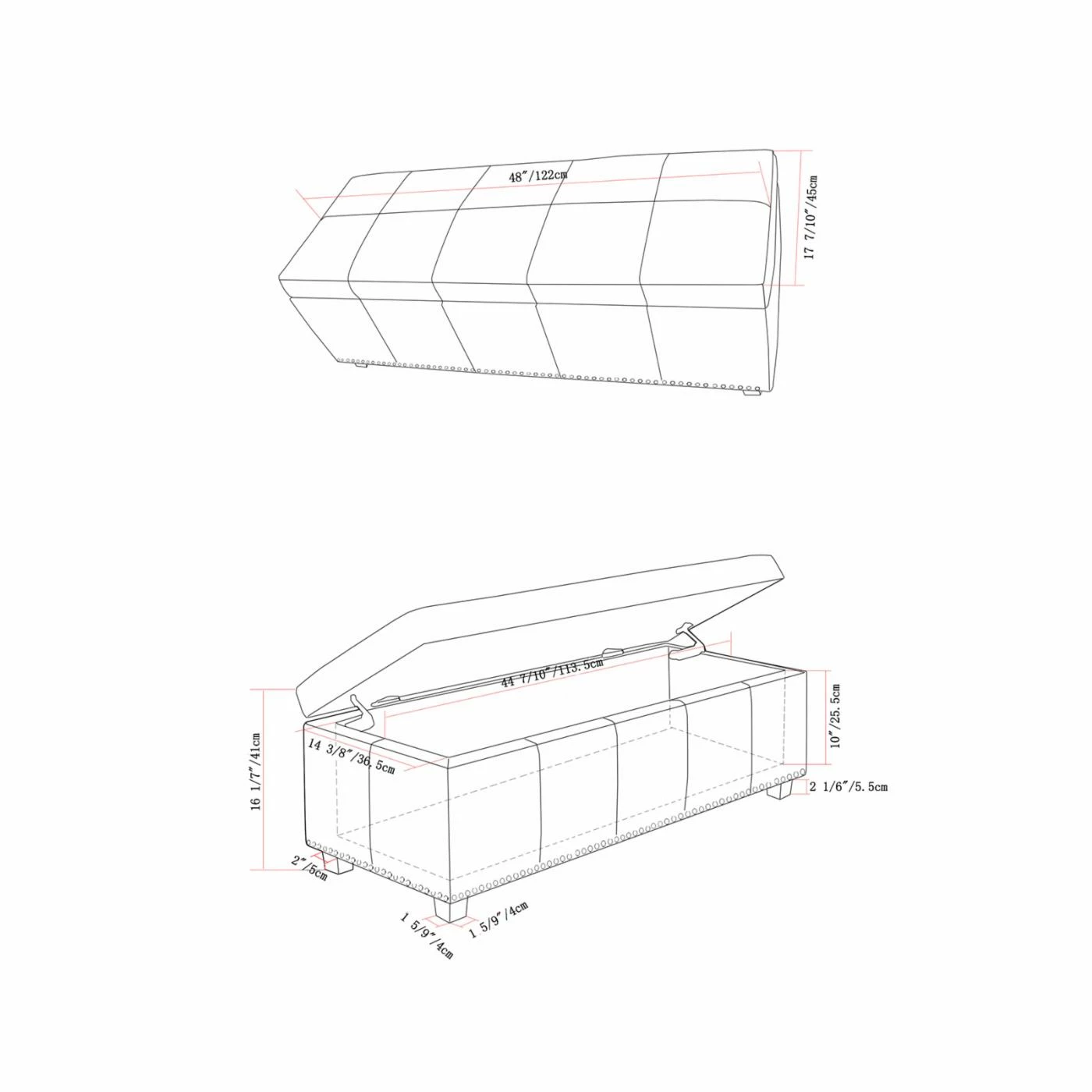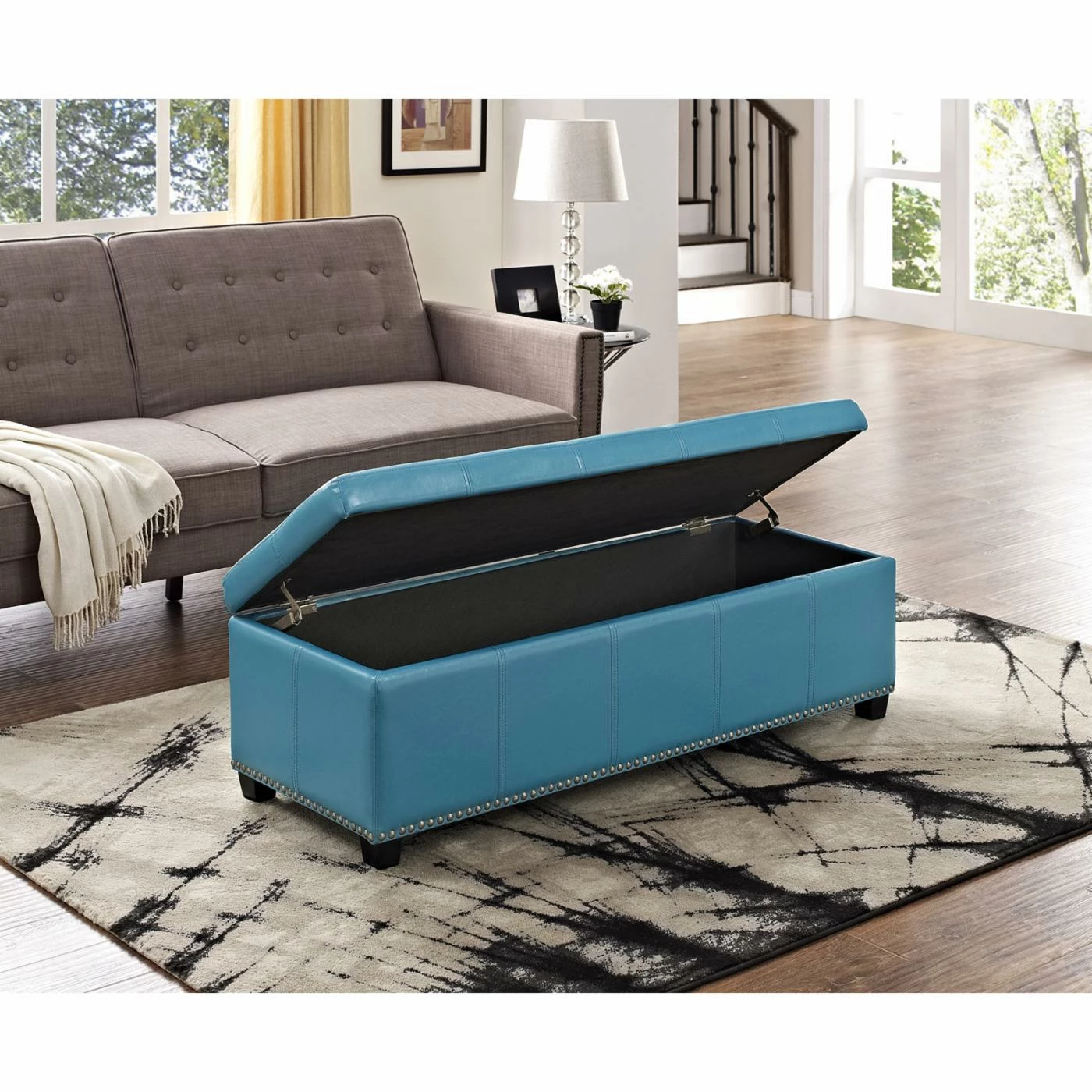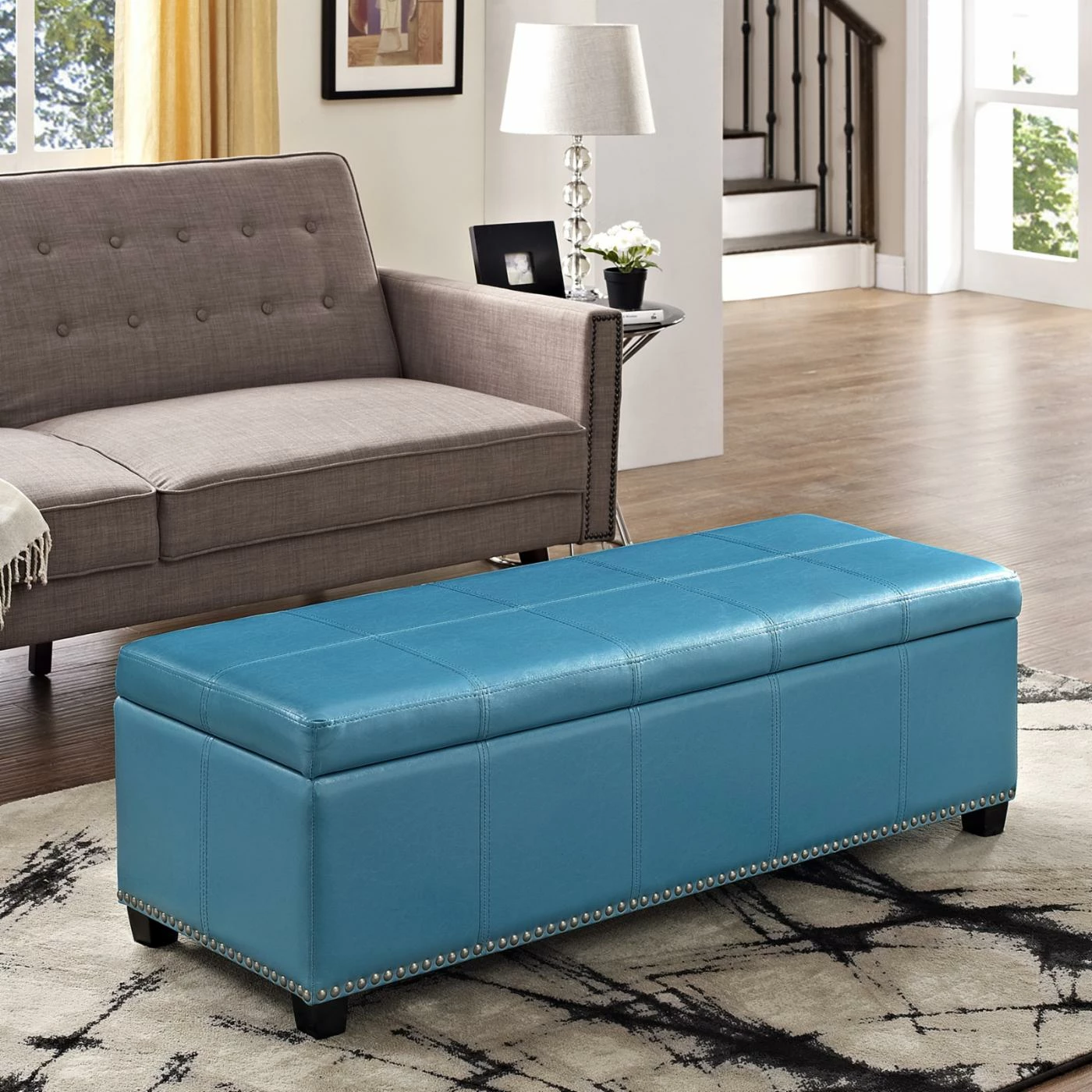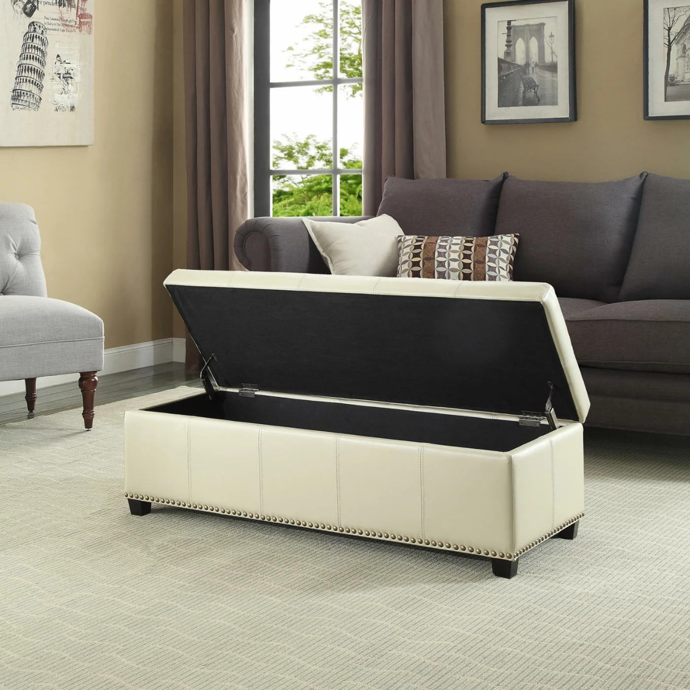 Decorative top stitching, nail head trim, and premium PU faux leather color options make the Brooklyn + Max Huntsville Leather Storage Ottoman Bench perfect for your home. This handy ottoman bench features a comfortably padded and hinged top that conceals open storage space within.
