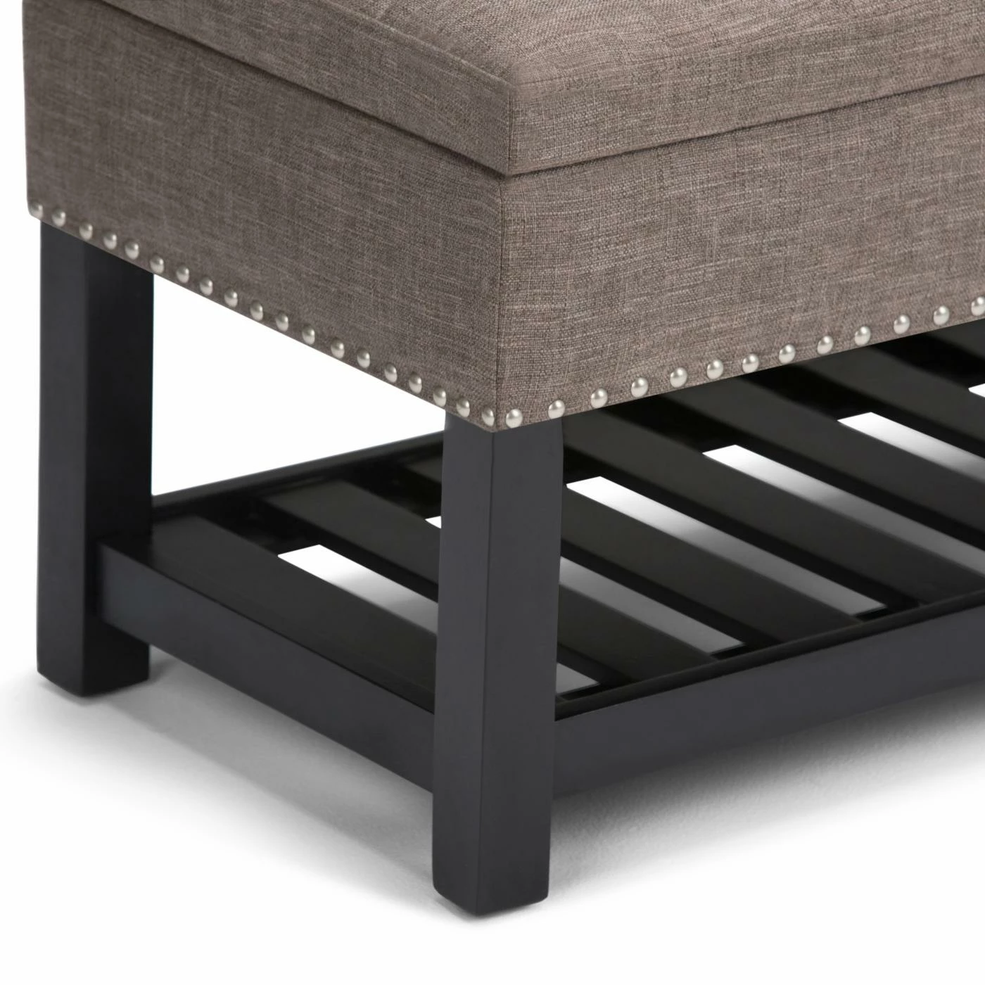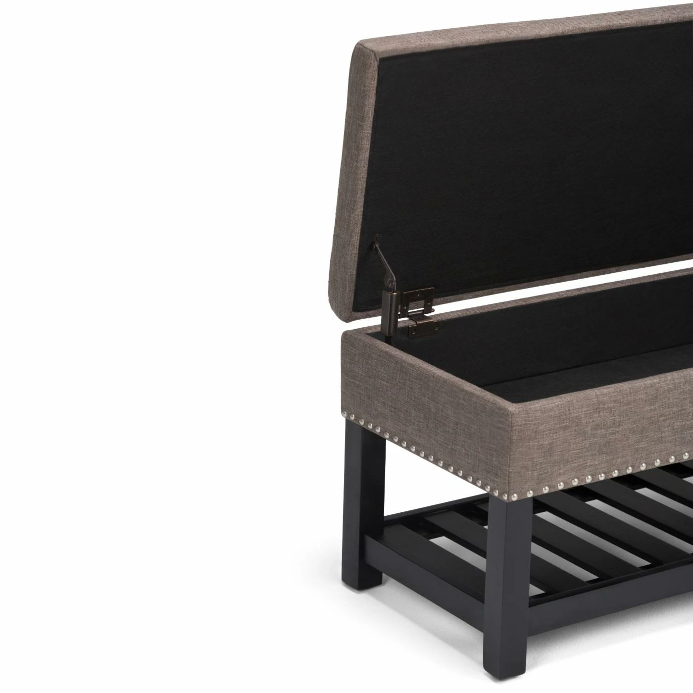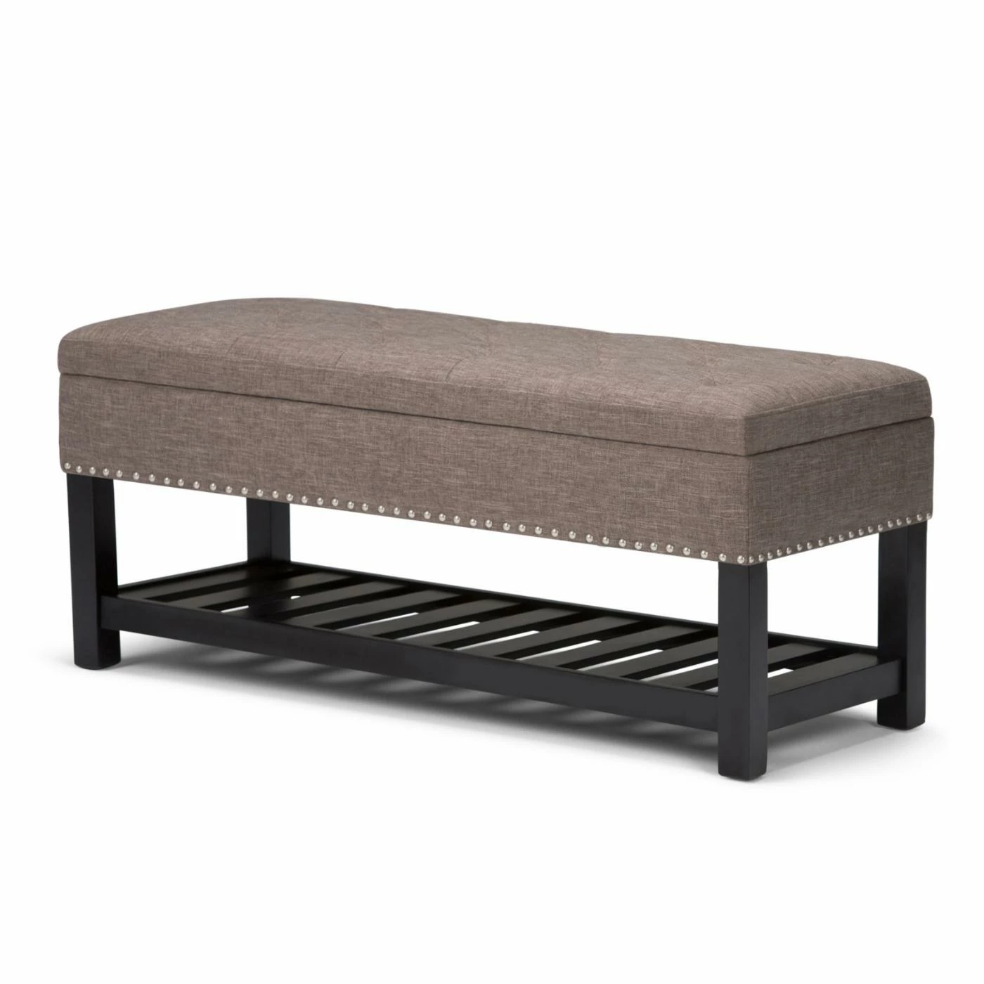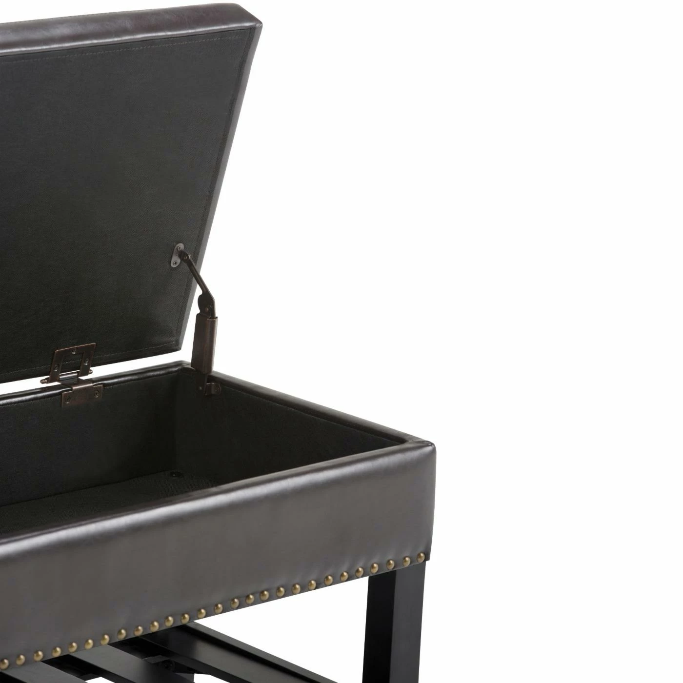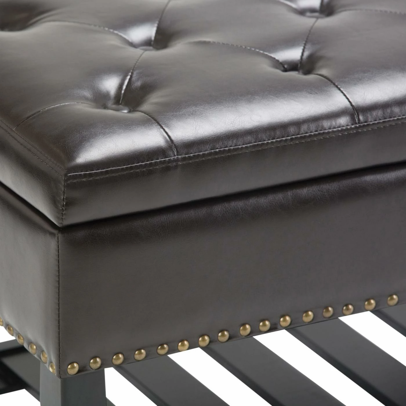 Bring a traditional touch to your living space with the Brooklyn + Max Joshua Faux Leather Storage Ottoman Bench. This tufted storage bench has a large inner compartment for plenty of storage. The lower slated shelf is perfect for shoes or blankets. It is versatile in any room in your home.