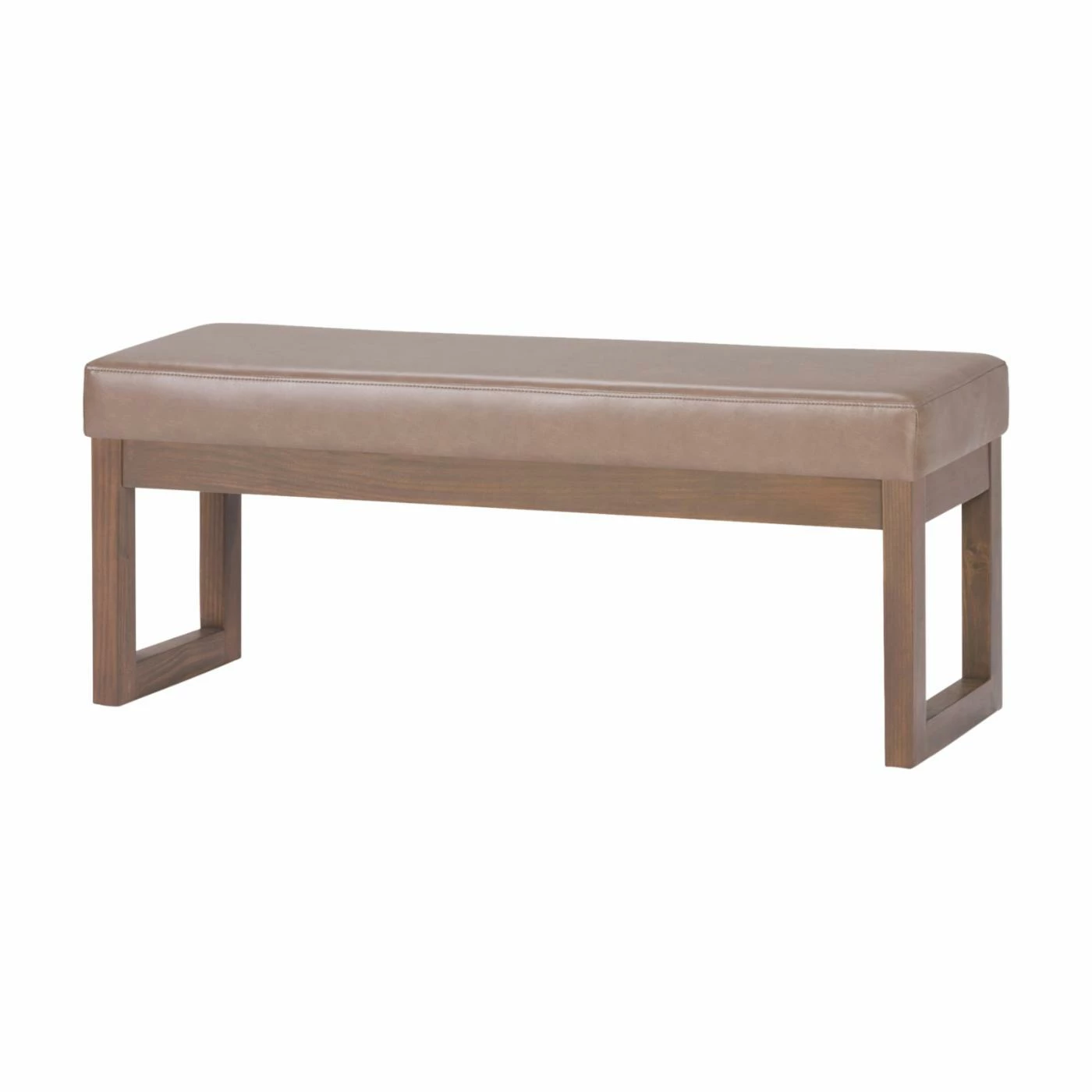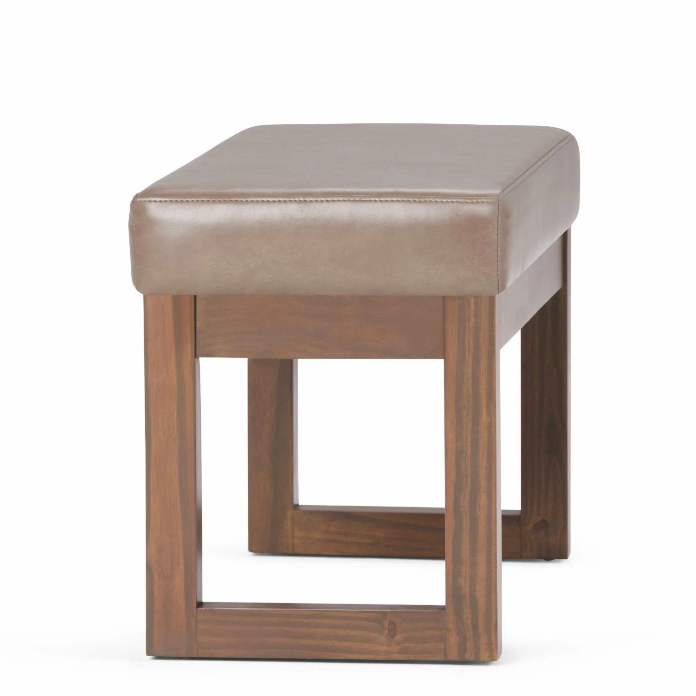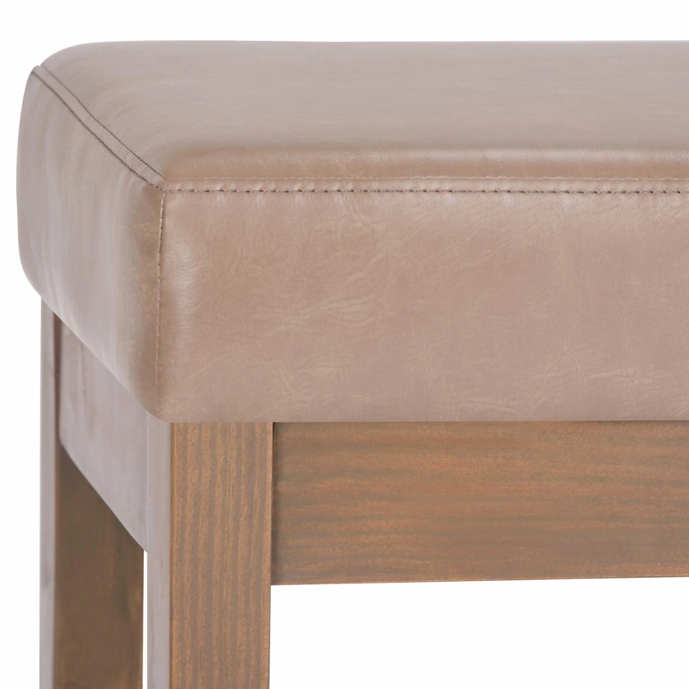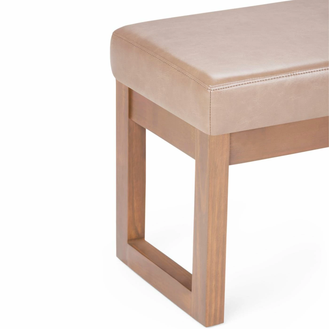 Give your living space a simple and sleek touch with the Brooklyn + Max Lewiston Faux Leather Ottoman Bench. This ottoman bench has a faux leather upholstery with an ash blonde color. The sturdy wooden frame has a unique square design.