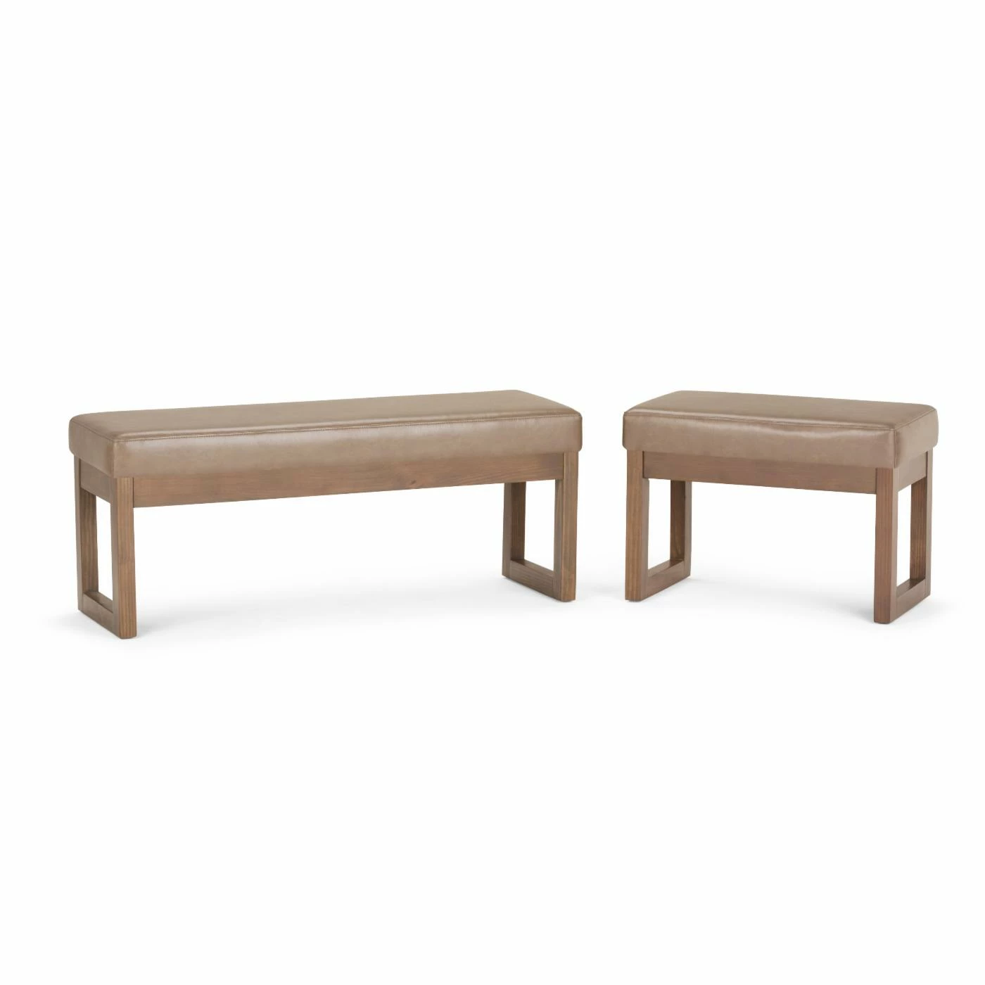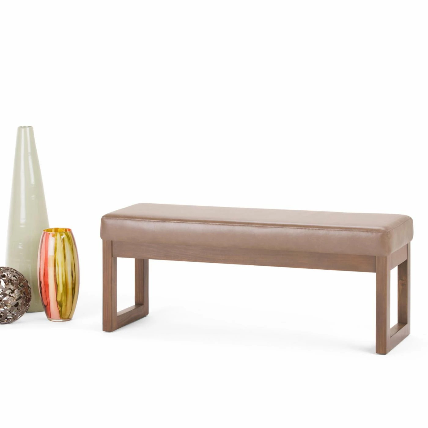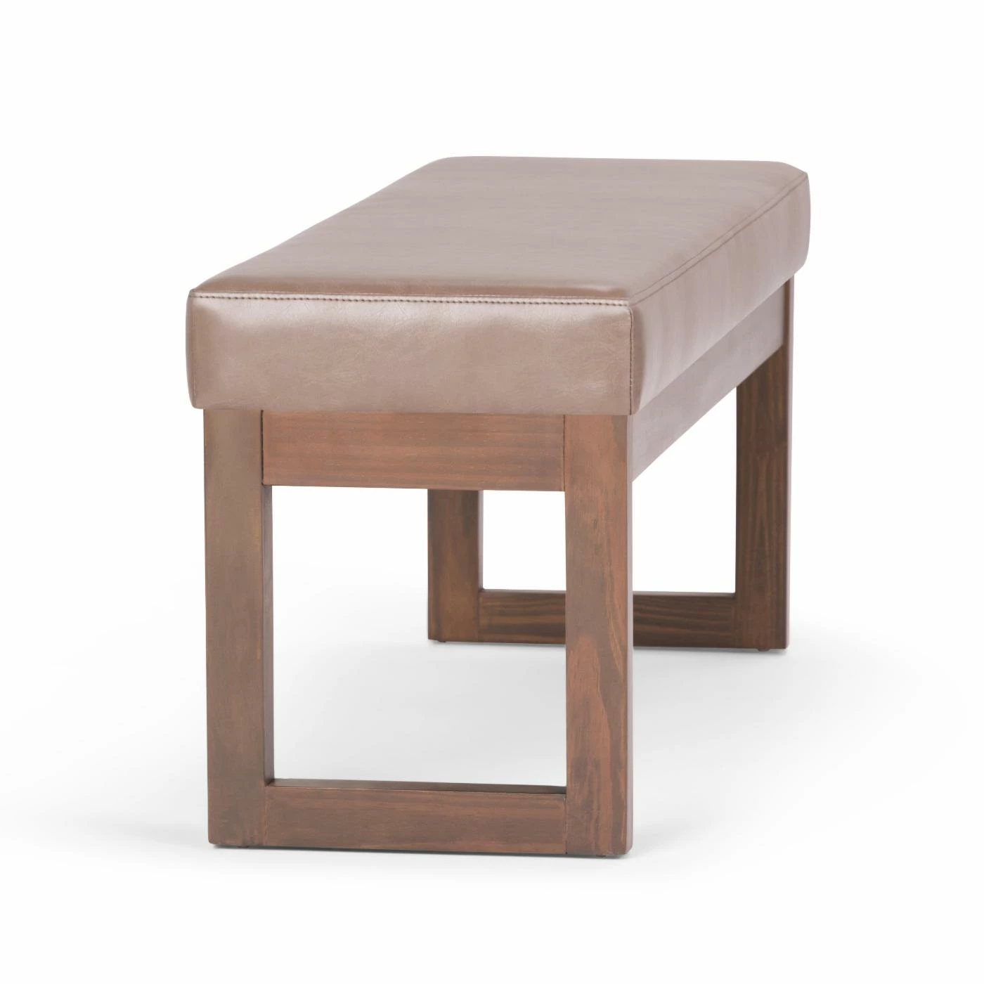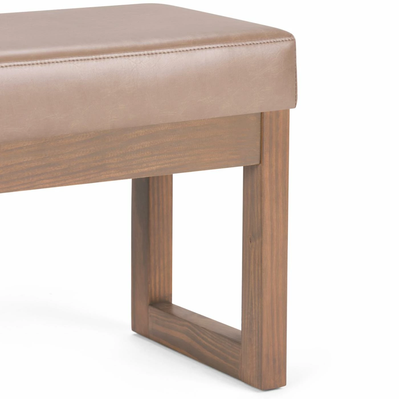 Give your living space a simple and sleek touch with the Brooklyn + Max Lewiston Faux Leather Ottoman Bench. This ottoman bench has a faux leather upholstery with an ash blonde color. The sturdy wooden frame has a unique square design.