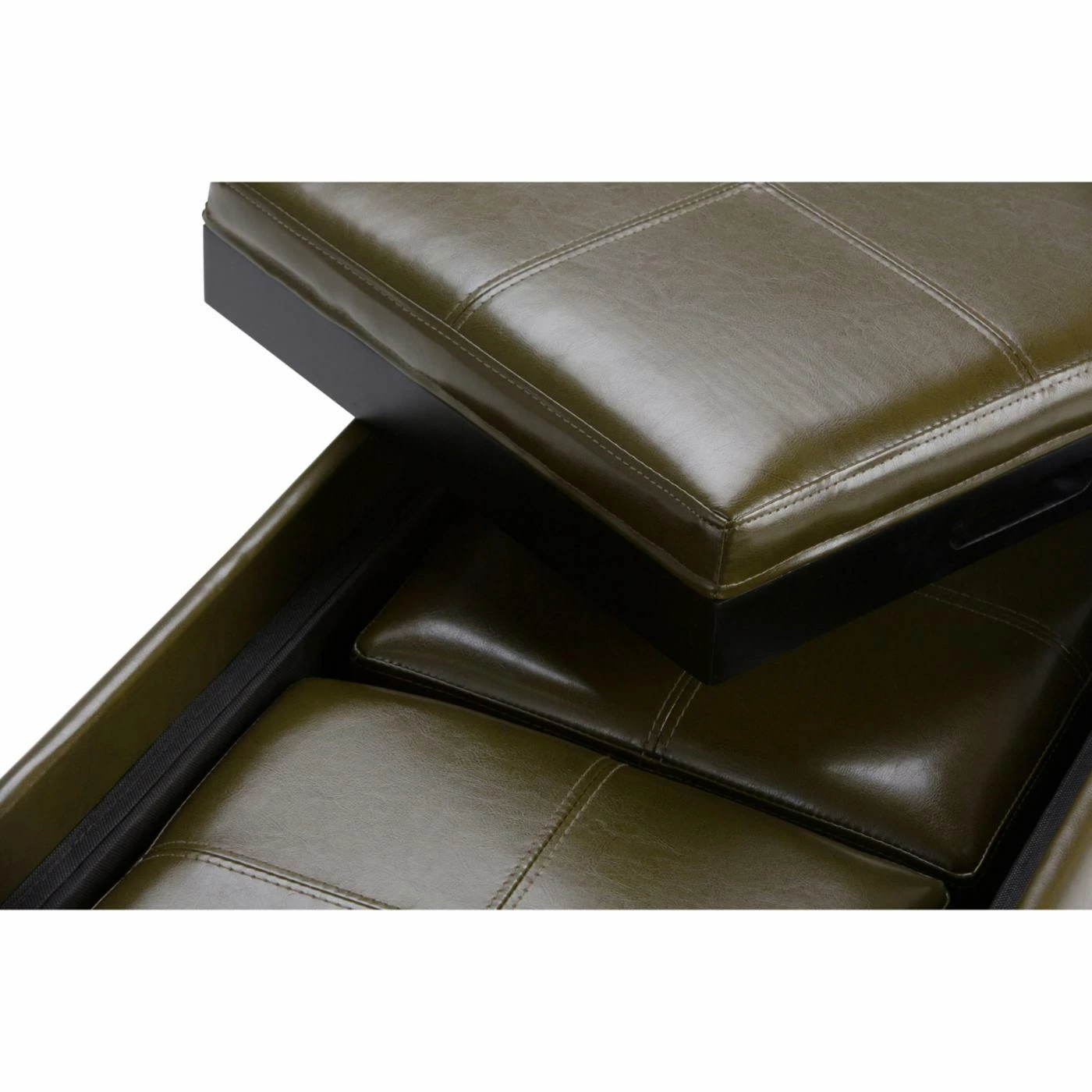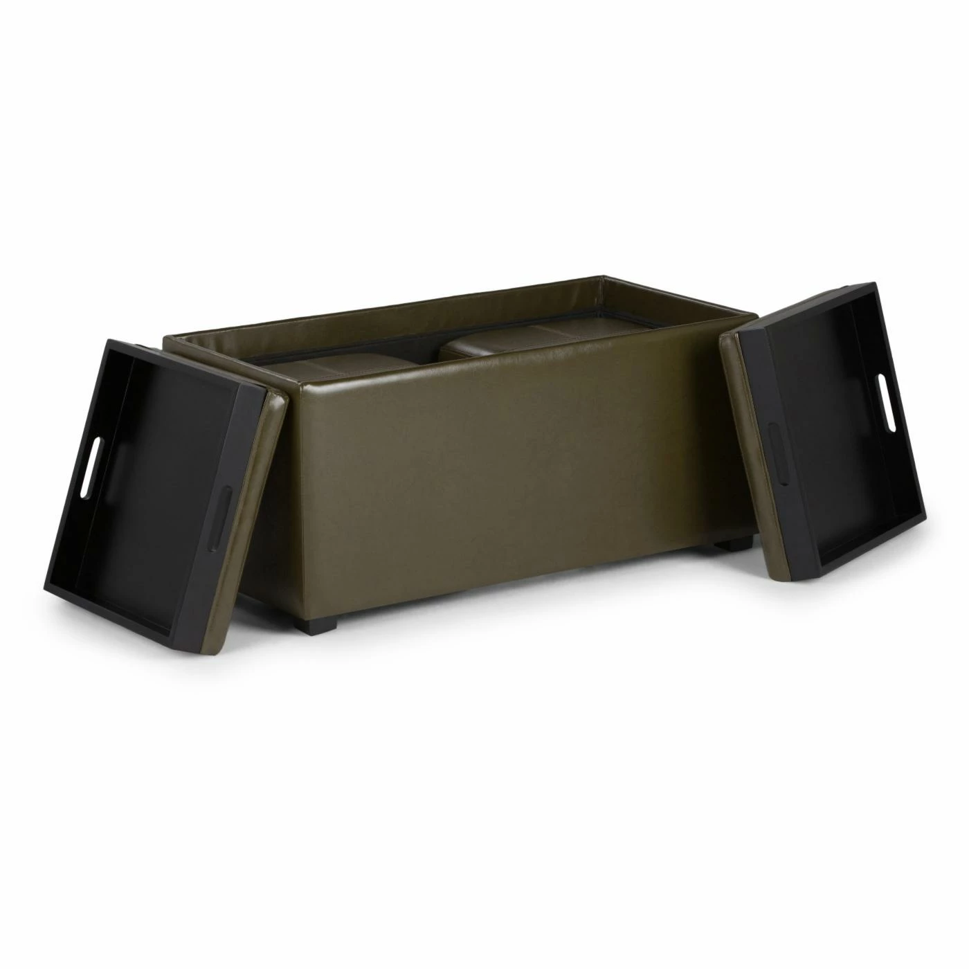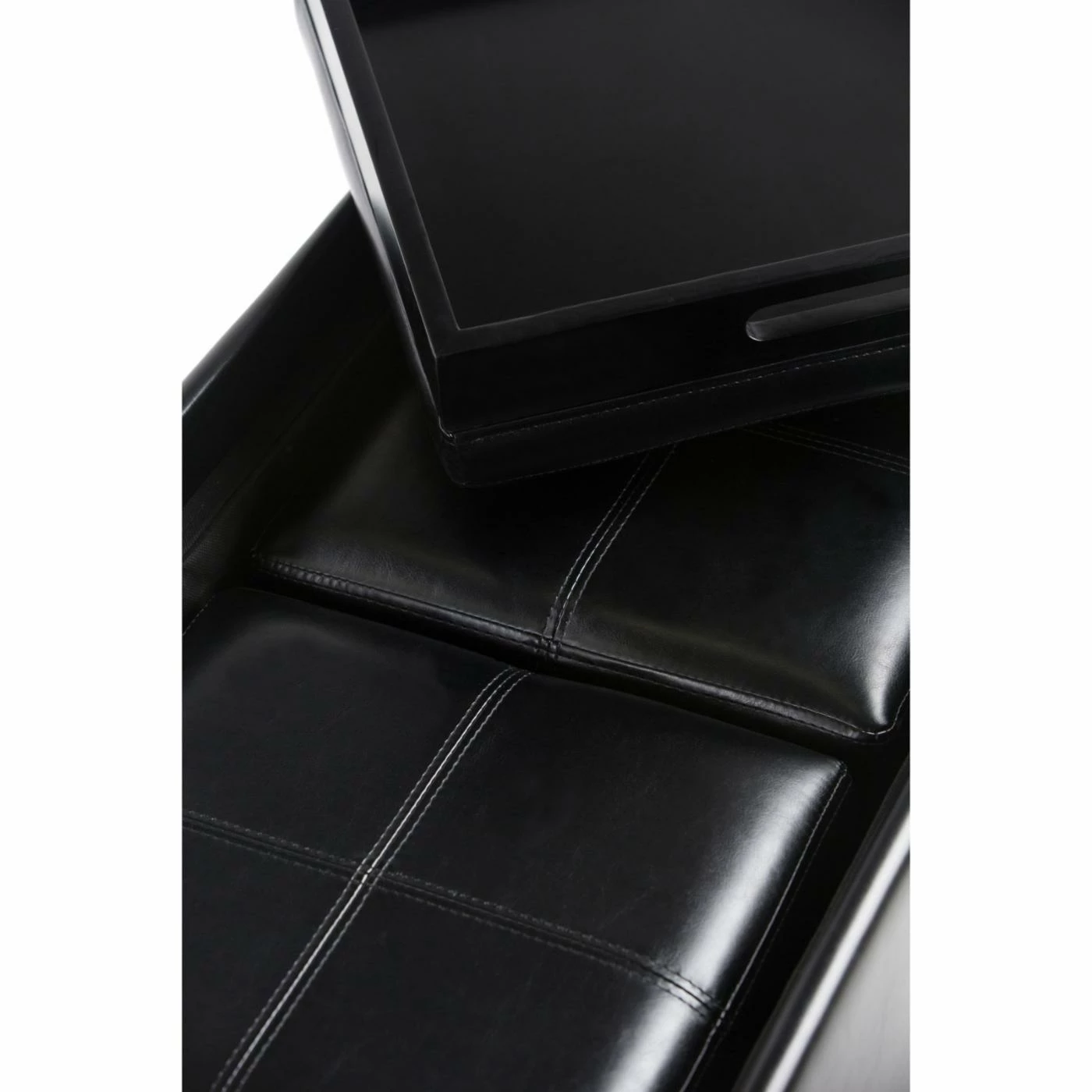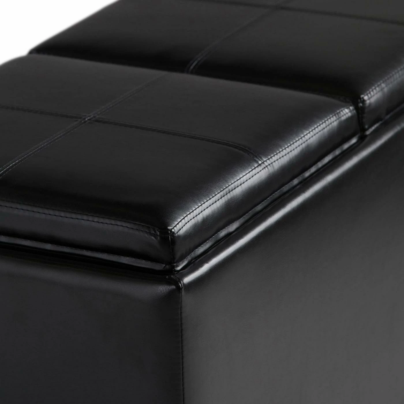 The luxurious and practical Brooklyn + Max Lincoln 5 Piece Storage Bench and Ottoman Set is fully upholstered in midnight black, premium faux leather. This set includes two square ottomans and a storage bench with two lids that flip over and may be used as serving trays.