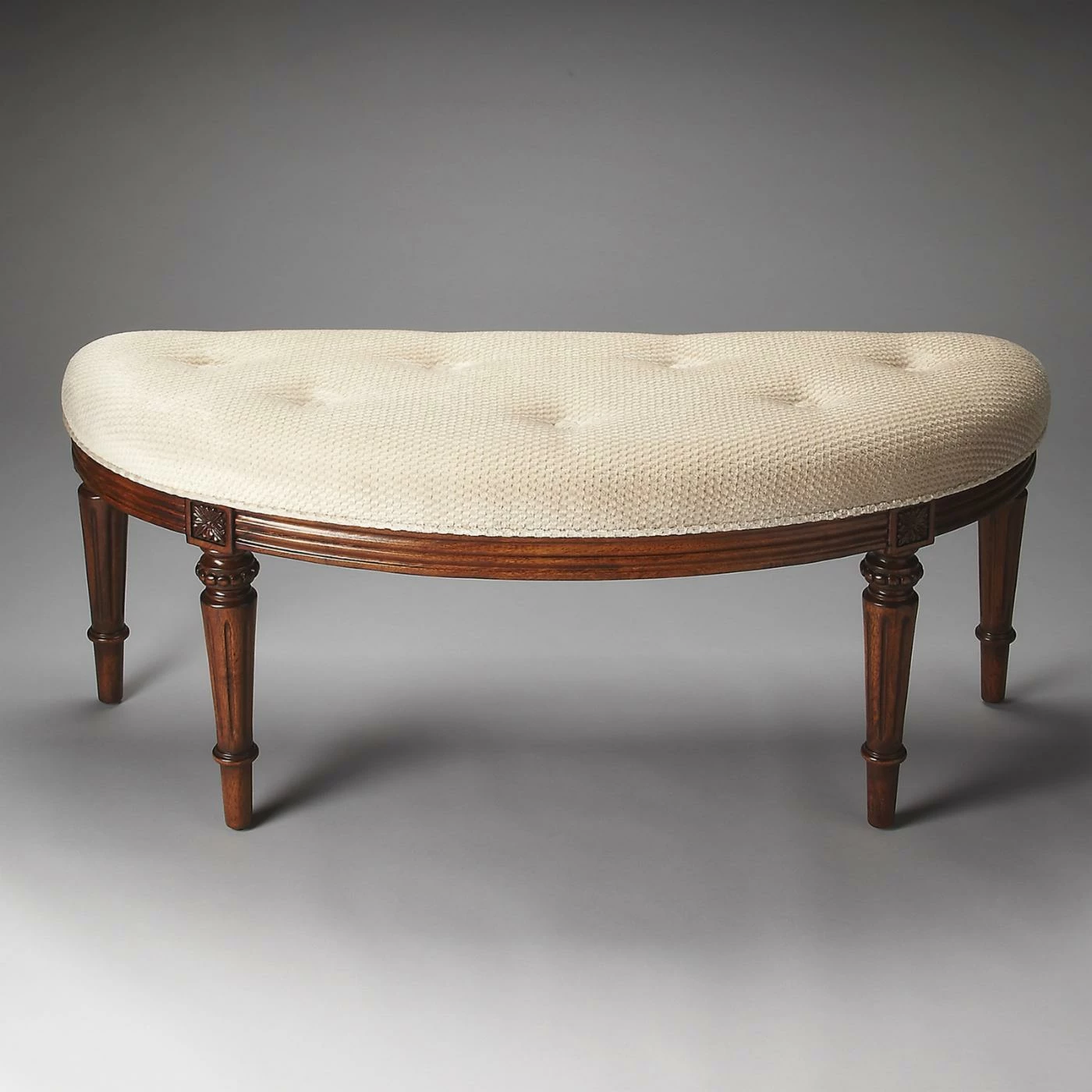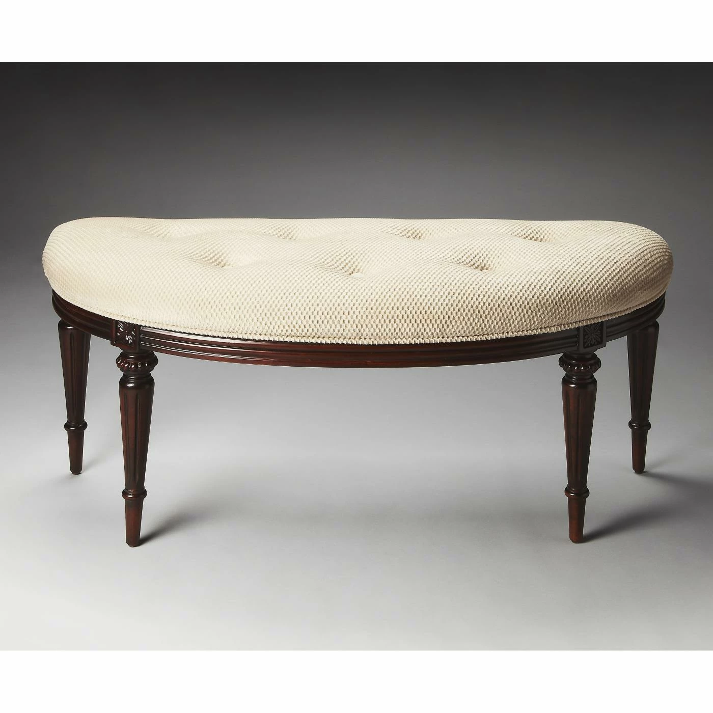The elegant demilune shape of this Butler Tamara Demilune Bench makes it perfect for vamping up your dressing room, foyer, or hall. This demilune bench features an ivory, button-tufted cotton seat with welted trim. The fluted apron and fluted, tapered legs are crafted of solid hardwoods and come in luxurious finish options.