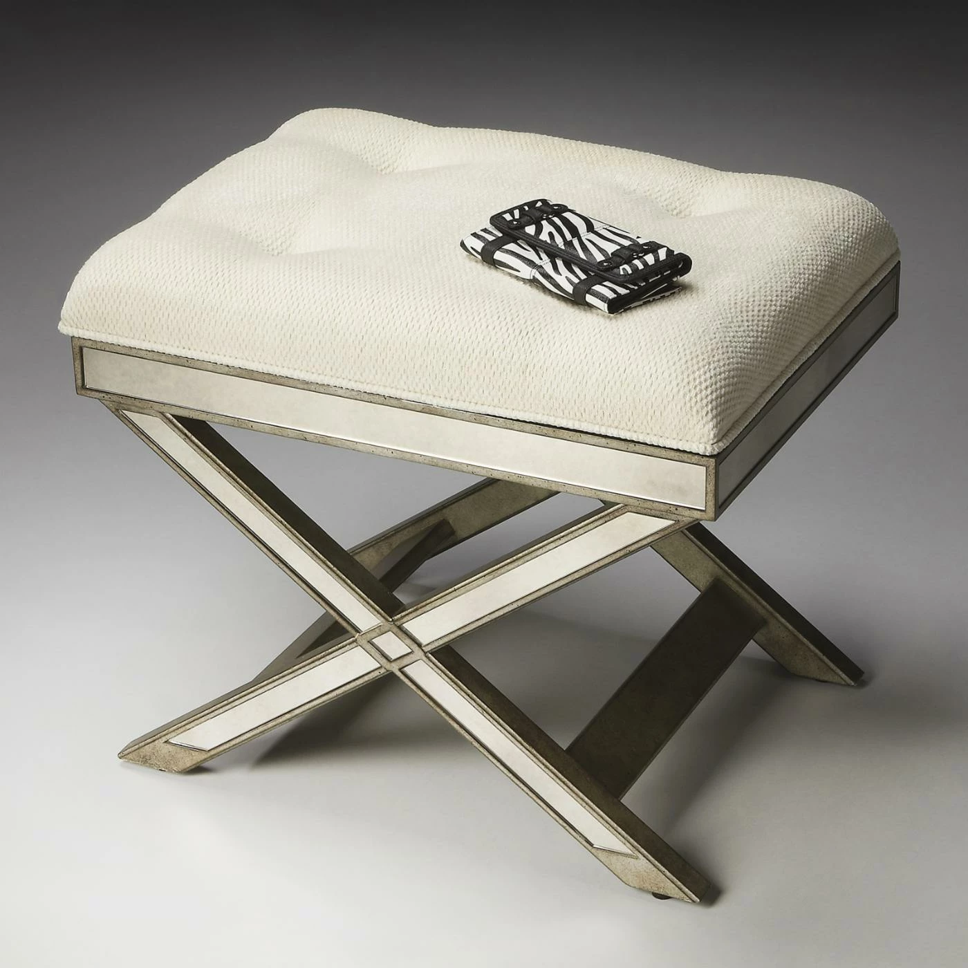 Put glamour into any space with the Butler Vanity Stool – Mirror. This stool is made from hardwood solids inlaid with antique-finished mirrors and a textured pewter finish. Its seat is upholstered in ivory button-tufted cotton. Its modern design with antique style gives it that classic celebrity look. Ready for your close up?