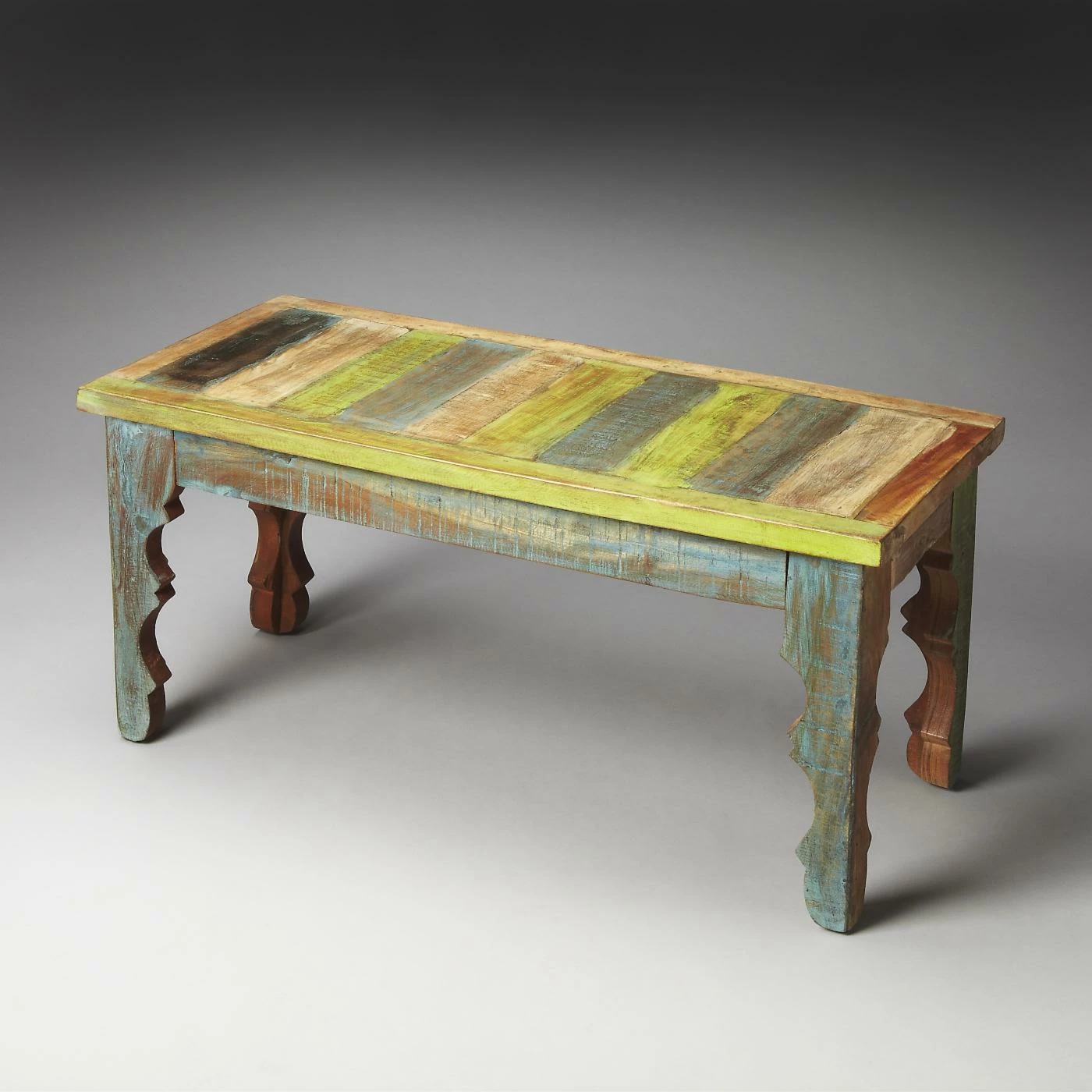 Add distressed artistry and seating to any room with this Butler RAO Painted Wood Bench. This bench is a blend of rustic charm, exotic carvings, and bold color. It’s crafted from recycled wood solids with carved legs and colorful hand-painted finish. Its generous seat offers room for two.