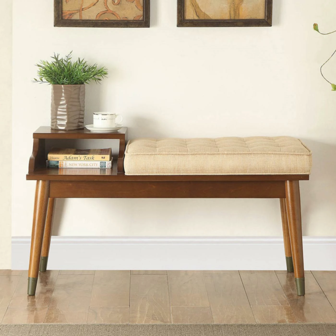 Give your home a mid-century update by decorating with the Acme Furniture Baptis Bench. This sleek bench features a padded seat and a shelf on the side for additional storage. The tapered wood legs continue the classic look of this piece.