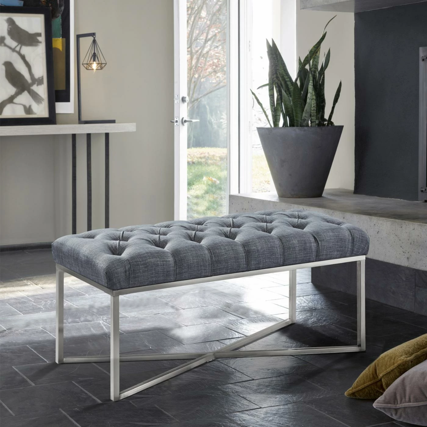 Elevate the elegance of your room by decorating with the Armen Living Noel Fabric Contemporary Bench. This long bench features a sleek, backless design. The crossing steel legs support the plush, button-tufted seat.