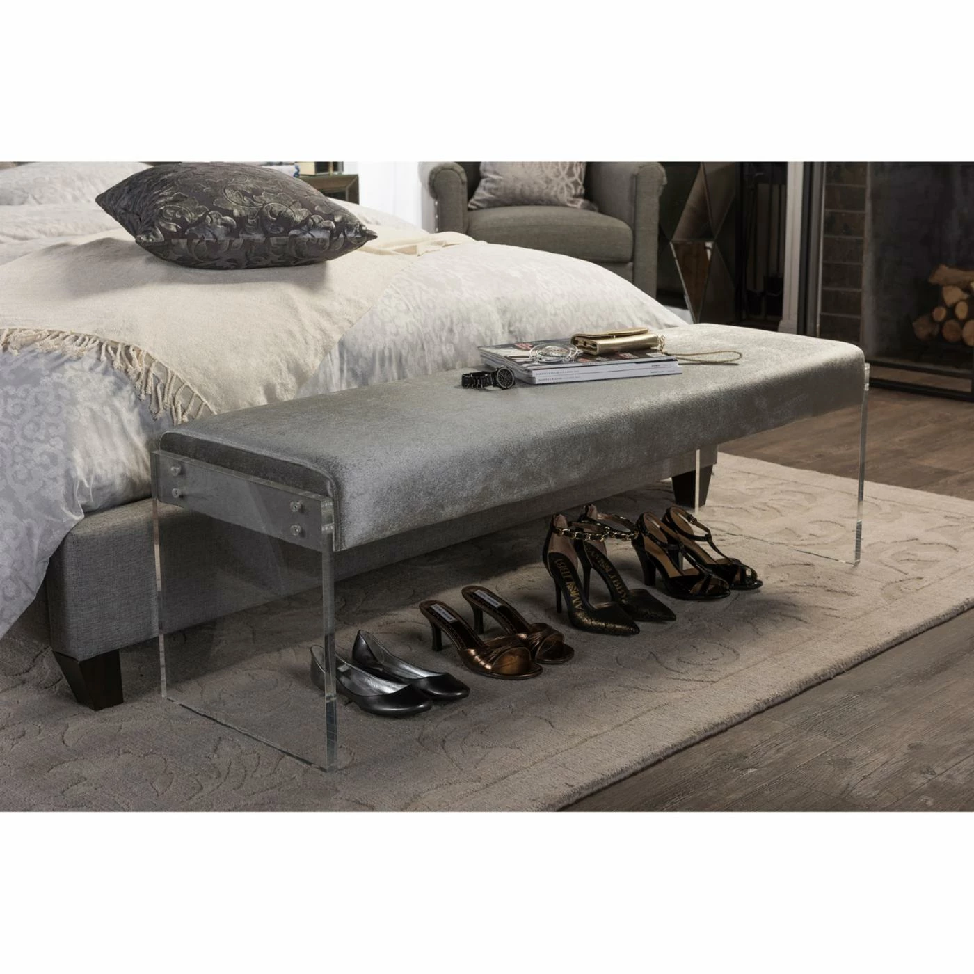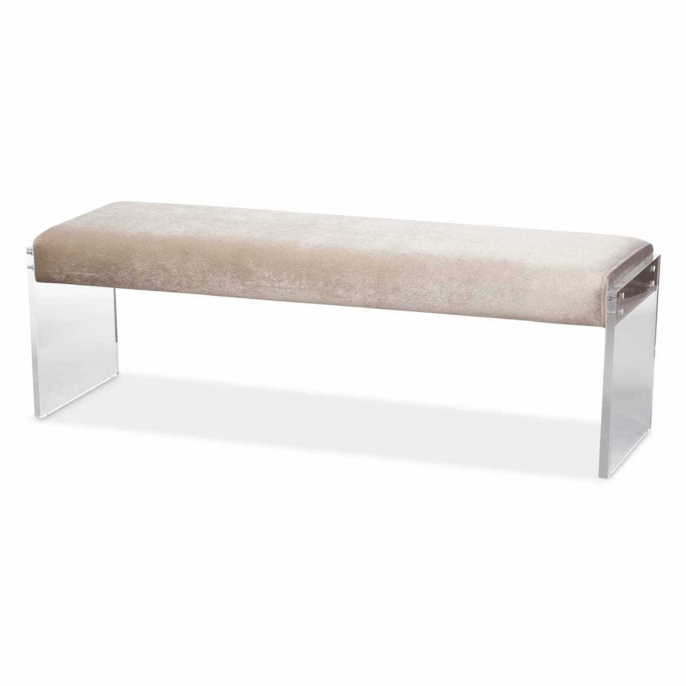 The Baxton Studio Hildon Bench features paneled acrylic legs that add a decidedly modern touch to any space in your home. This sturdy bench provides convenient additional seating, can hold up to 400 pounds, and boasts room for two adults. The high-density foam cushion provides support and comfort, and it comes in neutral hues that coordinate well with many décor styles. Enjoy the convenience of a micro suede fabric that’s easy to clean. Add this bench to the foot of your bed, your living room for additional seating, or even a commercial space for both function and style.