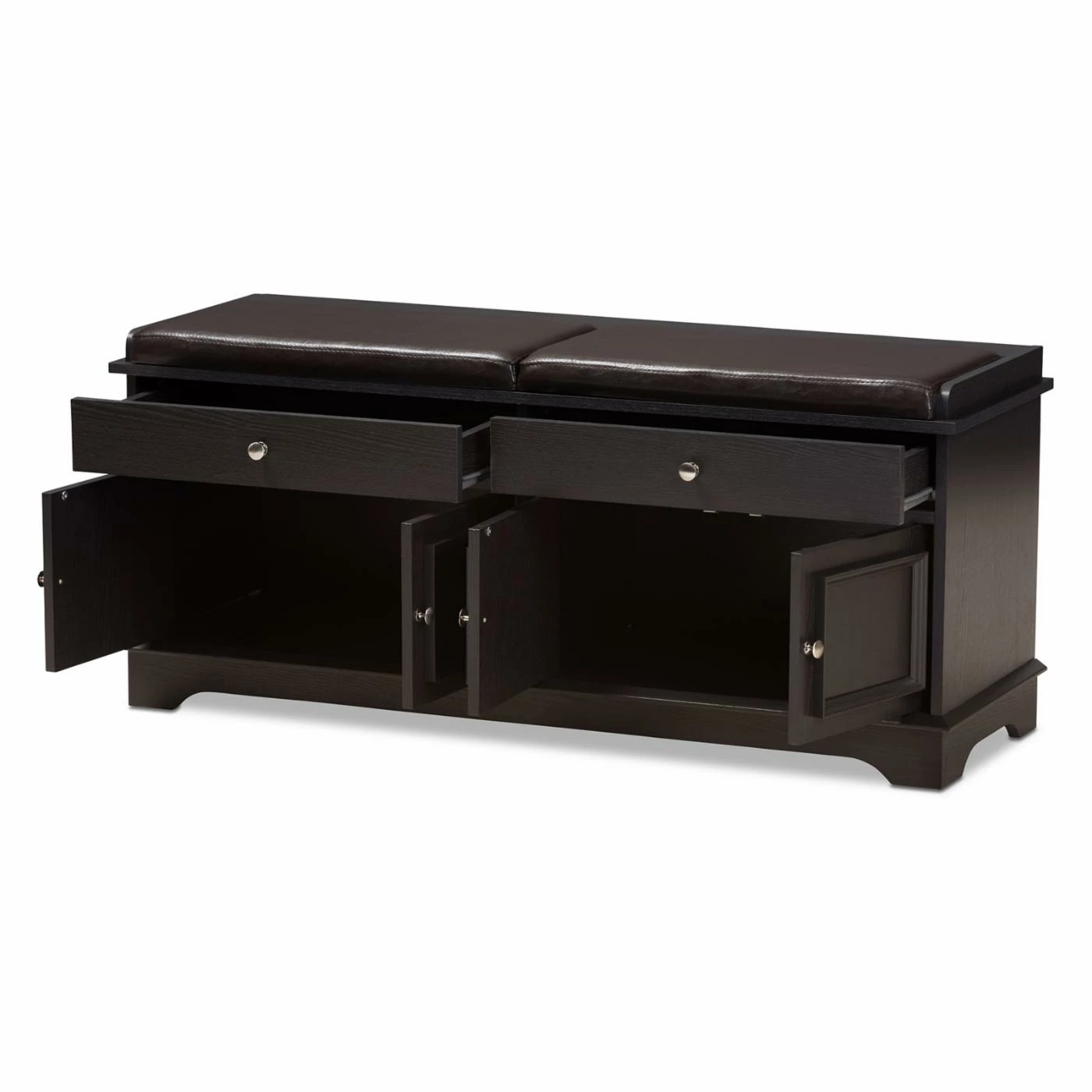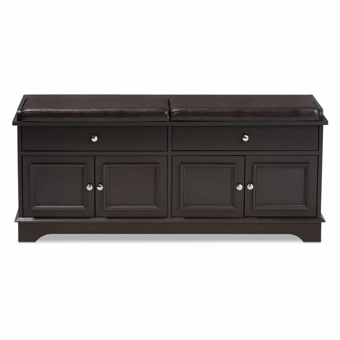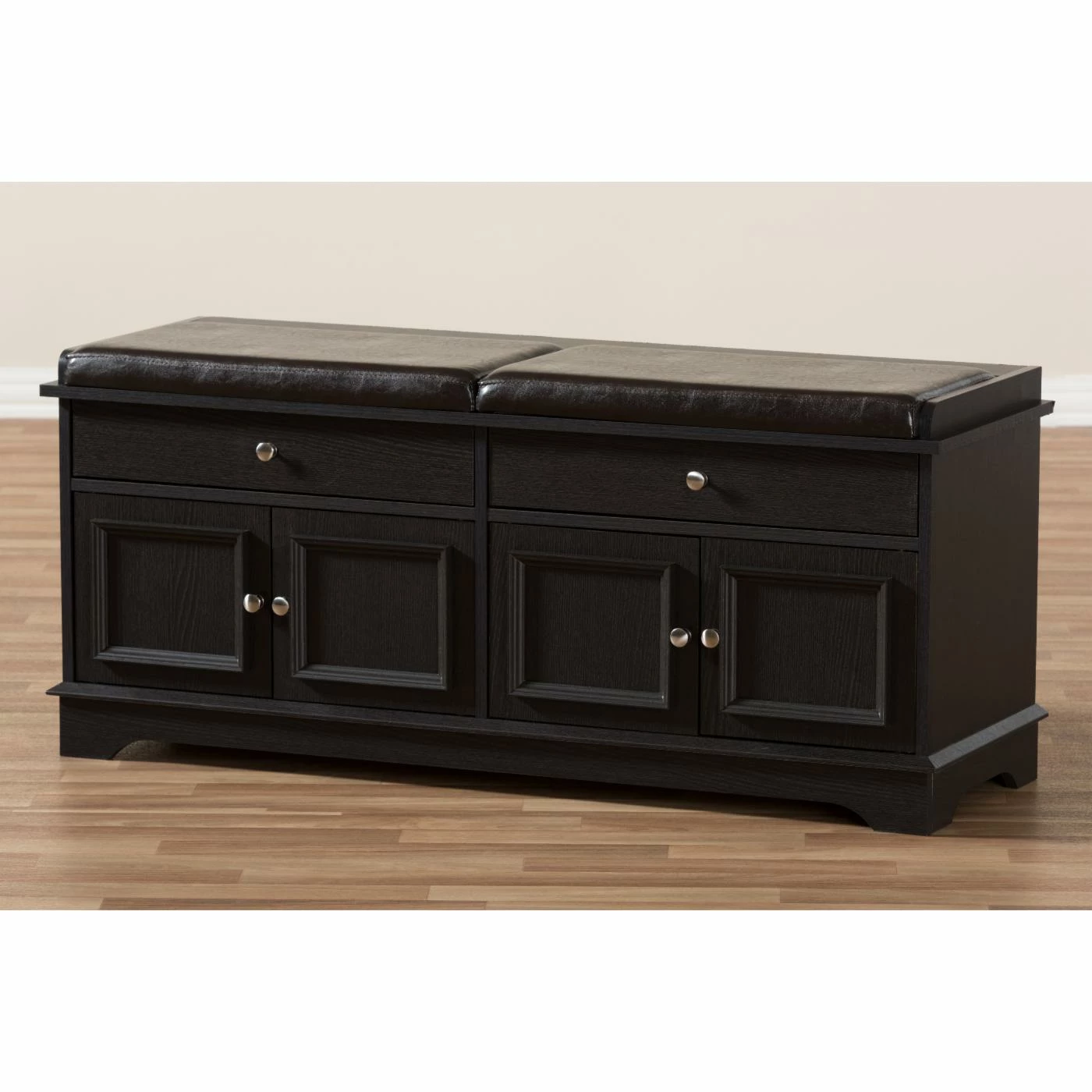 Pro tip: Fake an entryway in an apartment or loft with a couple of vintage-inspired wall hooks and the Baxton Studio Mason 2-Drawer Shoe Storage Bench below. Crafted with durable, warp-resistant engineered wood finished in a deep brown shade, this multifunctional storage bench boasts two slim storage drawers atop four doors that open to two low-lying shoe storage spaces. Picture-frame molding surrounds each door, and round brushed silver knobs glint throughout. On top, padded brown faux leather upholstery makes a comfortable perch for putting shoes back on before heading out. Assembly is required, and a 30-day manufacturerโs warranty is included.