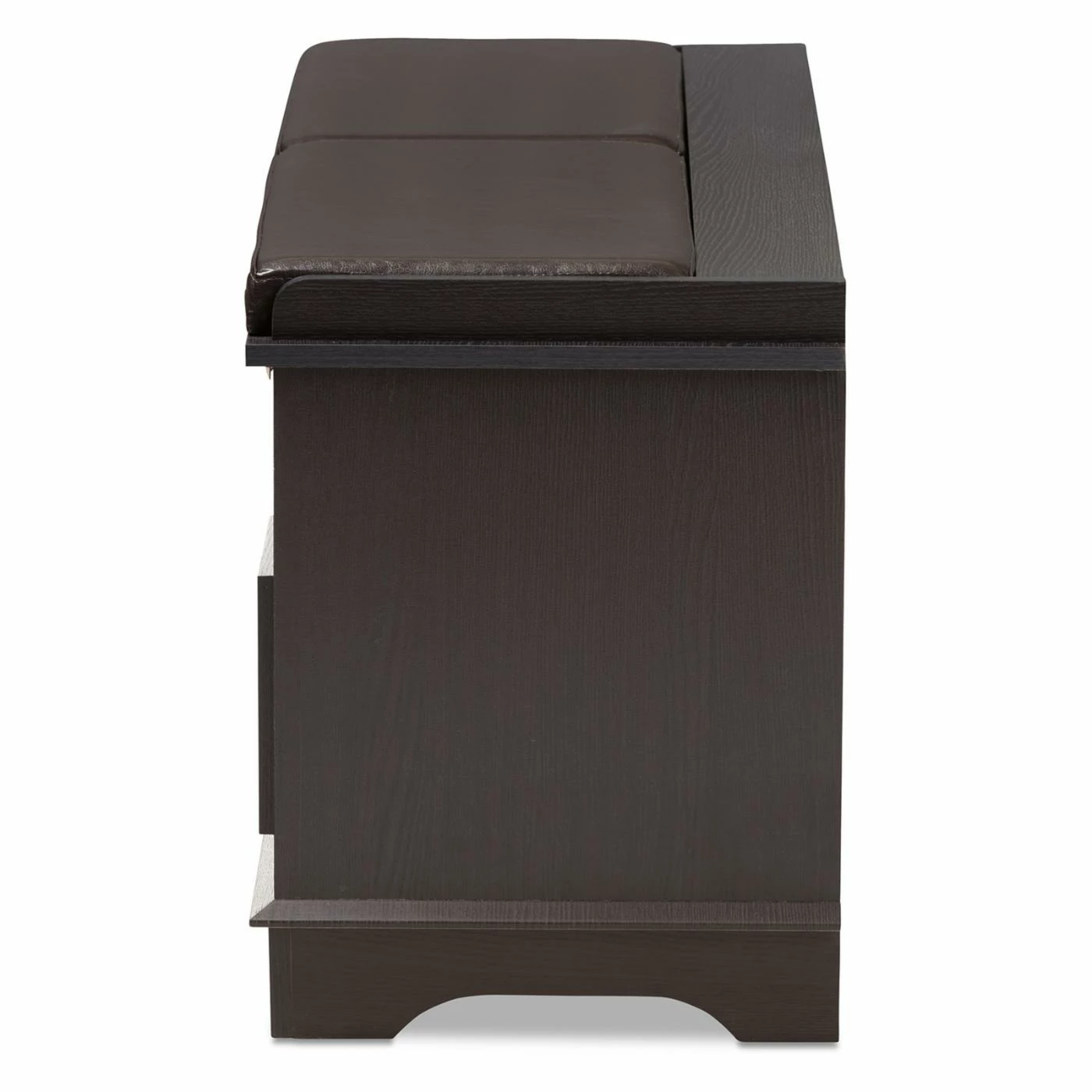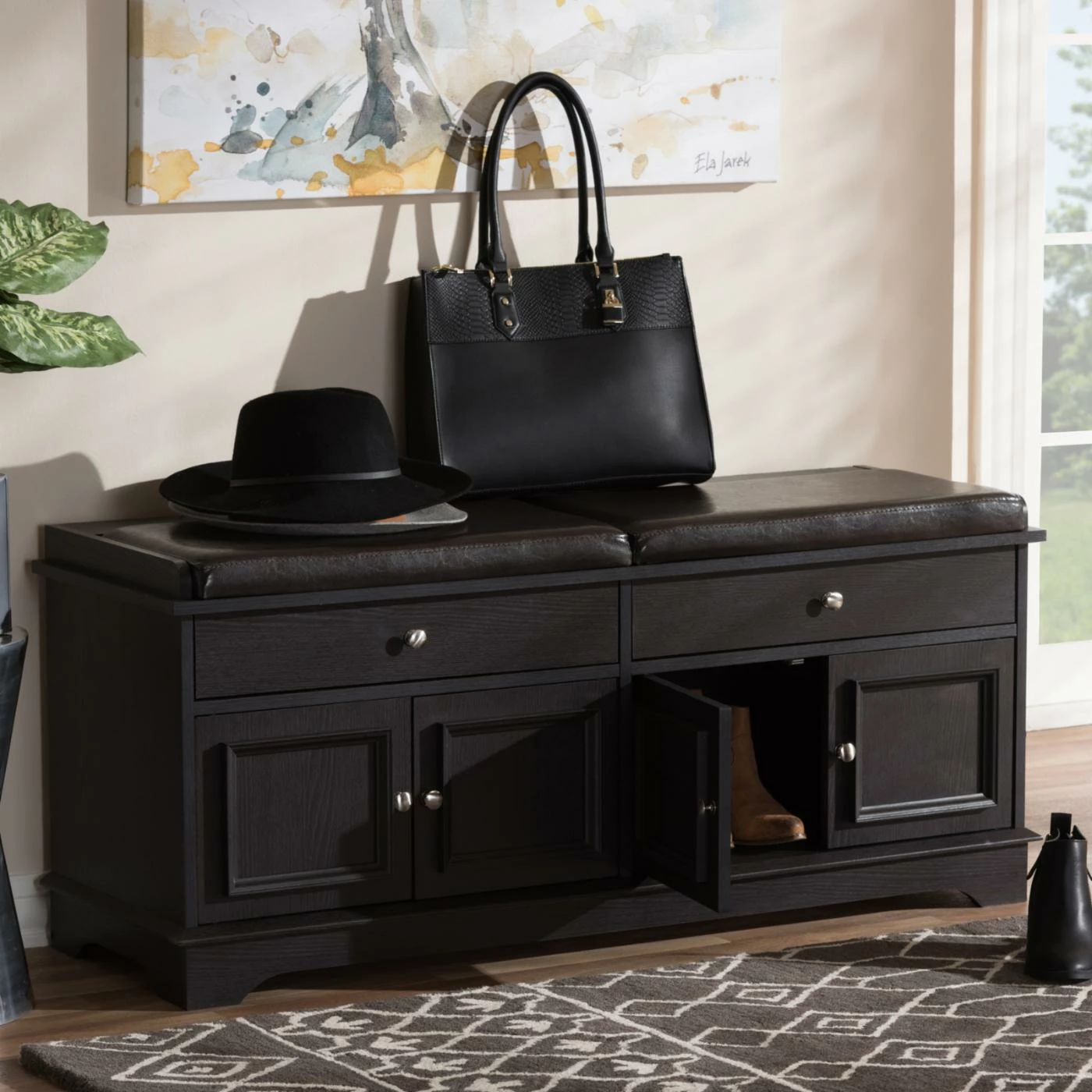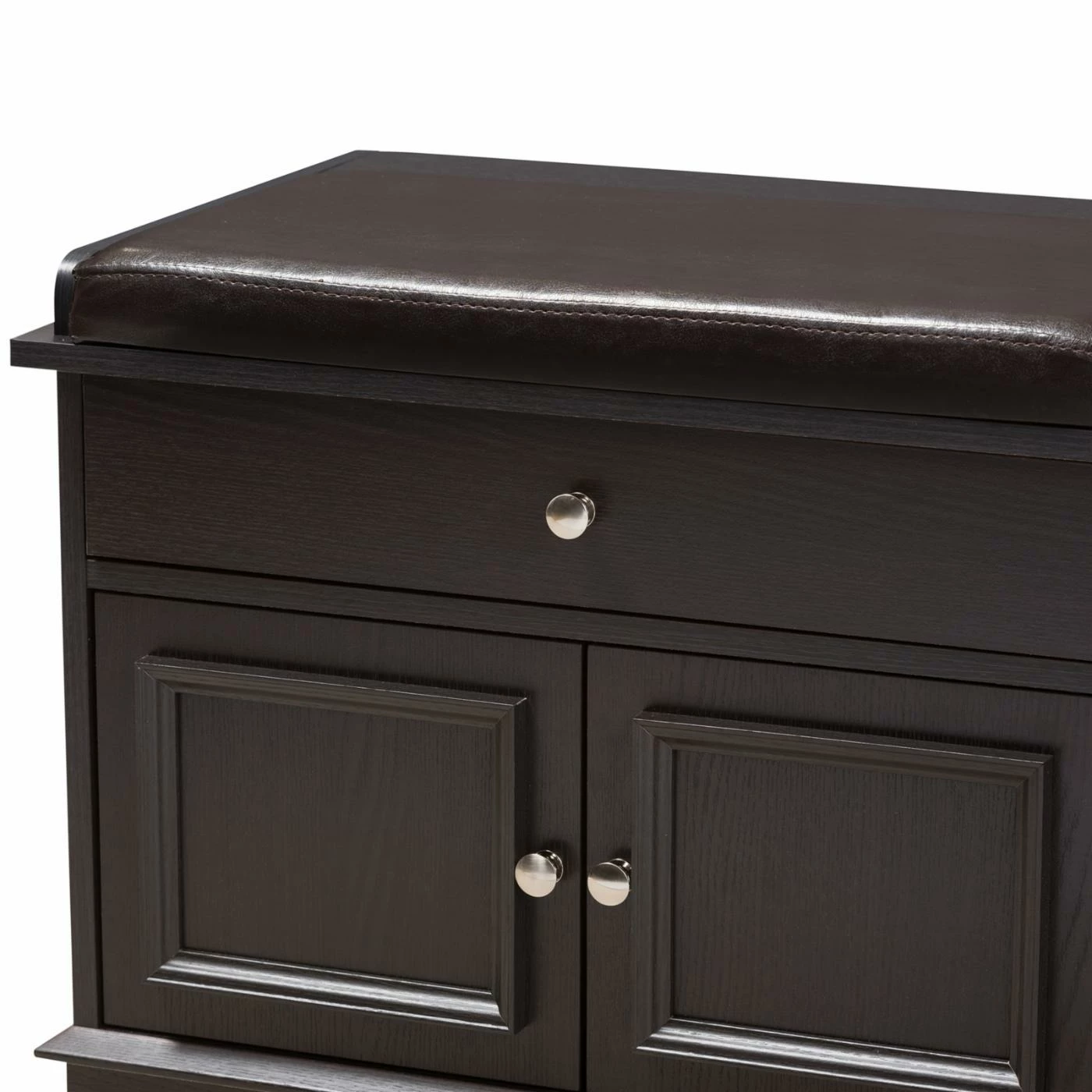 Pro tip: Fake an entryway in an apartment or loft with a couple of vintage-inspired wall hooks and the Baxton Studio Mason 2-Drawer Shoe Storage Bench below. Crafted with durable, warp-resistant engineered wood finished in a deep brown shade, this multifunctional storage bench boasts two slim storage drawers atop four doors that open to two low-lying shoe storage spaces. Picture-frame molding surrounds each door, and round brushed silver knobs glint throughout. On top, padded brown faux leather upholstery makes a comfortable perch for putting shoes back on before heading out. Assembly is required, and a 30-day manufacturerโs warranty is included.
