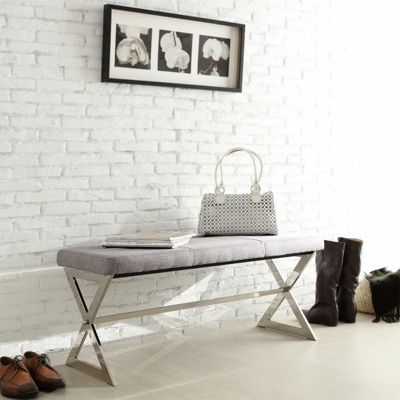 Sweet and simple, the Chelsea Lane 40 in. X-Base Gray Linen Bench brings a modern touch to your home. Featuring a seat that is comfortably padded, this bench features complementing gray linen upholstery. Its chrome metal base showcases a trestle x-design that lends style to your home. A versatile piece ideal for regular seating within any room or as an occasional perch in a hallway or entryway.