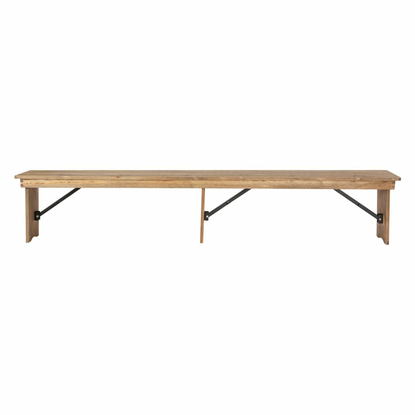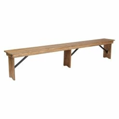 The Flash Furniture Hercules Folding Farm Bench boasts a rustic aesthetic for stripped-down charm. It boasts engineered wood craftsmanship for enduring use. Metal pins rest under the seat of this bench for extra support. The legs of this bench are foldable for convenient storage and transport.