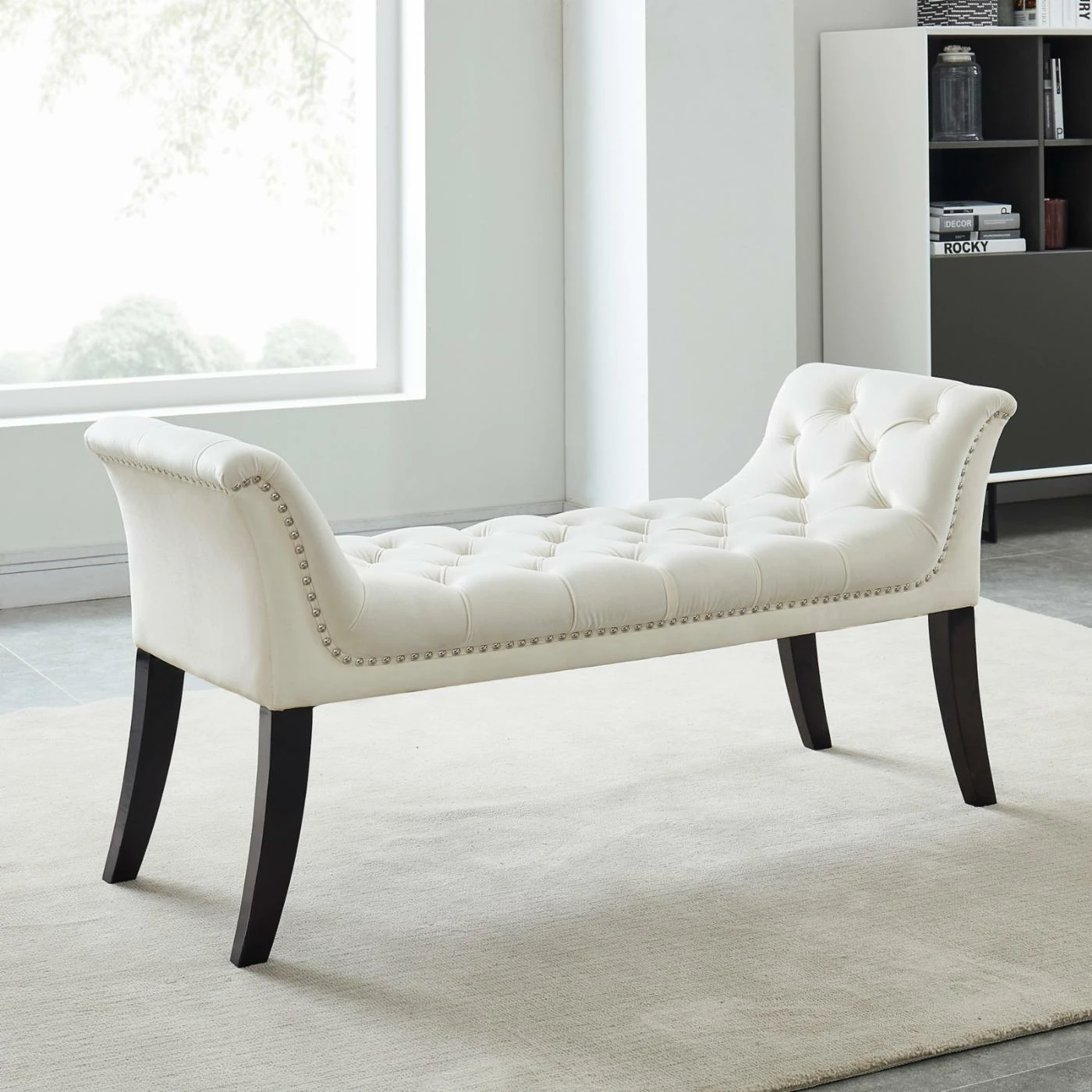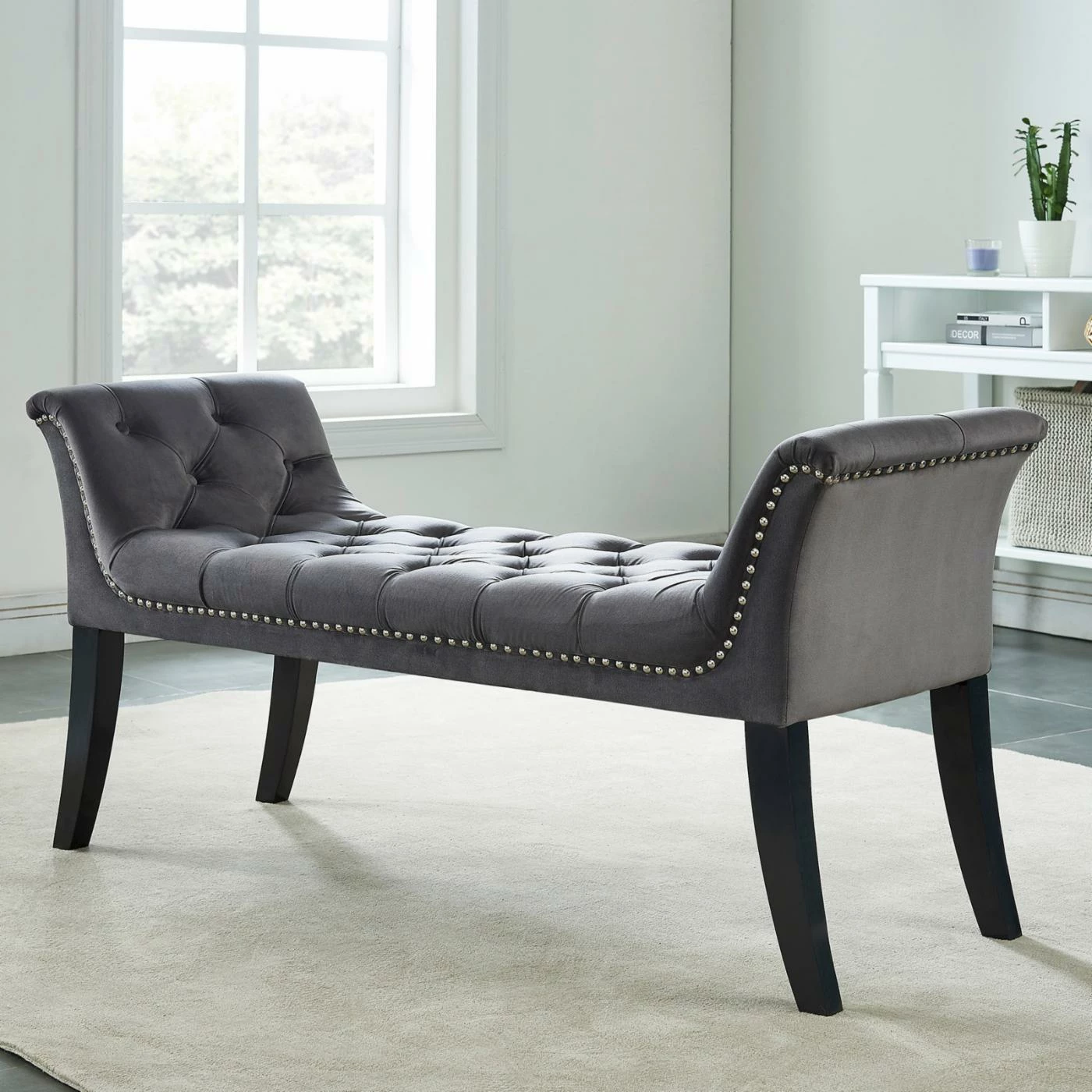 Create a simply luxurious seating area anywhere in your home with the !nspire Velvet Tufted Studded Bench. This backless bench features a sloped side design for a glamorous effect. Nailhead trim details and button tufted construction enhance the luxe look of the velvet upholstery.