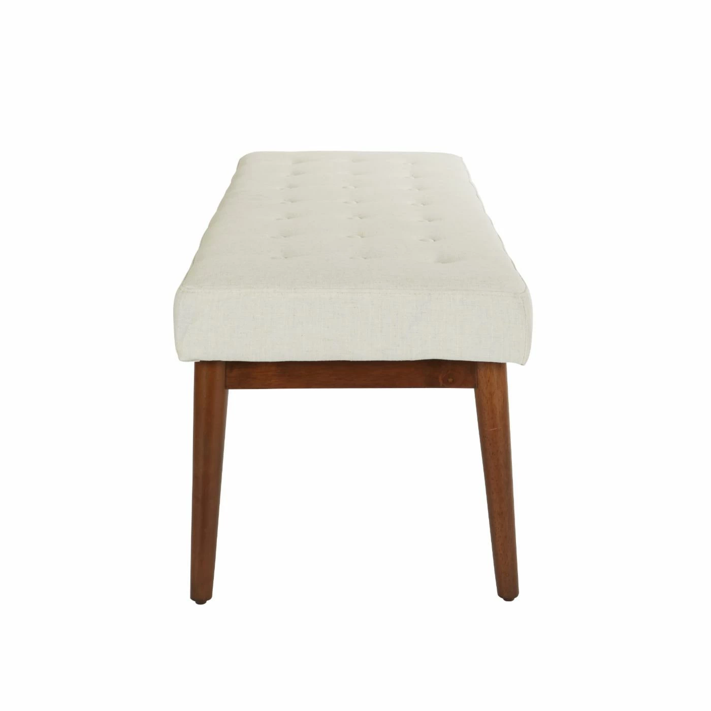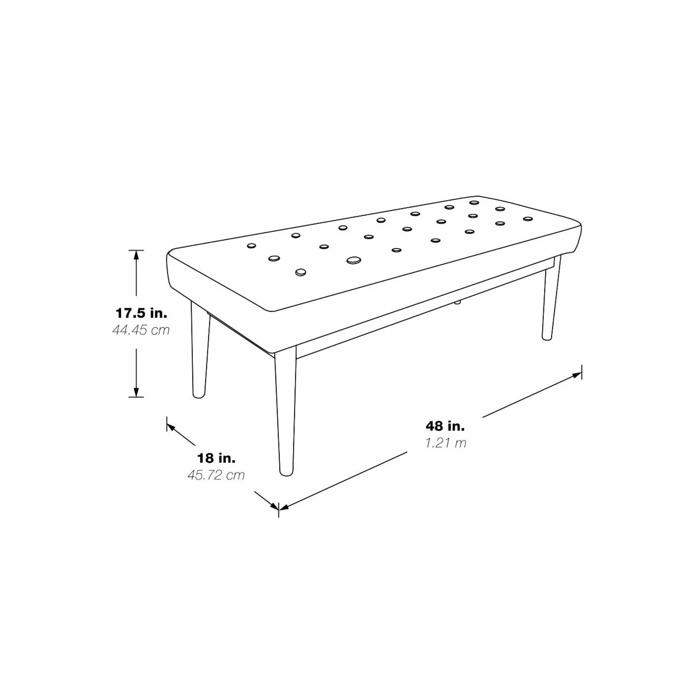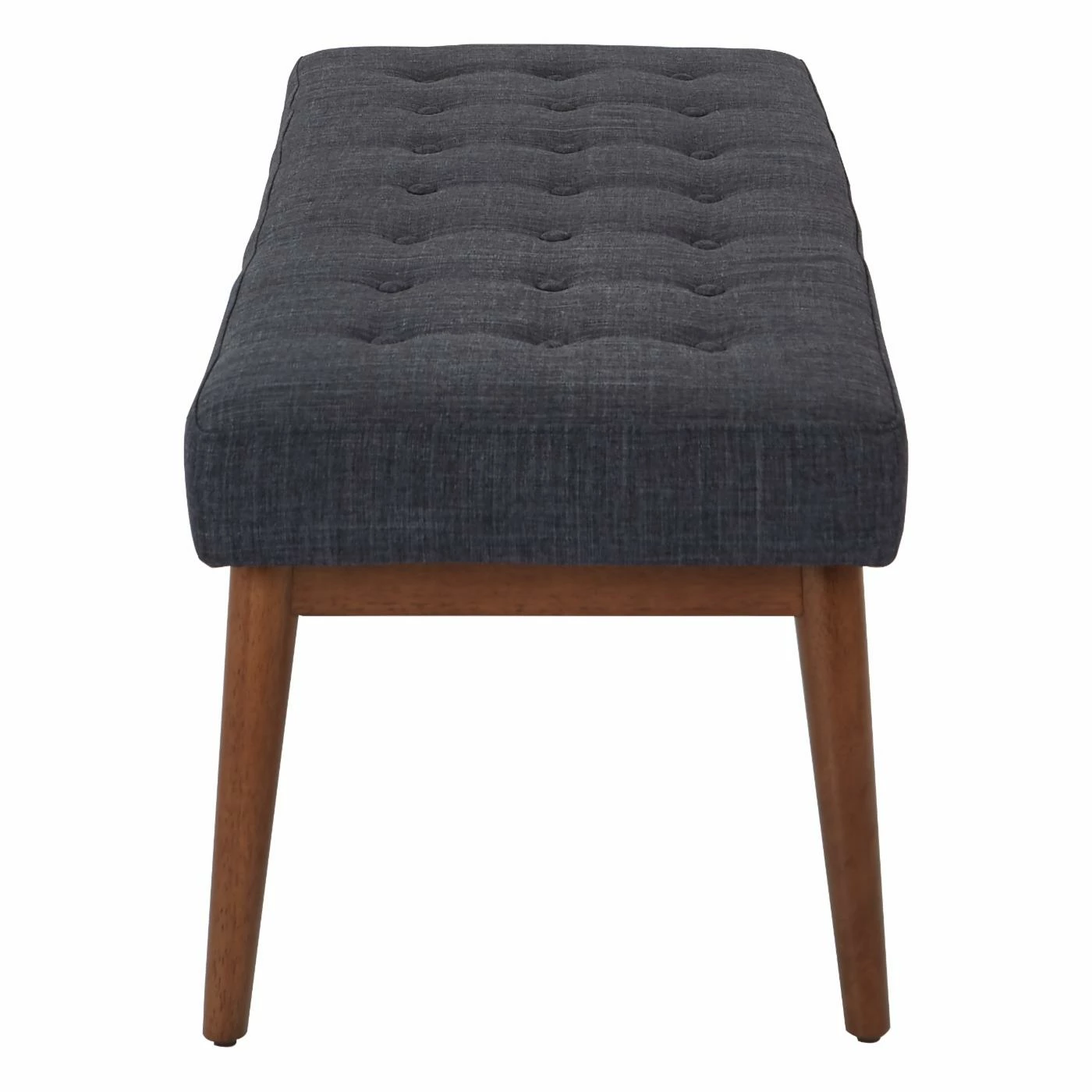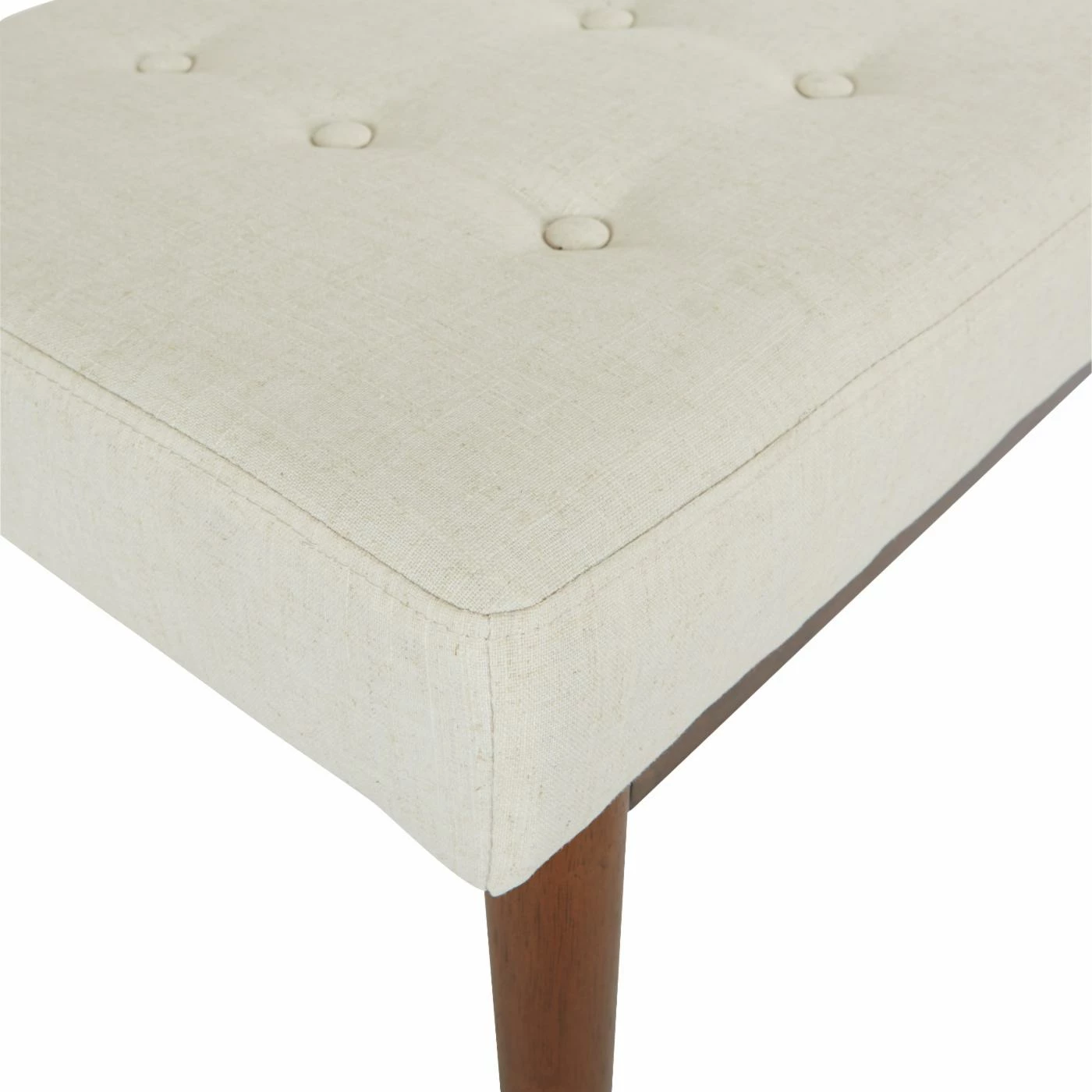 With mid-century-modern style and of-today appeal, the OSP Home Furnishings West Park Bench aptly serves as an accent piece and offers extra seating all in one. Featuring a solid wood frame and angled, tapered legs finished in rich coffee, this bench delivers lasting durability and support. The thickly padded, button-tufted seat provides plush comfort and is upholstered in easy-care polyester fabric in your choice of available colors. Add a touch of charm to your entryway space or create a cozy window sitting nook with this vintage-inspired bench.