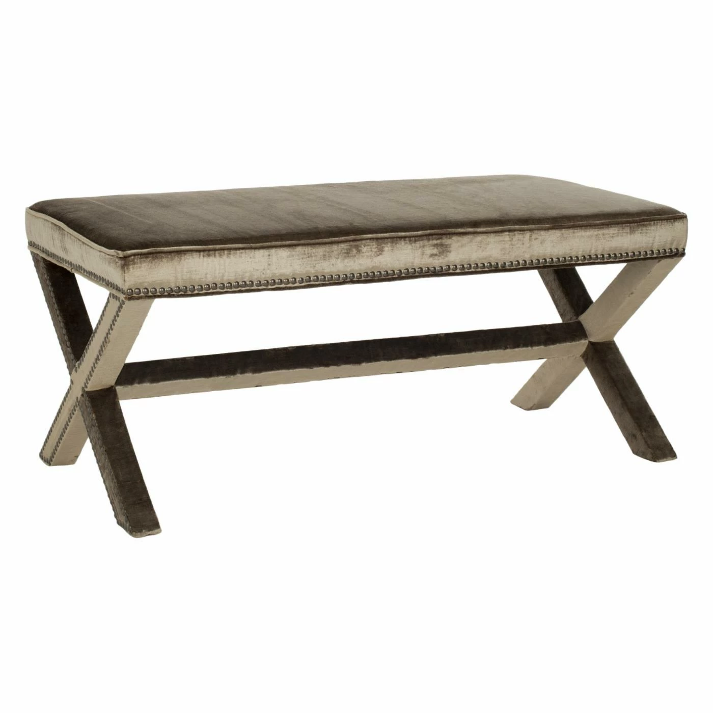 Completely covered in soft cotton and viscose blended fabric, the Safavieh Melanie Extended Bench brings a glamorous feel to any space. This luxurious bench is presented in a rich antique sage color and boasts a modern x-shaped frame. Brass nailhead trim complements its warm and inviting hue and gives it a hint of texture and shine.