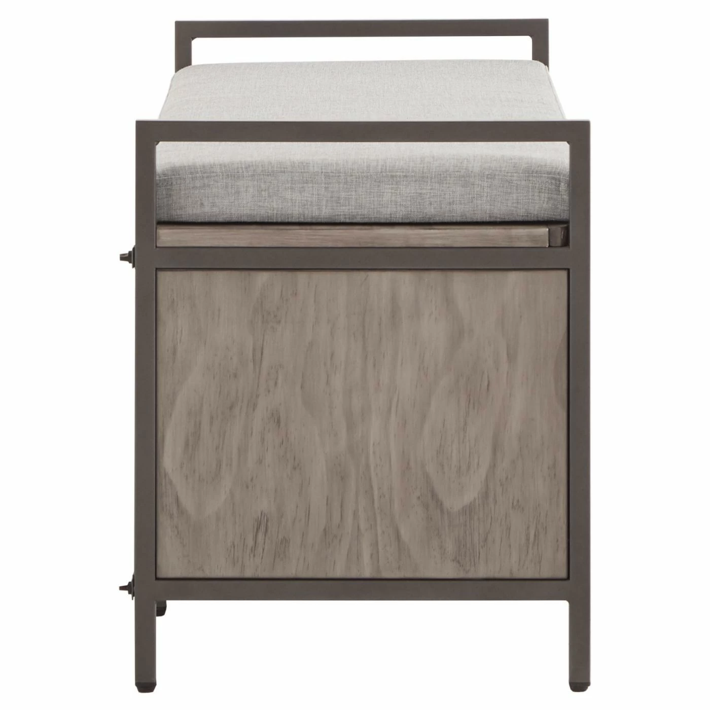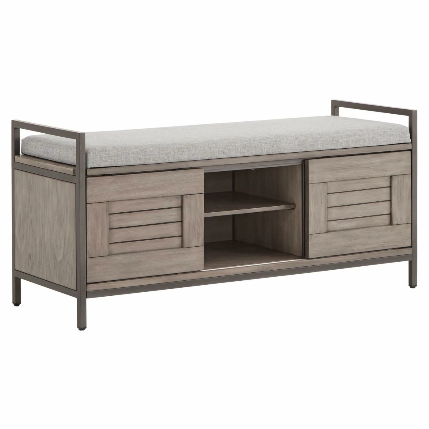 Make coming home from a long day an easier transition with the Weston Home Arron Storage Bench with Cushion. This wide bench has a cushioned top and built-in storage that makes an ideal spot to slip off your shoes after a long day at the office or lace up your boots before going out. The bench’s frame is built from squared metal with a powder-coated black finished and engineered wood with rustic gray pine veneers. Lush gray linen upholsters the comfortable bench-top. Three cabinets are incorporated into the base, each featuring adjustable shelves for all your shoes. Two sliding louvered doors let you keep the contents concealed as you desire.